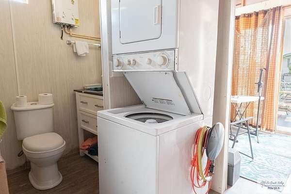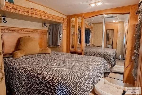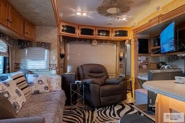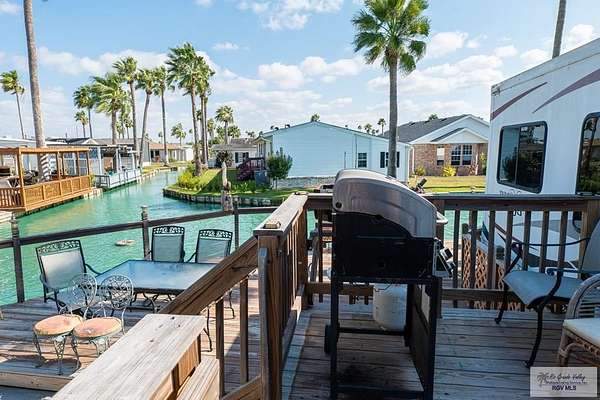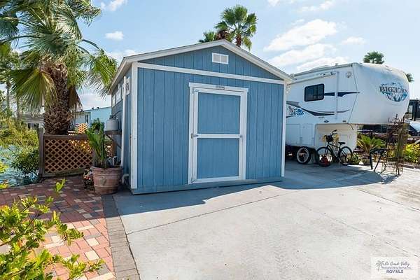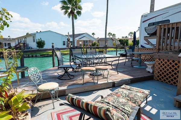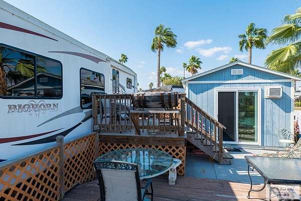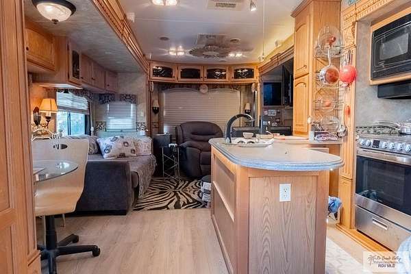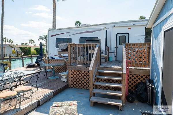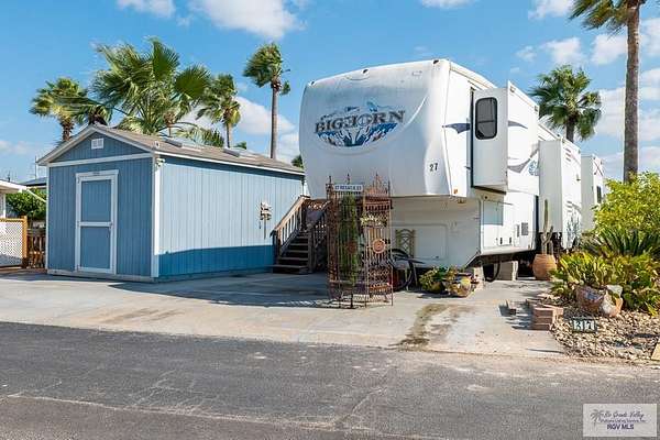 2009 Fifth Wheel w/4 permanently opened slide outs, 1 br, 1 bath, completely remodeled with upscale furnishings. Generator, new laminate flooring thruout, large kitchen island, new 15 cf refrigerator w/icemaker, new full size electric stove, convection microwave, new dishwasher, many cabinets and pull out pantry, queen size sofa bed in living room with built in office space, updated bathroom w/ADA toilet and new vessel sink vanity. Second bed and full bath right next door in fully furnished Texas room with full shower, vanity, toilet, propane water heater, propane combination washer/dryer, refrigerator, ac, queen size sofa bed and lots of storage. Newly built stand alone porch off rv and 300 sq ft deck overlooking resaca. Beautiful landscaping with palms, lime trees and many other flowers and greenery. Fully gated 55+ community with daily activities, 3 pools, a dog park and tennis court. HOA includes water, cable, wifi, trash/recycle pick up and park maintenance.