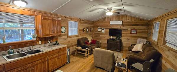 Inside the main camp, you'll find a practical, cozy layout that keeps gatherings comfortable and maintenance low--ideal for weekends away or fulltime simple living. The bedroom offers a calm retreat after long days on the water. The kitchen, living, and dining are in on area great for reminiscing the days events. Windows draw in natural light and a view of the trees, reminding you that you're never far from the river. Durable finishes and smart storage nooks mean you can track in sand and river gear without worry, then tidy up fast when company comes over.