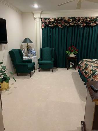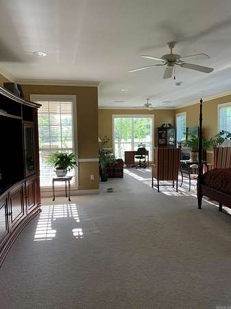 By appt only. Large house, two complete kitchens + kitchen in shop, heated floors, upstairs refrig & W/D stays, 3 living rooms 2 w/built ins, a complete 12 person theatre w/Denon, Epson,& Klipsch, small library, a big game room w/ 2 game closets, big seasonal closet, a third floor craft/sewing room, balcony overlooks back yard pond w/pavilion & year around flowing creek, 2 walkout storages, each bedroom has its own bath +two 1/2 baths. House has 4 car garage +4 wheeler parking area. Portico attaches house & working shop w/8200 Sq. Ft, HVAC, has kitchen and full bath, showroom, shop, MH garage, warehouse & parts room. Greenhouse is 25' X 34', has running water and heat. Accessory bldg is 25' X 34' w/separate storage area for tractors, etc.,can convert to guest house. 6 acres in city limits, not in a subdivision. 7 HVAC units + 2 gas heaters, 11 garage doors. Lots of trees, white vinyl fence on front. New roofs 2024. Lots of other features not listed here. Call for list of items that do not remain.