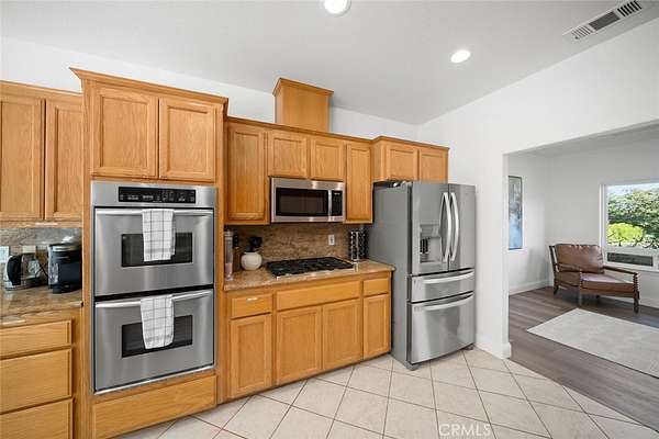 Inside, the open floor plan welcomes you with vaulted ceilings, recessed lighting, and a cozy fireplace that anchors the living area. The kitchen is both functional and inviting, featuring abundant counter space, bar seating, stainless steel appliances including a propane cooktop, dual ovens, range hood, microwave, and refrigerator. A reverse osmosis system, pull-out trash bin, and ample storage ensure the space is as efficient as it is elegant.