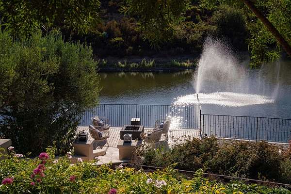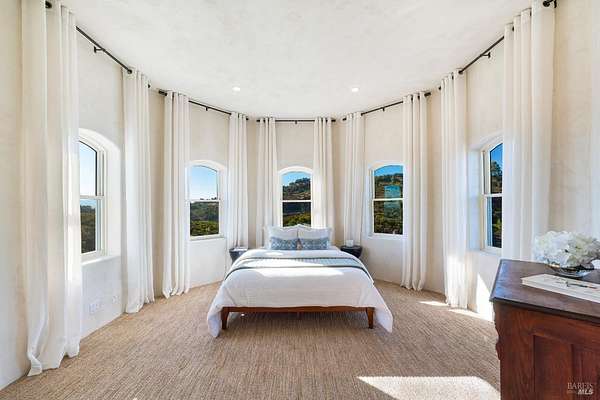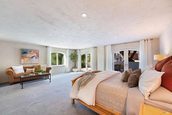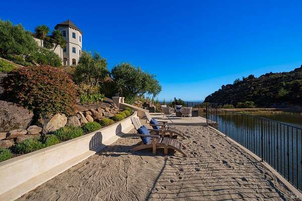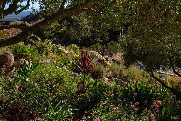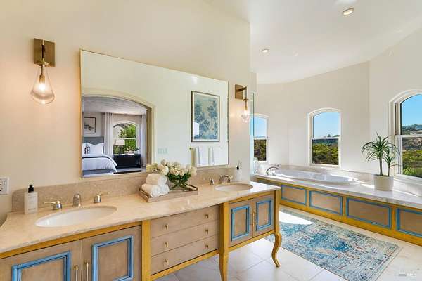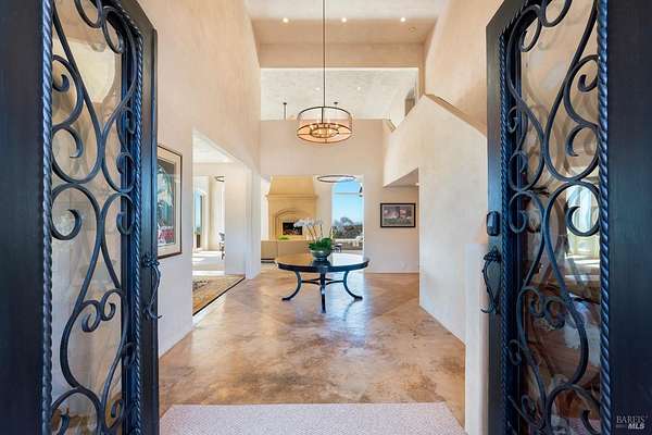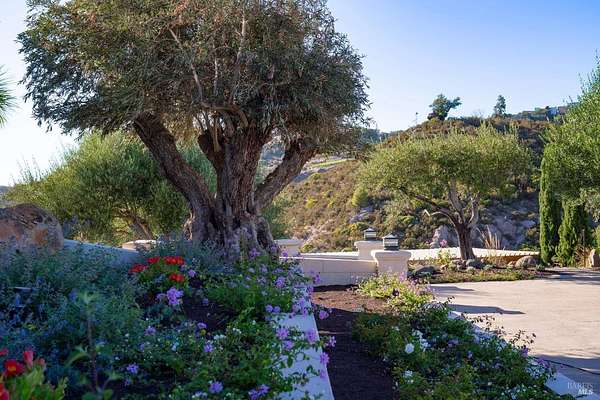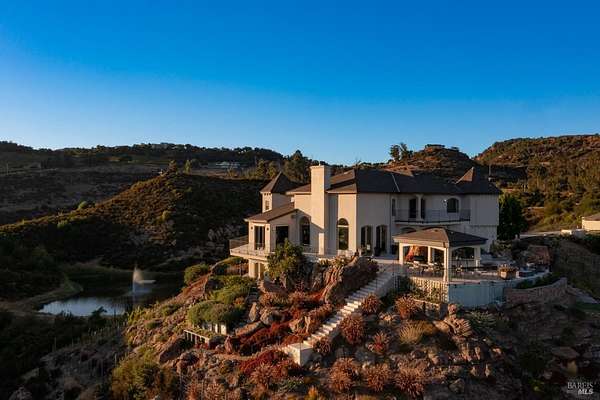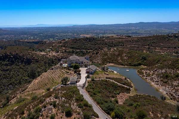 Where the ridge meets the sky, this Mediterranean-inspired estate rises above Napa Valley with panoramic views reaching across vineyards and mountains to San Francisco Bay, Mount Tamalpais, and the Golden Gate towers. Just minutes from Silverado Country Club and downtown Napa, it offers both seclusion and convenience. Behind a private gate, 10 acres of terraced gardens, ancient olive trees, and vineyard create an atmosphere of serenity. Reimagined between 2021 and 2025, the 7,500 sq. ft. residence blends grandeur with intimacy. Cathedral ceilings, walls of glass, and natural light define interiors, while verandas and landscaped spaces capture Napa's indoor-outdoor living. Four en-suite bedrooms, a large den, two wine tasting rooms, and generous gathering areas welcome retreats or large-scale entertaining. The grounds feature a 2-acre Cabernet Franc vineyard, a pond with 90-foot waterfall, cliffside paths, a Hestan outdoor kitchen, fire pit, hot tub, putting green, golf tee, solar power, and dual garages. This is a property that must be experienced. Its scale, privacy, and natural beauty create an estate that feels at once grounded in Napa's vineyard tradition and elevated far above it an incomparable retreat just minutes from the heart of the Valley.