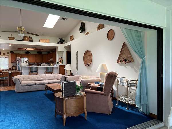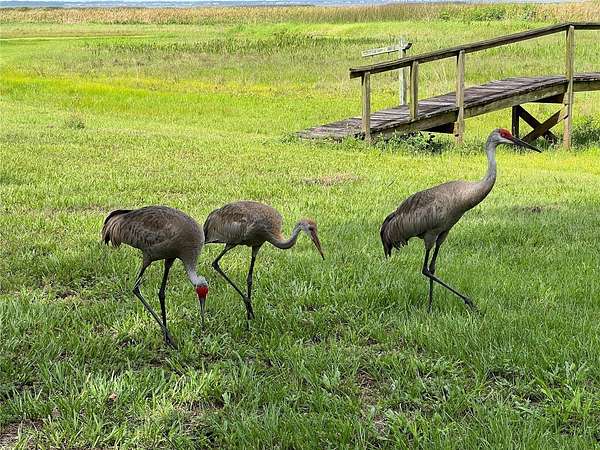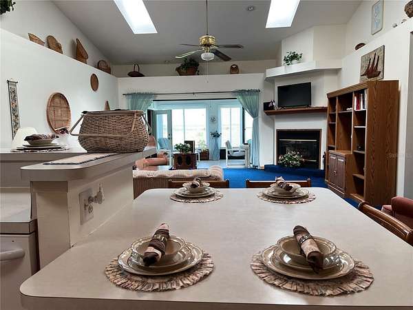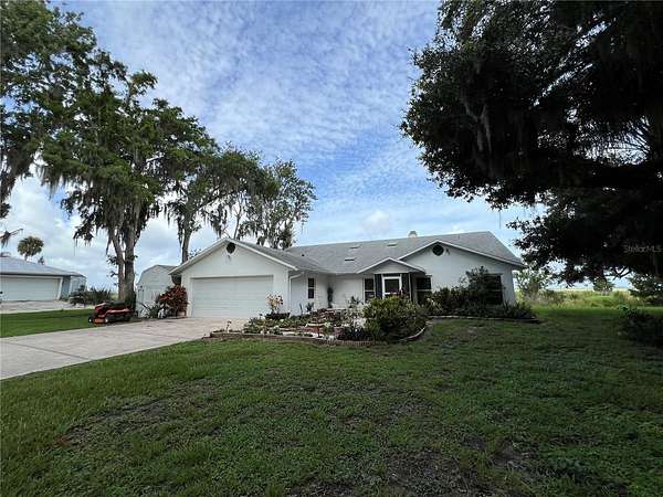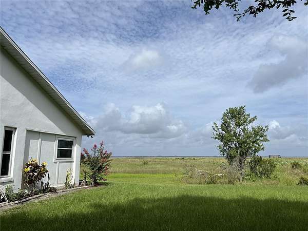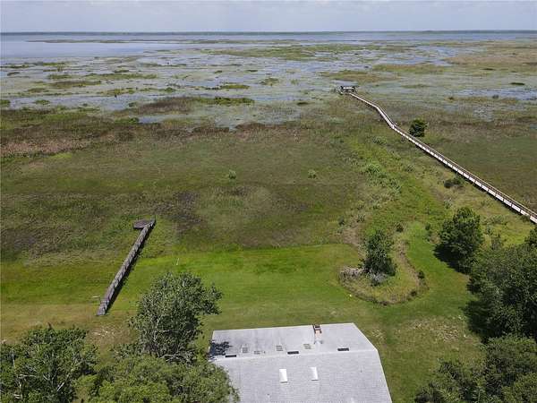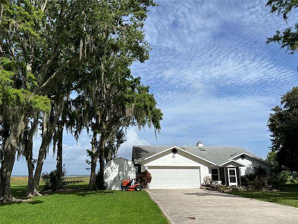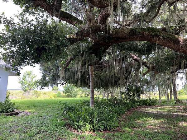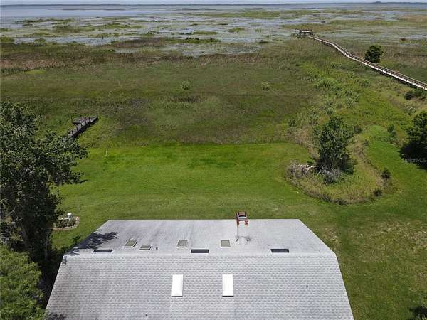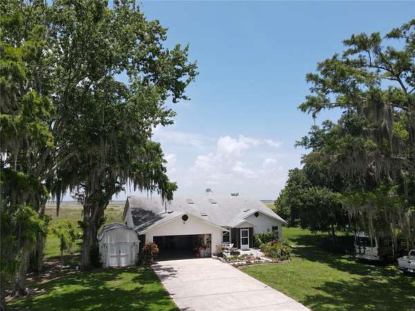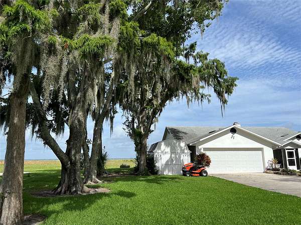 Welcome to this one-owner lakefront home on Lake Toho that has been meticulously maintained! Travel down the grassy, cypress-tree lined driveway until it opens up to the inviting and beautifully landscaped front yard and the house. Enter the home through the screened front porch and see the spacious kitchen on your left. All appliances will stay, including the gas range, washer, and dryer. There are lots of wood cabinets, a built-in desk, a high breakfast bar by the sink, and an attached dining room table with storage below. The home features an open floor plan, with plenty of skylights throughout, to really let in the light. There is a gas fireplace in the living room. The living room opens through the triple sliding glass doors to the Florida room with Oh, What a view! Lake Toho! Wildlife, birds and bunnies abound. On either side of the Florida room are rooms that now serve as an office and a TV room, but could easily be converted to bedrooms if needed. There are four bedrooms, one has an electric fireplace. Two bedrooms have walk-in closets (one with cedar walls), one bedroom has French doors. There are two full baths, one on each side of the house, and there is another full bath in the garage. Drop-down stairs attic access is in the garage, and also in the cedar closet. There is a Whole House Fan which can keep you cool several months of the year, saving on AC bills. The roof was replaced 3 years ago. There is a canal on the north side of the property that leads to a small boat basin, just needs a little weed clean-up. The yard has space for your RV, boat, whatever big toys you have. Come home to quieter times and live on the lake!
