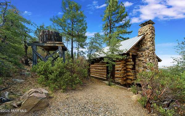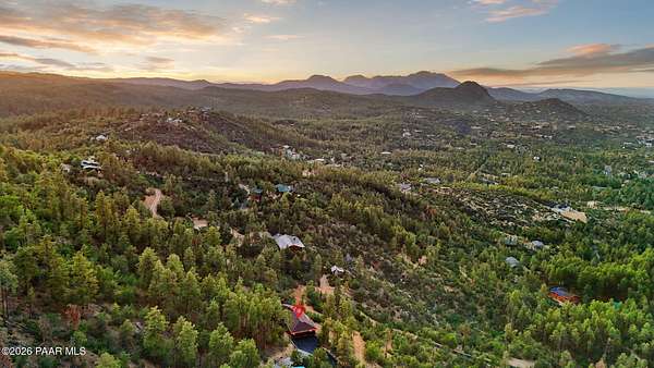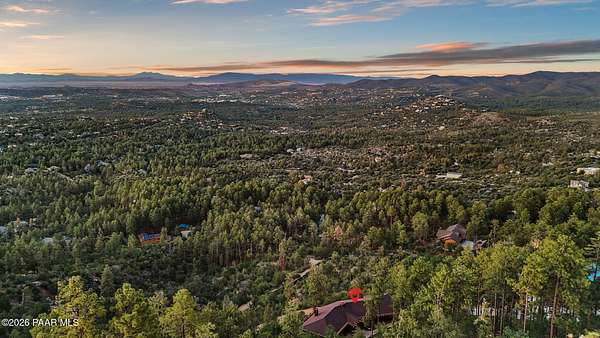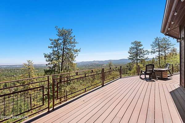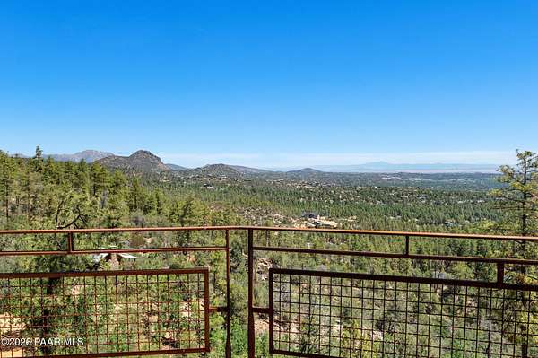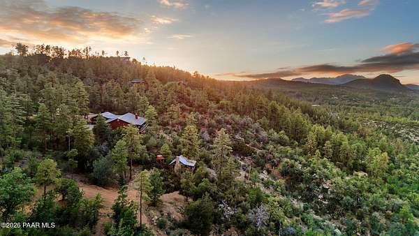 Experience life above the clouds in this mountaintop contemporary-rustic estate set on 4 private acres backing Prescott National Forest, offering panoramic views, no HOA, paved access, and a separate guest cabin. While it feels private and secluded, you are just 10 minutes from the heart of historic downtown Prescott, with galleries, boutiques, Whiskey Row, and award-winning, chef-driven restaurants. Set at the end of a quiet, fully paved road and surrounded by towering Ponderosa pines, the property includes a 4,251 sqft main residence and a charming 320 sq ft guest log cabin--ideal for visitors, a studio, or future expansion. The cabin features its own 3/4 bath, vehicle access, private paved driveway, and sweeping views, just a short 5-minute walk from the main home. The property's setting is exceptionally peaceful--you'll hear nothing but the wind through the pines and birds overhead. As day turns to night, the views become even more striking, revealing a blanket of city lights stretching across the horizon. Inside the main house, soaring beamed ceilings, wide-plank floors, and a dramatic floor-to-ceiling, double-sided stone fireplace create a warm, inviting atmosphere. A wall of windows frames the surrounding forest, flooding the home with natural light and showcasing views from every room. The main level is designed for effortless living and entertaining. The primary suite features a wood-burning fireplace, direct access to the full-length deck, and views that stretch for miles. The en suite bath offers a walk-in closet, double vanity, soaking tub, and walk-in shower. The kitchen features natural wood cabinetry, granite countertops, and a large wraparound breakfast bar, opening to the dining and living areas. An oversized 2.5-car garage provides ample space, while the main level seamlessly opens to outdoor living and dining from the front patio to the rear entertaining areas. The lower level features a large family room with a wet bar, two guest bedrooms, and a full bath, all with access to a second full-length deck. Homes of this caliber are rarely available--designed for exceptional entertaining and set in a truly remarkable setting.