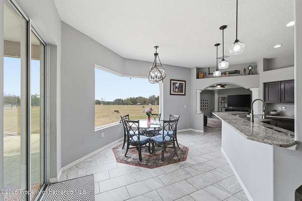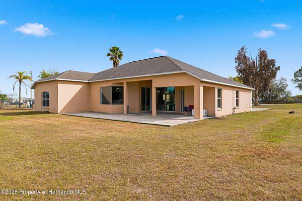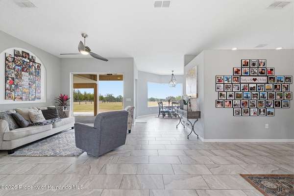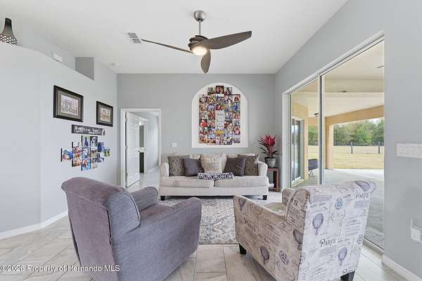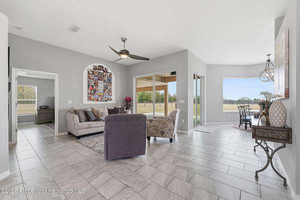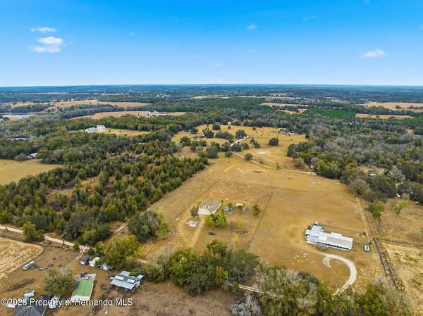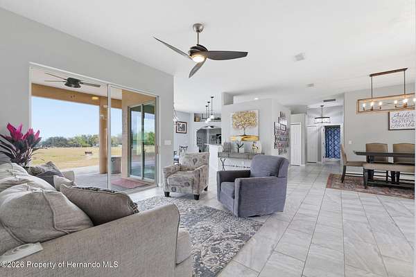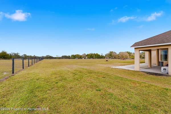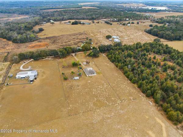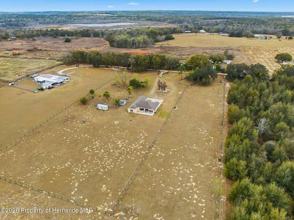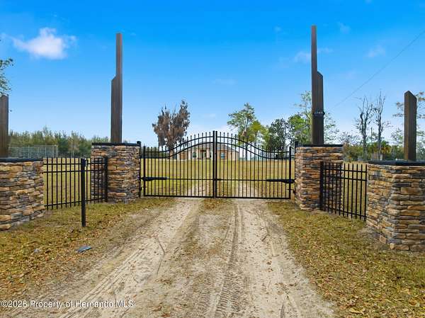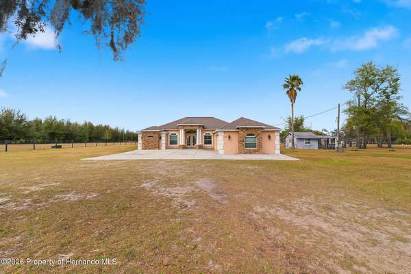 Set on just over 5 acres surrounded by open pastureland, this 3 bedroom, 2 bath home with a 2 car garage offers privacy, space and peaceful country living while remaining conveniently connected to nearby amenities. As you approach the property, an electric gate welcomes you into the fully fenced grounds leading to an expansive parking pad and a beautifully designed home featuring stone accents across the exterior. A covered front porch with soaring ceilings leads to double French front doors. Inside, elegant tile flooring with the look of polished marble flows throughout most of the home, excluding the 2 additional bedrooms. Immediately to the right is the formal dining room with a large window overlooking the front of the property while straight ahead the living room opens with sliding glass doors bringing natural light and views of the surrounding land. Moving further inside, the kitchen and breakfast nook feature a panoramic window and additional sliding glass doors framing views of the backyard. The kitchen is designed for everyday living and entertaining with a large breakfast bar, built-in shelving, granite countertops, dark wood cabinetry, stainless steel appliances, dual sink, and spacious pantry. Beyond the kitchen, a wide arched opening framed by decorative columns leads into the family room where a tray ceiling adds architectural detail and a large arched window fills the space with natural light. The primary suite is located on the left side of the home for added privacy and features marble-look tile flooring, a tray ceiling, sliding glass doors to the rear patio and two additional windows overlooking the acreage. The ensuite bathroom features cathedral ceilings, a centrally positioned soaking tub and a large walk-through shower accessible from both sides with dual shower heads, a rainfall shower head, built-in shelving and a window for natural light. Granite countertops and dark wood cabinetry complement the space while the vanity provides extended counter area. Just beyond, the walk-in closet includes built-in storage and a window. On the opposite side of the home are two additional bedrooms separated by a hallway bathroom. Both bedrooms feature carpet flooring, a window, and a built-in closet. The shared bathroom includes granite countertops, dark wood cabinetry, a single vanity, and a tub/shower combination. Near the dining room is the laundry room with corridor access to the garage, built-in shelving, a utility sink, and washer and dryer. At the rear of the home, the patio offers a spacious outdoor living area that is mostly covered and extends into an open sun patio, providing space for relaxing or entertaining while enjoying views of the backyard and surrounding acreage. The property also includes a separate fenced pasture area suitable for farm animals such as horses, cattle, chickens, and goats. The land offers room for gardening, recreation, animals or future additions while maintaining privacy and wide-open views. Located in Brooksville, the home provides convenient access to the Suncoast Parkway for travel to Tampa and surrounding areas including shopping, dining and Tampa International Airport. Nearby attractions include Weeki Wachee Springs State Park for kayaking and paddleboarding in clear spring waters, Withlacoochee State Forest with miles of trails for hiking, biking and horseback riding and historic downtown Brooksville known for local shops, restaurants, festivals, and community events.