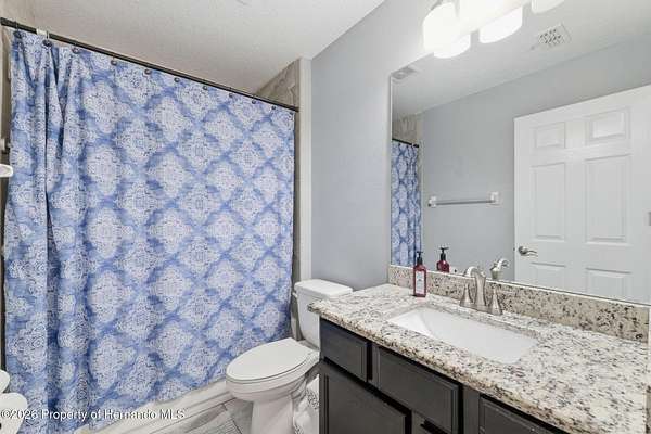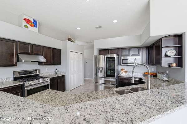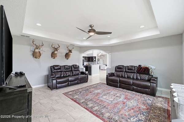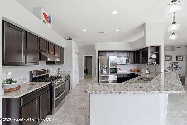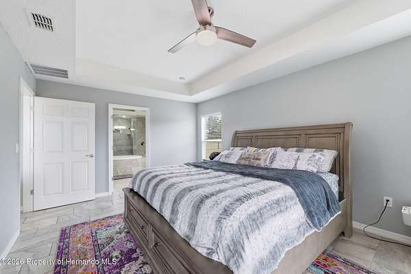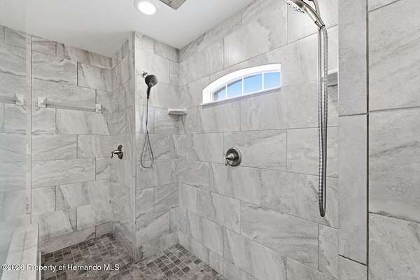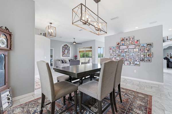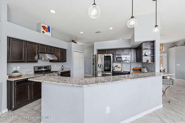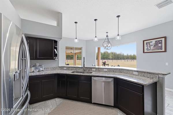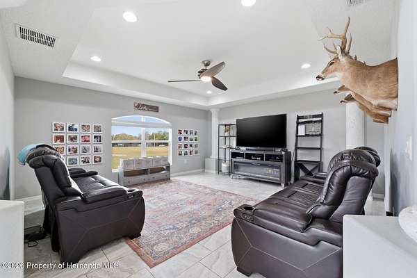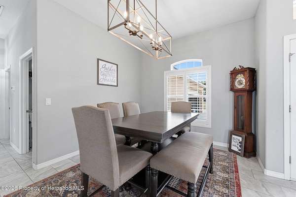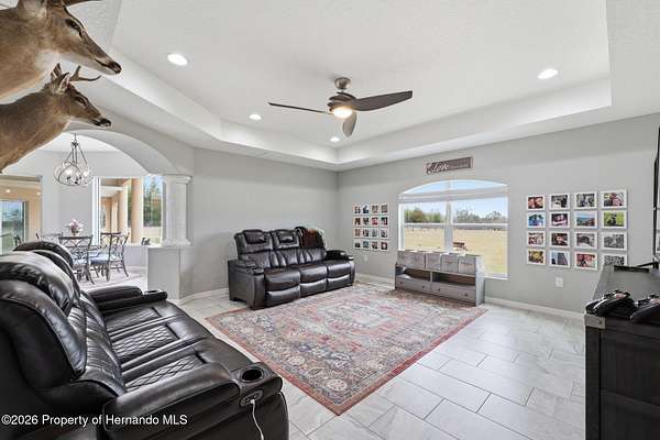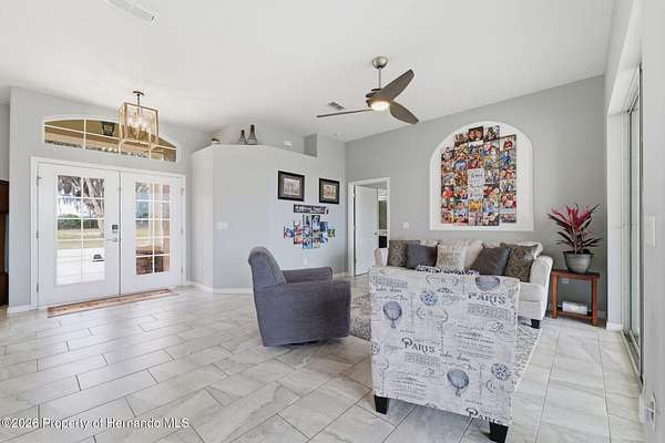 Set on just over 5 acres surrounded by open pastureland, this 3 bedroom, 2 bath home with a 2 car garage offers privacy, space and peaceful country living while remaining conveniently connected to nearby amenities. As you approach the property, an electric gate welcomes you into the fully fenced grounds leading to an expansive parking pad and a beautifully designed home featuring stone accents across the exterior. A covered front porch with soaring ceilings leads to double French front doors. Inside, elegant tile flooring with the look of polished marble flows throughout most of the home, excluding the 2 additional bedrooms. Immediately to the right is the formal dining room with a large window overlooking the front of the property while straight ahead the living room opens with sliding glass doors bringing natural light and views of the surrounding land. Moving further inside, the kitchen and breakfast nook feature a panoramic window and additional sliding glass doors framing views of the backyard. The kitchen is designed for everyday living and entertaining with a large breakfast bar, built-in shelving, granite countertops, dark wood cabinetry, stainless steel appliances, dual sink, and spacious pantry. Beyond the kitchen, a wide arched opening framed by decorative columns leads into the family room where a tray ceiling adds architectural detail and a large arched window fills the space with natural light. The primary suite is located on the left side of the home for added privacy and features marble-look tile flooring, a tray ceiling, sliding glass doors to the rear patio and two additional windows overlooking the acreage. The ensuite bathroom features cathedral ceilings, a centrally positioned soaking tub and a large walk-through shower accessible from both sides with dual shower heads, a rainfall shower head, built-in shelving and a window for natural light. Granite countertops and dark wood cabinetry complement the space while the vanity provides extended counter area. Just beyond, the walk-in closet includes built-in storage and a window. On the opposite side of the home are two additional bedrooms separated by a hallway bathroom. Both bedrooms feature carpet flooring, a window, and a built-in closet. The shared bathroom includes granite countertops, dark wood cabinetry, a single vanity, and a tub/shower combination. Near the dining room is the laundry room with corridor access to the garage, built-in shelving, a utility sink, and washer and dryer. At the rear of the home, the patio offers a spacious outdoor living area that is mostly covered and extends into an open sun patio, providing space for relaxing or entertaining while enjoying views of the backyard and surrounding acreage. The property also includes a separate fenced pasture area suitable for farm animals such as horses, cattle, chickens, and goats. The land offers room for gardening, recreation, animals or future additions while maintaining privacy and wide-open views. Located in Brooksville, the home provides convenient access to the Suncoast Parkway for travel to Tampa and surrounding areas including shopping, dining and Tampa International Airport. Nearby attractions include Weeki Wachee Springs State Park for kayaking and paddleboarding in clear spring waters, Withlacoochee State Forest with miles of trails for hiking, biking and horseback riding and historic downtown Brooksville known for local shops, restaurants, festivals, and community events.