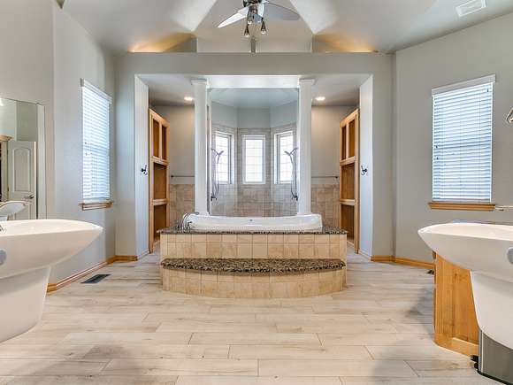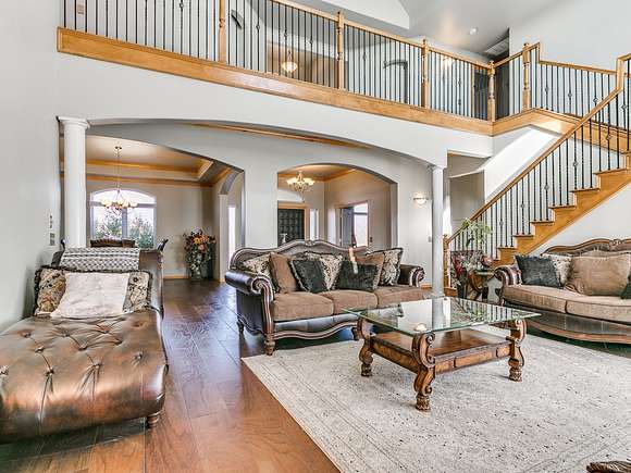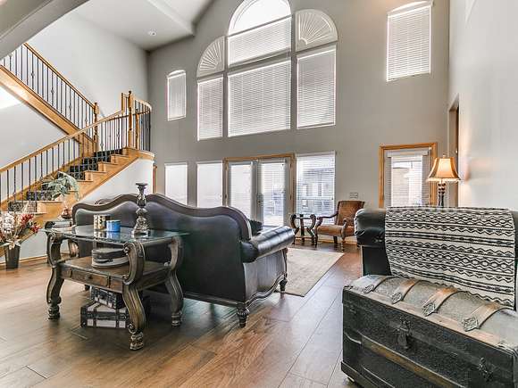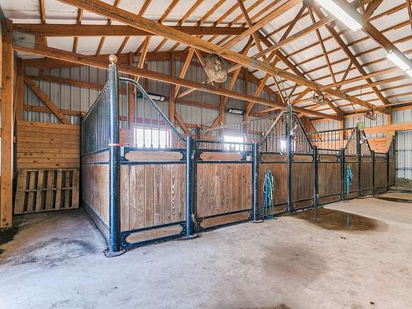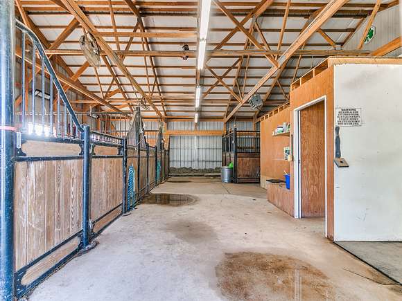 A privately gated circle drive welcomes you to this expansive 5234 sq ft estate nestled on 10 acres with vinyl fencing, offering luxury and functionality at every turn. With 5 bedrooms and 6 bathrooms, each bedroom features its own ensuite. The property includes a 695 sq ft private guest house with a full kitchen, as well as a 96x42 ft cooled barn with office space, stables, and wash and tac room suitable for horses and cows. Inside, discover wood floors gracing the main living spaces, such as the office, formal dining room, and a spacious living room with a two-story view and abundant natural light. The kitchen is a chef's dream with an eat-in island, eat-in bar, walk-in pantry, and ample storage. A second living space off the kitchen adds to the home's charm. The giant master bedroom boasts a walk-around soaking tub, double-sided walk-in shower, double vanities, and two toilets. Outside enjoy the view from a private balcony or the covered patio overlook a large saltwater pool and the vast 10-acre expanse. Welcome to a haven where luxury meets country living!