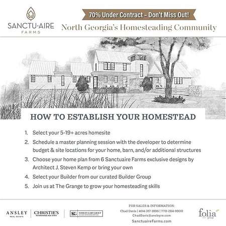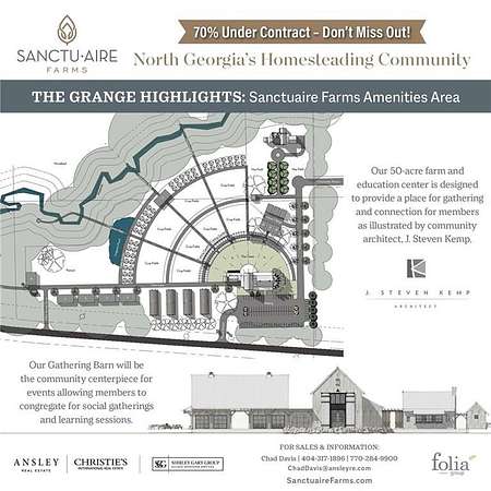 Introducing "Thunder Hill" at Sanctuaire Farms - an extraordinary Lot, Home, Pool and Vehicle Barn , To Be Built 5-bedroom, 5.5-bath estate designed by renowned architect Bill Ingram and exclusively offered on a breathtaking 5-acre homesite (Lot 53 ). This thoughtfully crafted modern Southern farmstead is brought to life by Raines Residential, a five-generation, family-run builder with more than 40 years of experience in the Atlanta luxury market. Offered at $2,650,000, Thunder Hill represents a rare opportunity to own a truly timeless home blending architectural distinction with refined, livable elegance. Bill Ingram's distinguished career includes features in Veranda, Architectural Digest, House Beautiful, Southern Living, Southern Accents, and Atlanta Homes & Lifestyles. His accolades include being named ADAC's Southeast Architect of the Year and recipient of the ICAA Shutze Award. Ingram's design philosophy pairs traditional and modern influences, opulence and simplicity, and the organic with the elegant - resulting in a residence that feels both grand and deeply connected to its surroundings. A conceptual estate site plan has been provided by the architect as inspiration for the placement of outdoor living areas, gardens, and grounds specific to this exceptional homesite. Thunder Hill is located within Sanctuaire Farms, a 460-acre gated homestead community created for those who desire a lifestyle rooted in purpose, privacy, and connection to the land. Built on the foundations of Faith, Family, and Community, Sanctuaire Farms features 54 estate-sized homesites ranging from 5 to 20+ acres and a carefully curated builder group. The community specializes in transforming homestead dreams into reality through a guided process: select your lot, collaborate with the developer on a master plan, choose a builder, and create the farmstead of your dreams. Whether you envision a family compound, boutique working farm, or a peaceful country retreat, this community is designed to support and elevate your vision. At the heart of Sanctuaire Farms lies The Grange, a 40-acre private, working amenity farm offering an unparalleled lifestyle experience. Residents enjoy access to a Gathering Barn and Veggie Barn, Farmers Market and Artist Pavilions, greenhouse, dairy barn, workshop, prayer garden, and event lawn. The community also offers homeschool programming, farm-to-table dinners, CSA subscriptions, seasonal festivals, and educational events. Owners have the opportunity to garden, raise animals, participate in sustainable agriculture, and enjoy a deeply connected way of living - all within a secure, like-minded community. This is more than a home. It is a legacy property designed for meaningful living - where land, lifestyle, and intention come together in perfect harmony. Come experience life at Sanctuaire Farms.