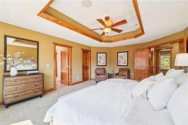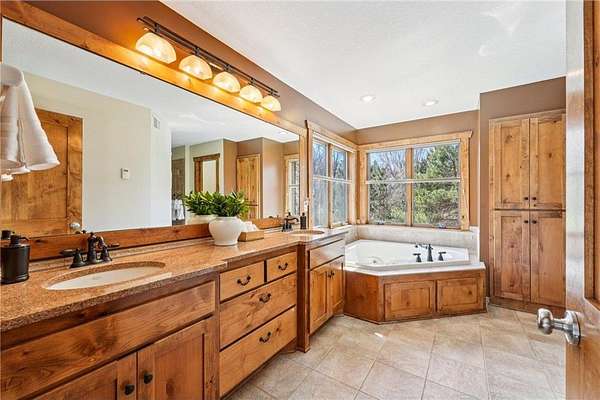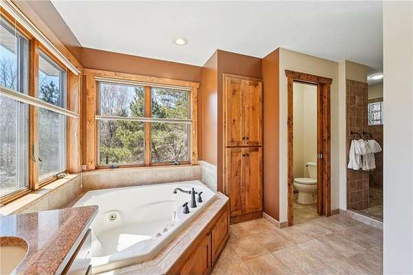 Upstairs offers 4 bedrooms, including a primary suite with custom closets, jetted tub, walk-in shower, and in-floor heat. The finished lower level adds 2 more bedrooms, another full bath, wet bar with in-floor heat, and flexible living space with a second gas fireplace.