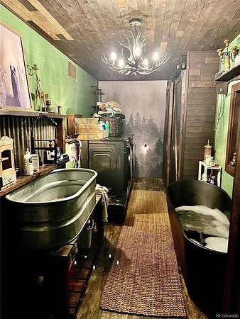The garage is fully converted to include a deluxe master suite, firepit stove, full master bath, washer/dryer, pet grooming station and tool/storage.