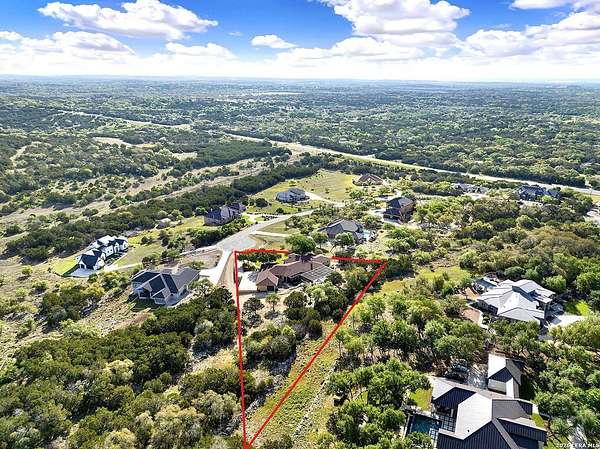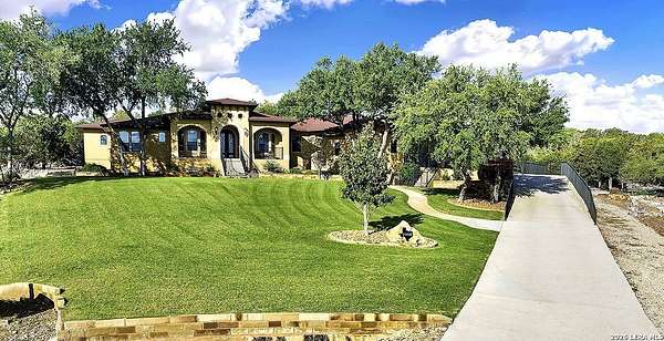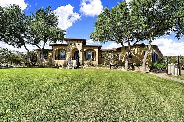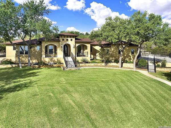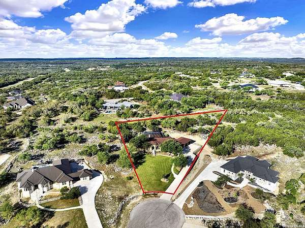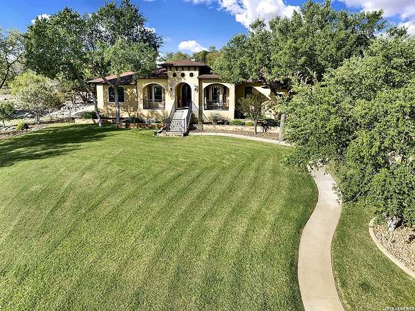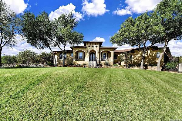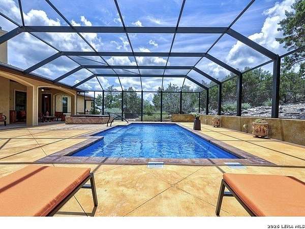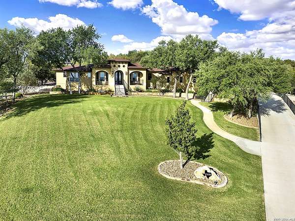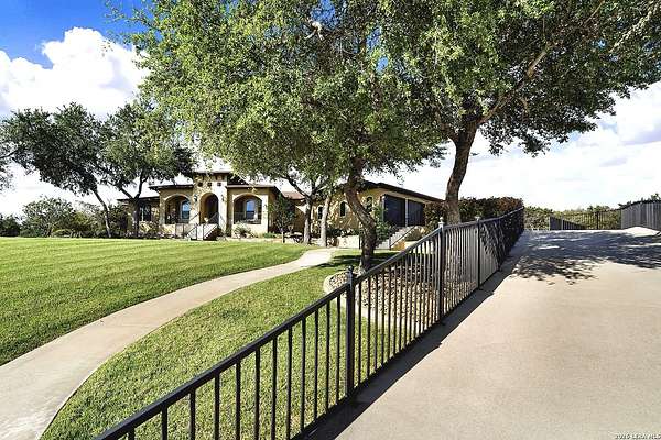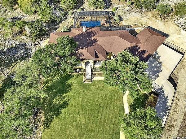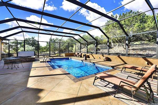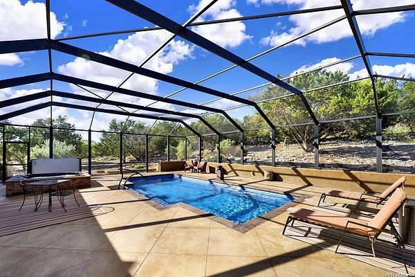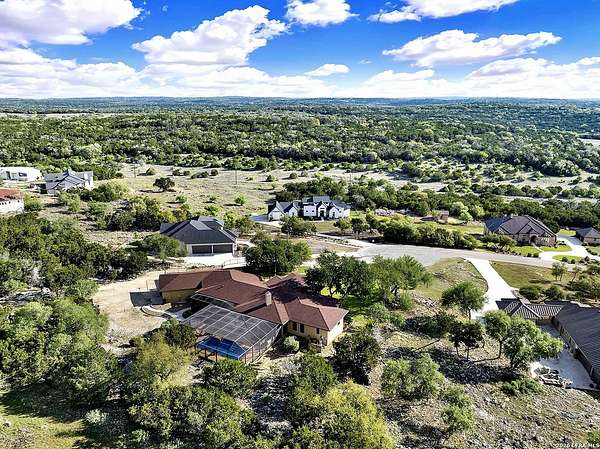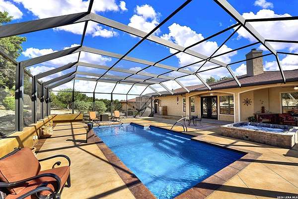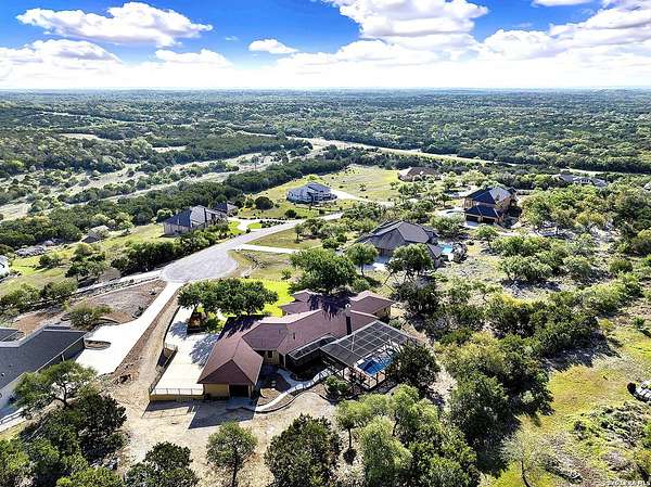 Views, Views, Views! * 5 Car Garage * Perched atop 1.6+ acres in the heart of the Hill Country, this meticulously maintained, turnkey estate delivers luxury, functionality, and breathtaking scenery in every direction * Designed for both everyday comfort and unforgettable entertaining, this stunning 5-bedroom, 3.5-bath home-with the flexibility to use the 5th bedroom as an office-offers outstanding front-facing views of hundreds of acres of trees and rolling hills * Step inside through impressive 8-foot custom San Marcos metal front and back doors and experience soaring ceilings, an open-concept layout, and porcelain wood-look tile flooring throughout-no carpet anywhere. The home features ADA-compliant hallways, ceiling fans throughout, and impeccable craftsmanship at every turn * Rooms at the front of the home showcase spectacular Hill Country views, while rear-facing rooms overlook the sparkling pool and natural landscaping * The spacious living room is anchored by a stunning rock wood-burning fireplace, creating a warm and inviting gathering space * The chef's kitchen is the centerpiece of the home, featuring an oversized island with bar seating, granite countertops, upgraded 5-burner gas cooktop, wine refrigerator, abundant custom Alderwood cabinetry, and a unique rock-accent built-in kitchen table/extended countertop-perfect for casual dining and entertaining * A huge separate dining room offers additional space for hosting guests and special occasions * The private Owner's Retreat is a true sanctuary, offering panoramic views, dual closets with custom built-in dressers, and a spa-like bath complete with a relaxing Jacuzzi tub * A fully equipped ensuite/mother-in-law suite provides exceptional flexibility, featuring its own full bathroom, mini kitchenette, and private exterior entrance-ideal for guests, extended family, or multigenerational living * Outdoor living is equally impressive with a 15x30 saltwater pool and spa, enclosed within an incredible 1,800 sq ft screened structure, allowing year-round enjoyment with minimal maintenance and fewer pests * Relax under the covered patio with ceiling fans, take in the views from the expansive front porch, and enjoy the privacy of professionally landscaped surroundings with mature trees and natural beauty * Car enthusiasts and hobbyists will appreciate the massive 1,600 sq ft 5-car garage featuring epoxy floors, extra storage shelving, tall doors, and a dedicated bay with side backyard access * A wraparound driveway offers additional parking and convenient trailer access * Additional features include gutters, soffit lighting, water softener, and thoughtful upgrades throughout * Located in a gated cul-de-sac community near Natural Bridge Caverns, this property combines peaceful country living with everyday convenience-just 7 miles to IH-35, 25 minutes to Randolph AFB and New Braunfels, and 30 minutes to San Antonio International Airport. With a low tax rate and low HOA, this exceptional estate truly embodies Hill Country luxury living at its finest.