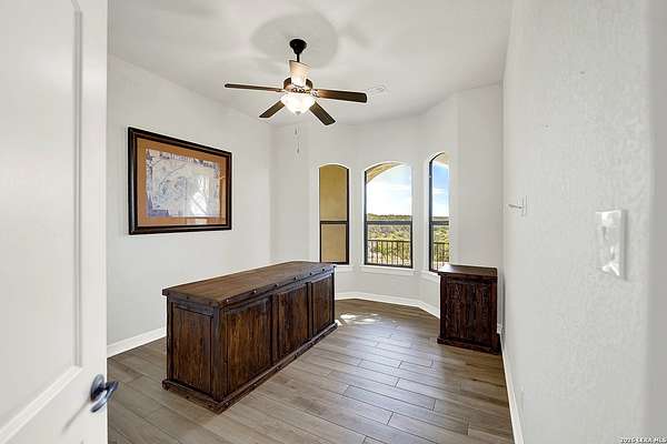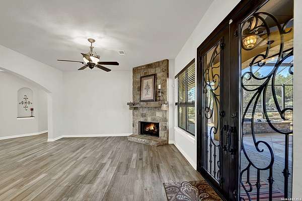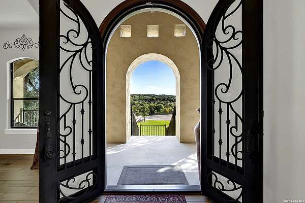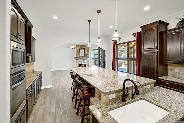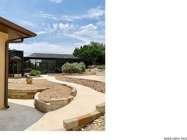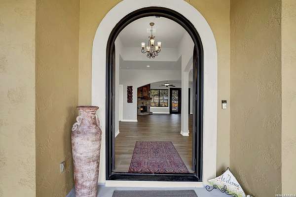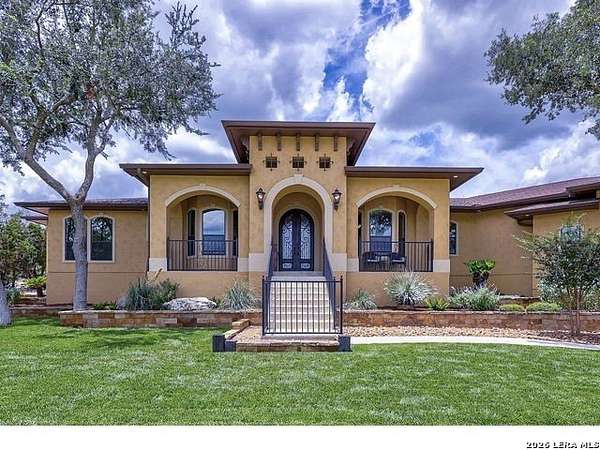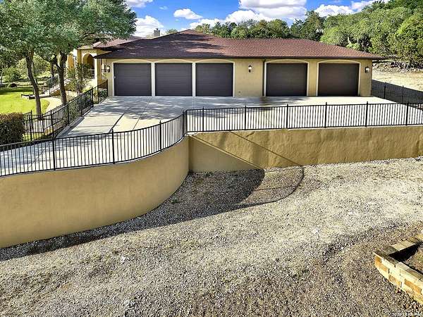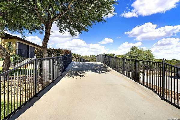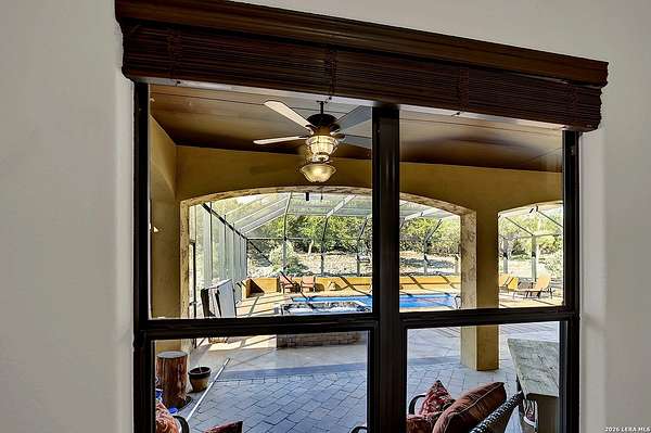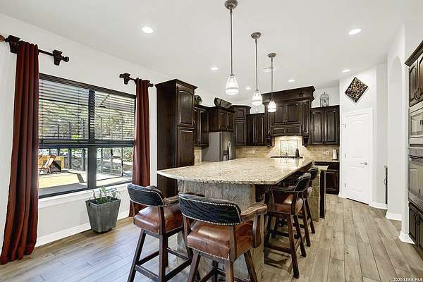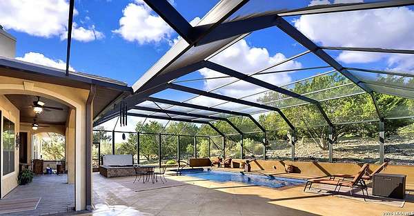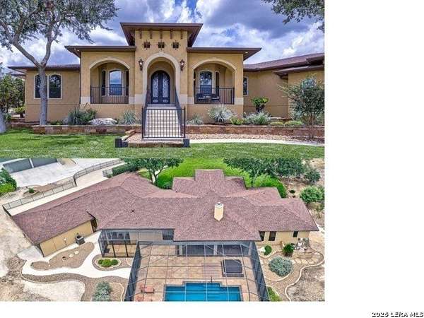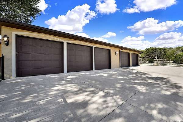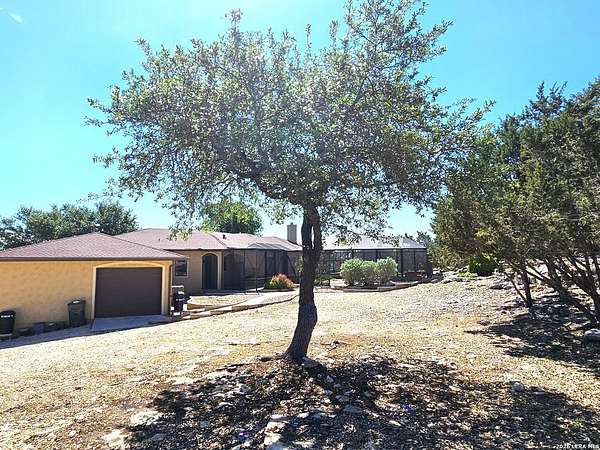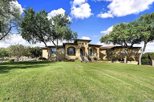 Views, Views, Views! * 5 Car Garage * Perched atop 1.6+ acres in the heart of the Hill Country, this meticulously maintained, turnkey estate delivers luxury, functionality, and breathtaking scenery in every direction * Designed for both everyday comfort and unforgettable entertaining, this stunning 5-bedroom, 3.5-bath home-with the flexibility to use the 5th bedroom as an office-offers outstanding front-facing views of hundreds of acres of trees and rolling hills * Step inside through impressive 8-foot custom San Marcos metal front and back doors and experience soaring ceilings, an open-concept layout, and porcelain wood-look tile flooring throughout-no carpet anywhere. The home features ADA-compliant hallways, ceiling fans throughout, and impeccable craftsmanship at every turn * Rooms at the front of the home showcase spectacular Hill Country views, while rear-facing rooms overlook the sparkling pool and natural landscaping * The spacious living room is anchored by a stunning rock wood-burning fireplace, creating a warm and inviting gathering space * The chef's kitchen is the centerpiece of the home, featuring an oversized island with bar seating, granite countertops, upgraded 5-burner gas cooktop, wine refrigerator, abundant custom Alderwood cabinetry, and a unique rock-accent built-in kitchen table/extended countertop-perfect for casual dining and entertaining * A huge separate dining room offers additional space for hosting guests and special occasions * The private Owner's Retreat is a true sanctuary, offering panoramic views, dual closets with custom built-in dressers, and a spa-like bath complete with a relaxing Jacuzzi tub * A fully equipped ensuite/mother-in-law suite provides exceptional flexibility, featuring its own full bathroom, mini kitchenette, and private exterior entrance-ideal for guests, extended family, or multigenerational living * Outdoor living is equally impressive with a 15x30 saltwater pool and spa, enclosed within an incredible 1,800 sq ft screened structure, allowing year-round enjoyment with minimal maintenance and fewer pests * Relax under the covered patio with ceiling fans, take in the views from the expansive front porch, and enjoy the privacy of professionally landscaped surroundings with mature trees and natural beauty * Car enthusiasts and hobbyists will appreciate the massive 1,600 sq ft 5-car garage featuring epoxy floors, extra storage shelving, tall doors, and a dedicated bay with side backyard access * A wraparound driveway offers additional parking and convenient trailer access * Additional features include gutters, soffit lighting, water softener, and thoughtful upgrades throughout * Located in a gated cul-de-sac community near Natural Bridge Caverns, this property combines peaceful country living with everyday convenience-just 7 miles to IH-35, 25 minutes to Randolph AFB and New Braunfels, and 30 minutes to San Antonio International Airport. With a low tax rate and low HOA, this exceptional estate truly embodies Hill Country luxury living at its finest.