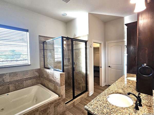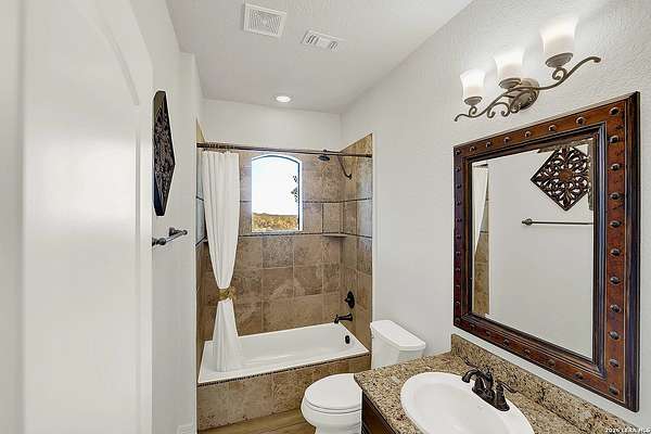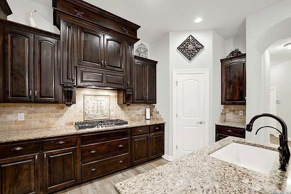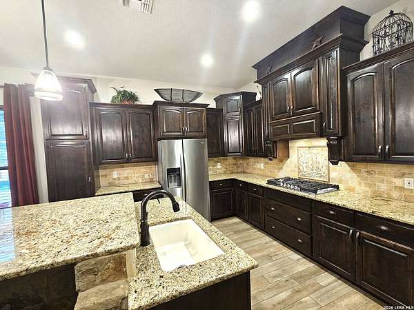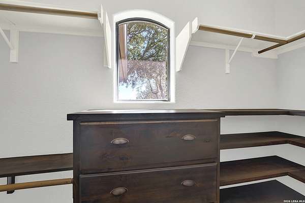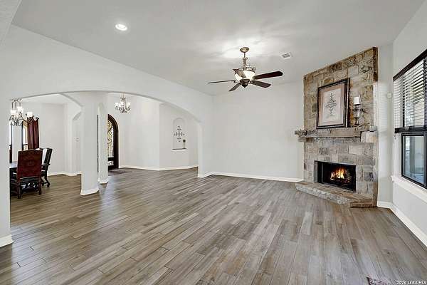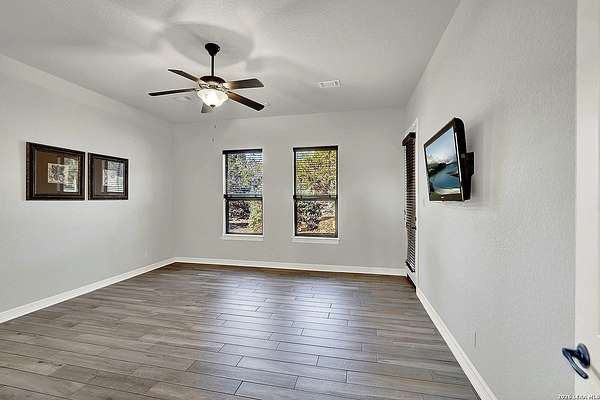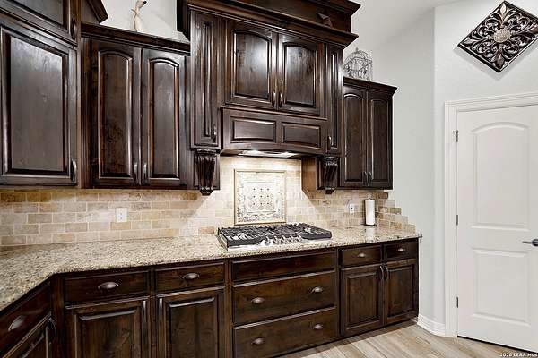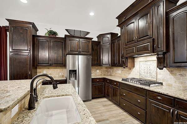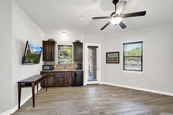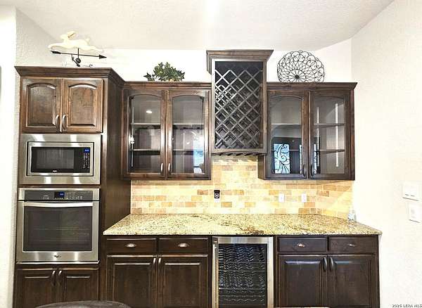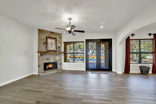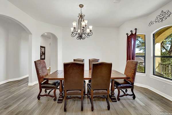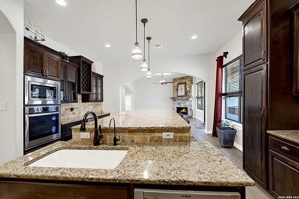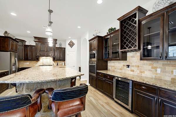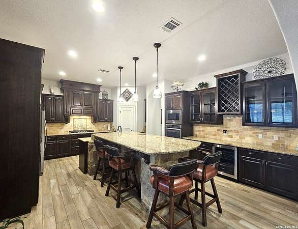 Views, Views, Views! * 5 Car Garage * Perched atop 1.6+ acres in the heart of the Hill Country, this meticulously maintained, turnkey estate delivers luxury, functionality, and breathtaking scenery in every direction * Designed for both everyday comfort and unforgettable entertaining, this stunning 5-bedroom, 3.5-bath home-with the flexibility to use the 5th bedroom as an office-offers outstanding front-facing views of hundreds of acres of trees and rolling hills * Step inside through impressive 8-foot custom San Marcos metal front and back doors and experience soaring ceilings, an open-concept layout, and porcelain wood-look tile flooring throughout-no carpet anywhere. The home features ADA-compliant hallways, ceiling fans throughout, and impeccable craftsmanship at every turn * Rooms at the front of the home showcase spectacular Hill Country views, while rear-facing rooms overlook the sparkling pool and natural landscaping * The spacious living room is anchored by a stunning rock wood-burning fireplace, creating a warm and inviting gathering space * The chef's kitchen is the centerpiece of the home, featuring an oversized island with bar seating, granite countertops, upgraded 5-burner gas cooktop, wine refrigerator, abundant custom Alderwood cabinetry, and a unique rock-accent built-in kitchen table/extended countertop-perfect for casual dining and entertaining * A huge separate dining room offers additional space for hosting guests and special occasions * The private Owner's Retreat is a true sanctuary, offering panoramic views, dual closets with custom built-in dressers, and a spa-like bath complete with a relaxing Jacuzzi tub * A fully equipped ensuite/mother-in-law suite provides exceptional flexibility, featuring its own full bathroom, mini kitchenette, and private exterior entrance-ideal for guests, extended family, or multigenerational living * Outdoor living is equally impressive with a 15x30 saltwater pool and spa, enclosed within an incredible 1,800 sq ft screened structure, allowing year-round enjoyment with minimal maintenance and fewer pests * Relax under the covered patio with ceiling fans, take in the views from the expansive front porch, and enjoy the privacy of professionally landscaped surroundings with mature trees and natural beauty * Car enthusiasts and hobbyists will appreciate the massive 1,600 sq ft 5-car garage featuring epoxy floors, extra storage shelving, tall doors, and a dedicated bay with side backyard access * A wraparound driveway offers additional parking and convenient trailer access * Additional features include gutters, soffit lighting, water softener, and thoughtful upgrades throughout * Located in a gated cul-de-sac community near Natural Bridge Caverns, this property combines peaceful country living with everyday convenience-just 7 miles to IH-35, 25 minutes to Randolph AFB and New Braunfels, and 30 minutes to San Antonio International Airport. With a low tax rate and low HOA, this exceptional estate truly embodies Hill Country luxury living at its finest.