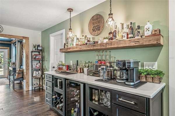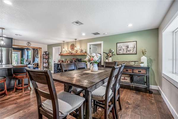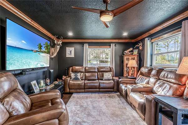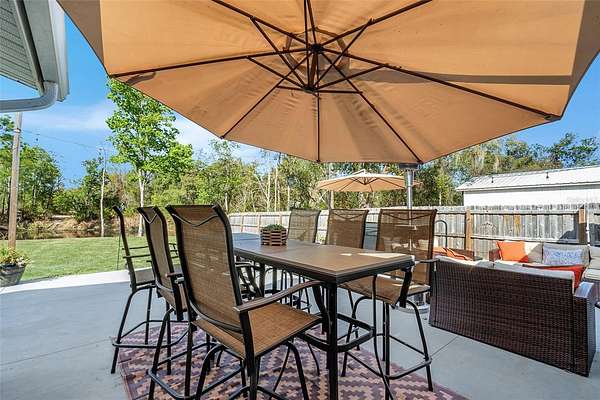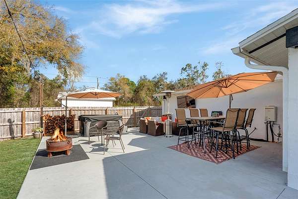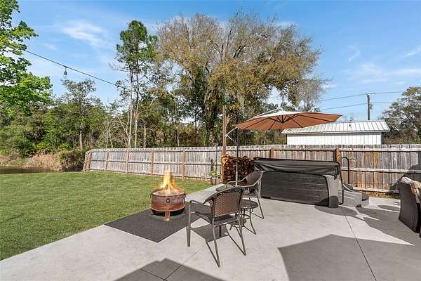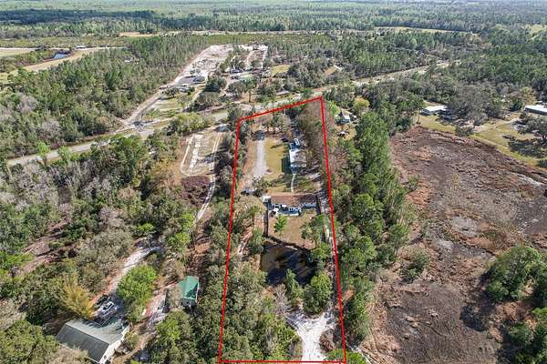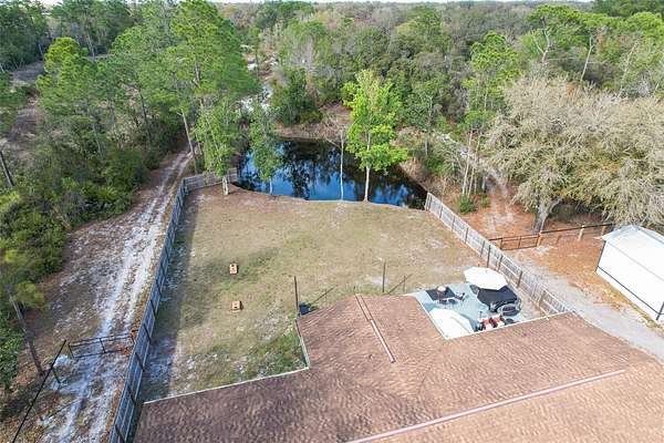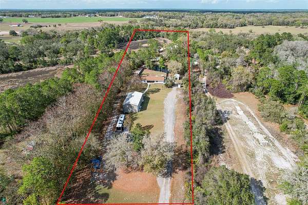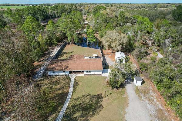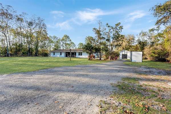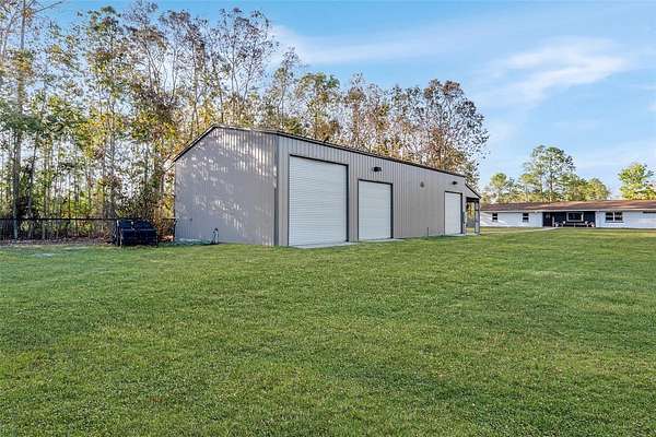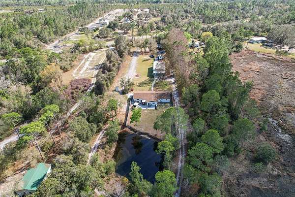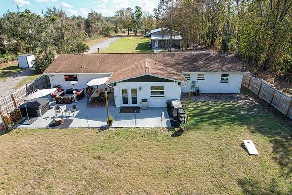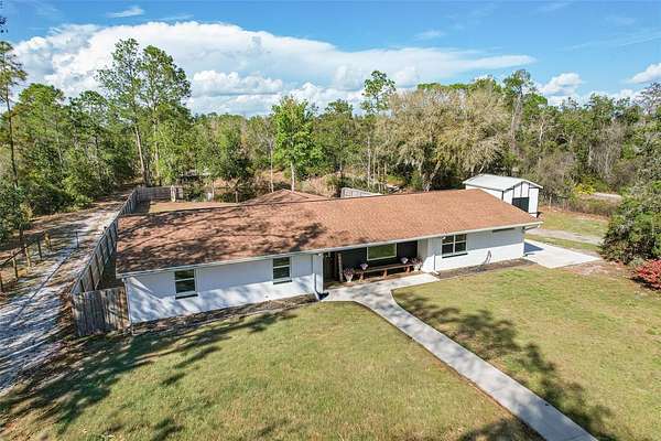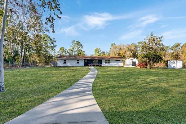 Escape to your own private country retreat on 4.5+/- acres in Eustis, where modern updates meet an exceptional outdoor lifestyle. This fully renovated block home offers 4 bedrooms, 3 full bathrooms, and thoughtful upgrades throughout, all completed during an extensive whole-home renovation in 2021. Inside, the home features an inviting open kitchen and dining area with a beautiful real brick backsplash, real cedar floating shelves, gas cooktop (propane), and all new appliances, including a built-in convection oven, microwave and beverage refrigerator, washer, and dryer. The home showcases all new wood flooring, fresh interior paint (2023), exterior paint (2025), solid wood interior doors on the primary suite wing, custom real wood trim with crown molding, and energy-efficient LED lighting throughout. The primary suite offers a peaceful retreat and includes a private office with its own exterior entrance, ideal for working from home or creating a flexible bonus space and could easily serve as a game room, hobby room, gym, or potential fifth bedroom. Major infrastructure upgrades provide peace of mind and modern efficiency, including new exterior windows and doors, full home rewire, underground power to the home, new 400-amp electrical service, full plumbing repipe, new attic insulation, and two separate gas tankless water heaters. The home is serviced by a 500-gallon buried propane tank owned by the homeowner. The main home septic system was replaced in 2022 and the second septic was added in 2025 designed for the RV and future barn bathroom. Outdoors, the property truly shines for those seeking space, privacy, and recreation. The land features a private pond, mature trees throughout the front and back of the property, and established blueberry bushes. The front and backyard were fully fenced in 2025, offering both security and flexibility for animals or recreation. The impressive barn/workshop built in 2021 features an insulated roof, three roll-up doors including one 12-foot door, 125-amp electrical service, and a 50-amp RV hookup and is 30 x 80 in size. An additional 12’ x 18’ storage shed built in 2025 provides even more storage space. Additional outdoor features include a 150-yard private shooting range, hard-packed milling driveway, large concrete RV pad, detached single-car garage on slab, and a large back patio with built-in sound system, making it perfect for entertaining or relaxing while enjoying the peaceful setting. With agricultural zoning, this property is ideal for those looking to bring horses, chickens, or other animals, while still enjoying the comfort and efficiency of a beautifully updated home. This rare property offers the perfect balance of privacy, functionality, and modern upgrades all just a short drive from town while feeling worlds away.