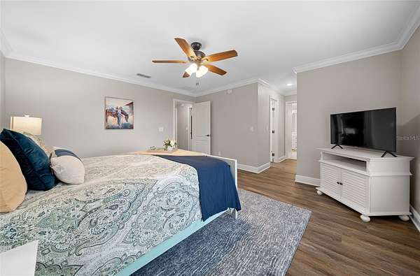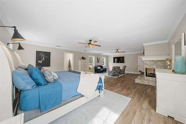 - Cathedral Ceiling(s), Ceiling Fans(s), Crown Molding, Eat-In Kitchen, High Ceilings, Primary Bedroom Upstairs, Solid Surface Counters, Split Bedroom, Thermostat, Walk-In Closet(s)