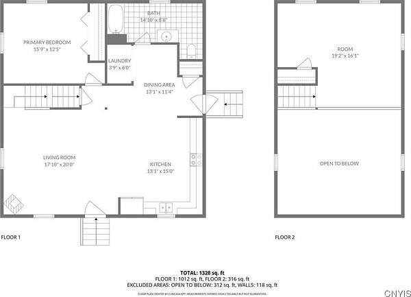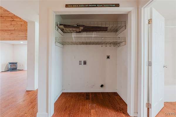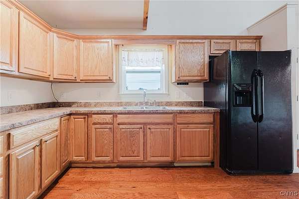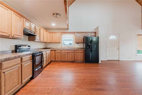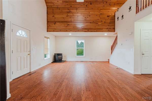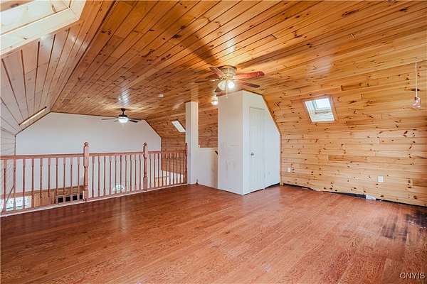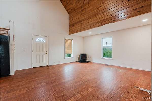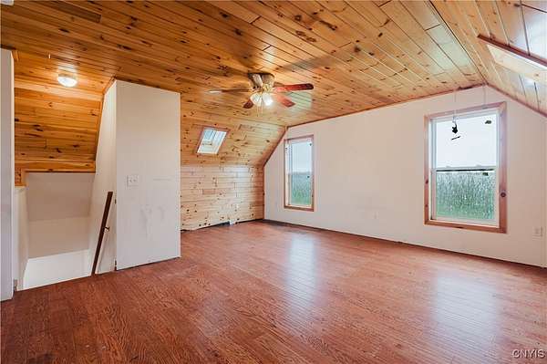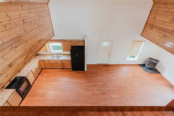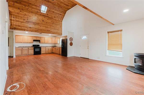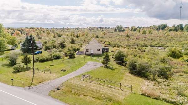This 2-bedroom, 1-bath home sits on a beautiful 5.45-acre parcel and offers a rare combination of open yard space and partially wooded acreage out back. Inside, the main floor features a smart, open-concept layout with a spacious living room, kitchen, and dining area that allows flexible use of space. Pinewood finishes on some walls and ceilings add warmth and character. Built in 2012, this home offers the benefit of a solid modern foundation, plumbing, and electrical systems, giving peace of mind and a reliable base for future improvements. The large loft-style primary bedroom overlooks the kitchen and living room, creating soaring two-story ceilings and an open, airy feel. The kitchen offers plenty of space with oak cabinetry, an electric oven/range, refrigerator, and hood. Natural light flows throughout, enhanced by skylights and nice hardwood floors. Beautiful brand new propane furnace in very clean crawlspace. A woodstove provides supplemental heat and provides extra charm in our north country winter months. Some cosmetic TLC will make this property shine. An existing foundation on the side of the house provides the opportunity for an addition or a large deck. Conveniently located near where NY-12 becomes Bradley Street, on the edge of Watertown and Brownville, this property offers a rare chance to own quality acreage with a home ready for your personal touches.