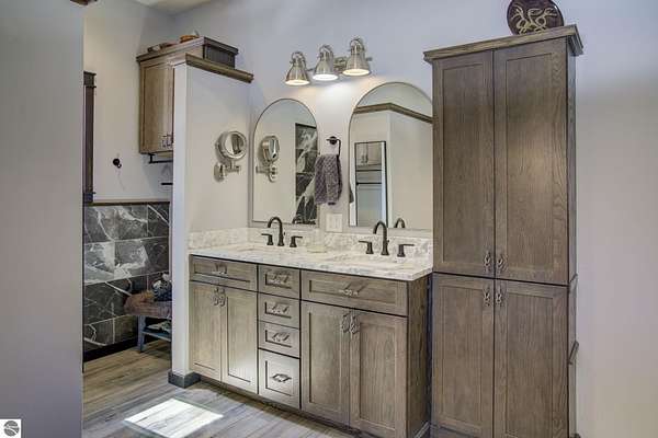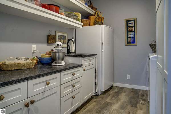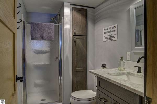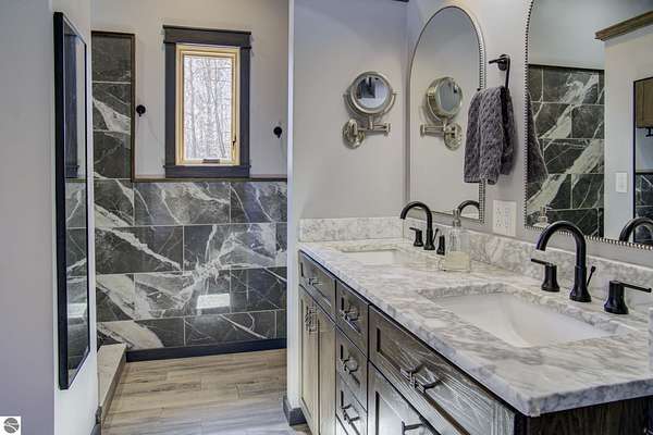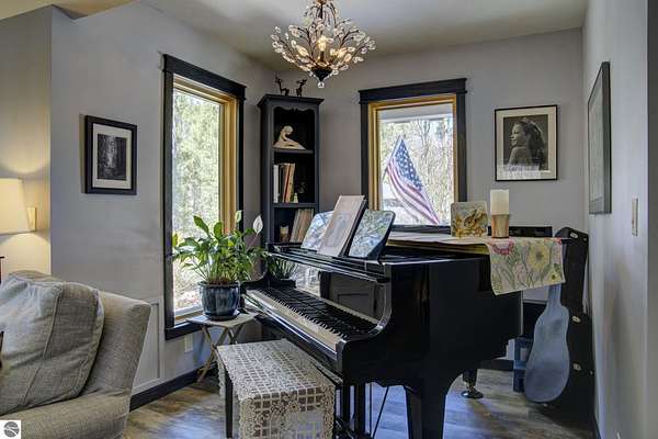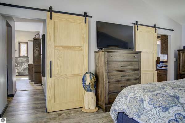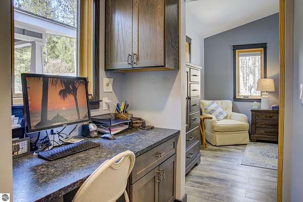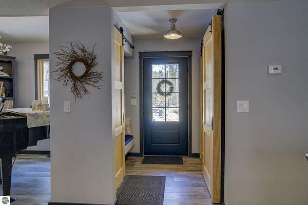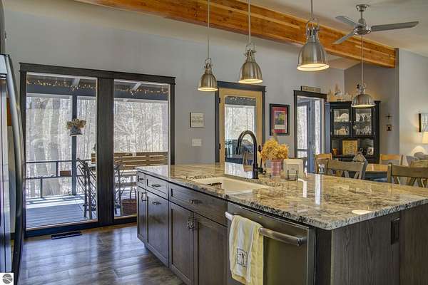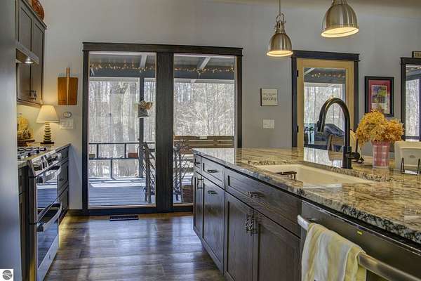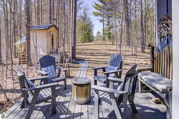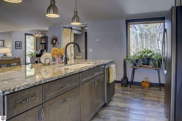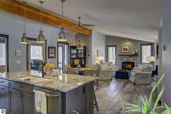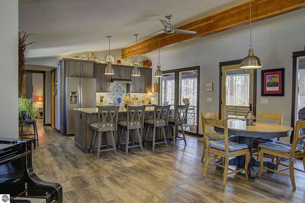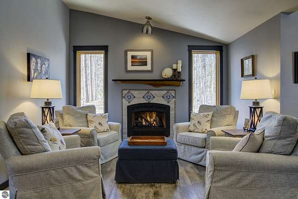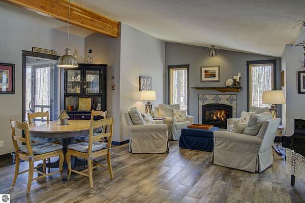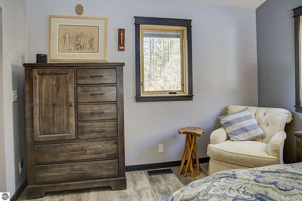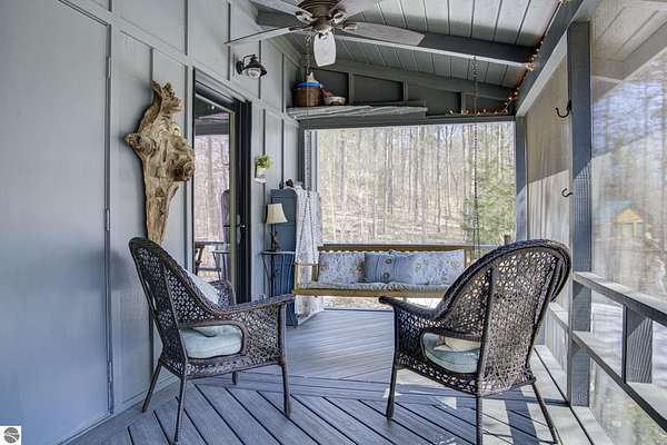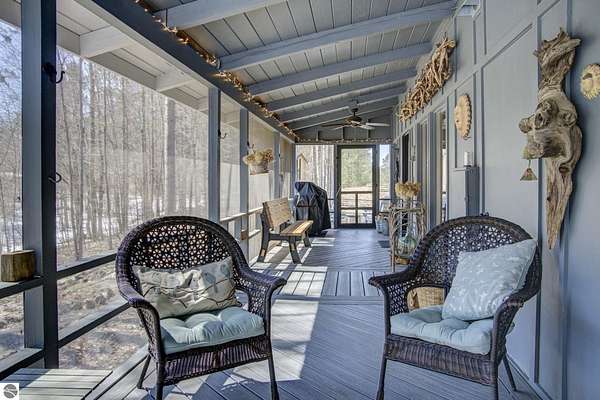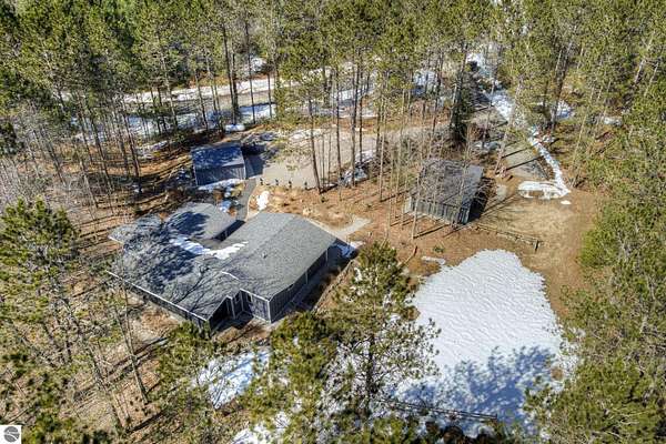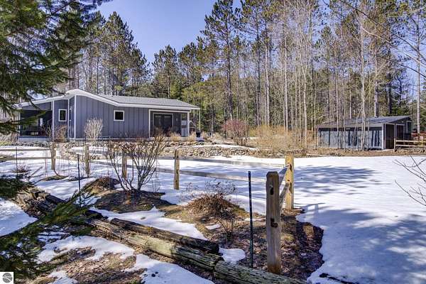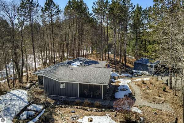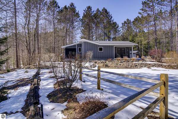 From the moment you step through the front door, you’ll know this is a dream home. Nestled on just over 8 acres in southern Leelanau County, this property checks many of the boxes on your wish list offering a comfortable 2-bedroom layout that lives much larger than expected. Inside, you’ll find LVP flooring throughout and a gorgeous kitchen featuring a spacious island, granite countertops and ample space for gathering. Just off the kitchen, a beautiful screened-in porch expands your living space during Spring, Summer, Fall. The living room offers a cozy gas fireplace and a unique bump-out—perfect for a reading nook or even a grand piano. The laundry and pantry area is both functional and spacious, complete with a prep sink & granite counters and lots of storage; Nearby, a built-in desk provides a convenient workspace. The primary suite is truly dreamy with French doors leading to a private screened-in porch overlooking the woods. The ensuite bathroom features a jetted tub, double sinks and a tiled shower. Bonus - full access to over 100 acres of common space & hiking trails in the adjoining Cedar Valley Ridge development. Additional highlights include vaulted ceilings with a wood beam, a wall of windows showcasing the surrounding natural beauty, beautiful trim and inviting spaces designed for both relaxing and entertaining. The property also includes a 2-car detached garage and a pole building with power, room for 2 cars & an add on for toys, lawn equipment etc. 30amp RV hook up. No HOA. The wood mantle in living room & outdoor sauna are Excluded.