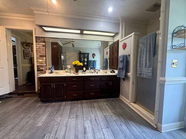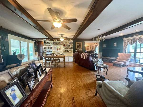 Beautiful home and surroundings waiting for a family like yours. The 6.7 acres is grass land with barn, hay barn, gazebo, fenced chicken coop along with some beautiful trees. New roof in 2024 and recently pressure washed the outside of the house. Has garage, back deck and patio area. Orkin Termite and pest contract with outside bait system. Central heated and cooled. Nice driveway from the Berry Chapel Road. The inside of the house is lovely, Has two beautiful stained glass in kitchen and beautiful marble. Tile in kitchen and hall, only 2 bedrooms has carpet, other rooms has wood flooring. Master bedroom has Extra Large bathroom with marble shower, faucets and counter top. Master bedroom also has adjoining computer room. Living area is very large has two sitting areas with dining area and nice, big, fireplace with gas logs. Nice kitchen with lots of cabinets This home is beautifully designed
