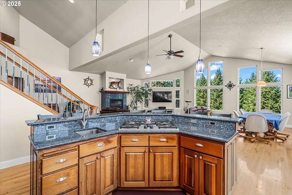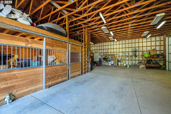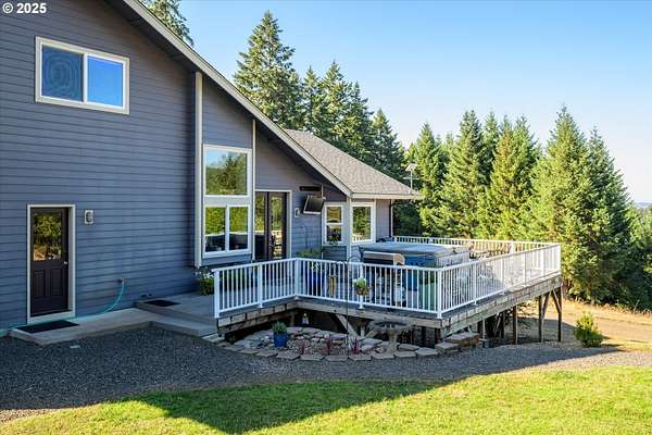 Welcome to 27067 Pickens Rd - a private retreat tucked away on 10 serene wooded acres at the end of the road. This light-filled home offers 4 bedrooms plus a possible 5th, 3.5 bathrooms, and breathtaking views from nearly every window. The heart of the home is the amazing kitchen, featuring an inviting eating bar, Brazilian cherry cabinets, and an open concept kitchen-living room design perfect for entertaining or family gatherings. Finish the lower level 733 square feet as you like w/the potential space for studio/workshop, exercise area, office space, wine cellar, living space, cinema room, storage space. Concrete flooring, garage door header for daylight entrance & wired for Home Entertainment Hub. Step outside and enjoy the peaceful natural surroundings which include a large deck w/gas bbq hookup and hot tub, an upper deck w/area for a pool, fire pit, 36x48 barn/shop with 3 stalls-ideal for animals, hobbies, or extra storage, and ample parking. Also you will find an oversized garage w/2 water heaters, water system & tool storage. Next to the garage is a 50 amp RV hook-up and sewer. With its blend of privacy, functionality, and beauty, this property offers the best of country living close to Eugene and Veneta.
