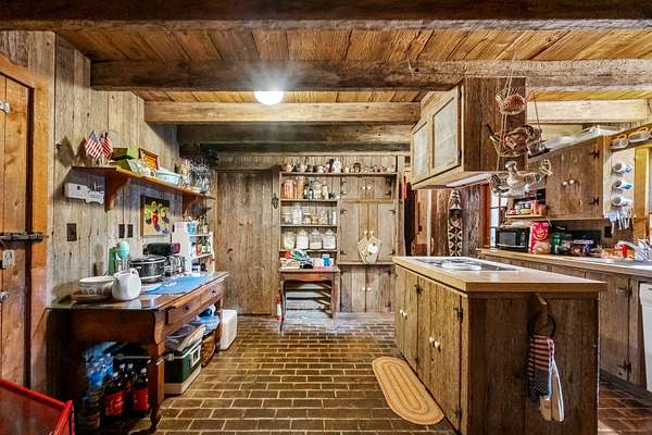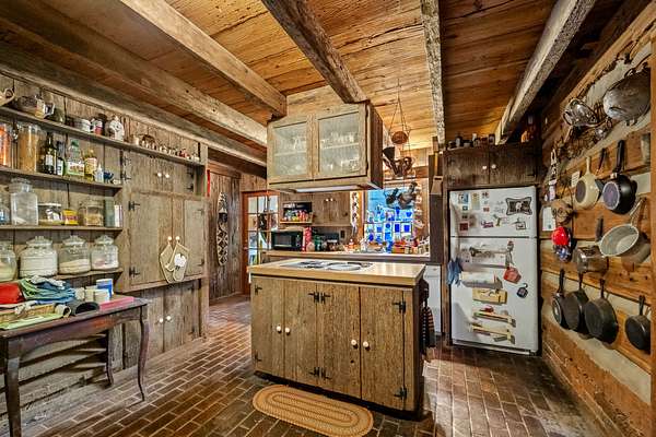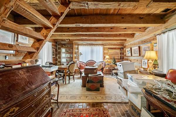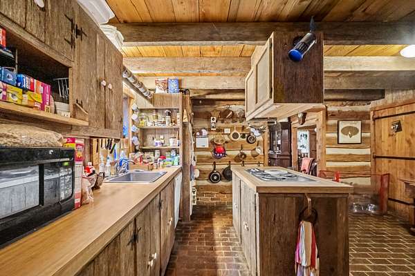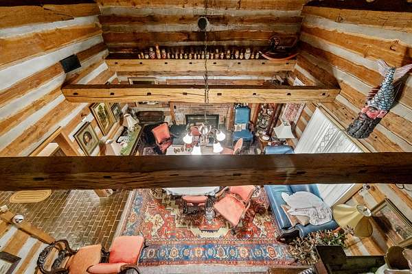 The home features exposed beams, fireplaces, and warm wood finishes throughout, creating a true cabin feel. The kitchen includes an island and opens into inviting living spaces ideal for relaxing or entertaining. Multiple loft areas provide flexible space for guests, office, or additional sleeping quarters.