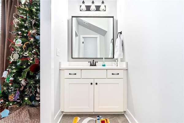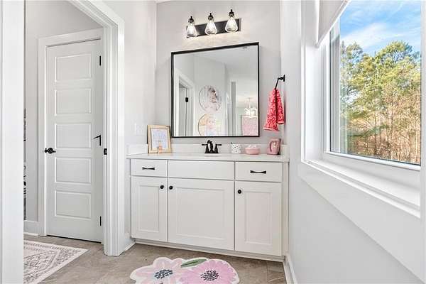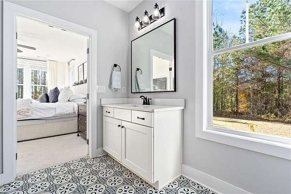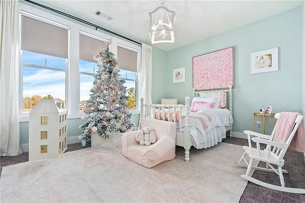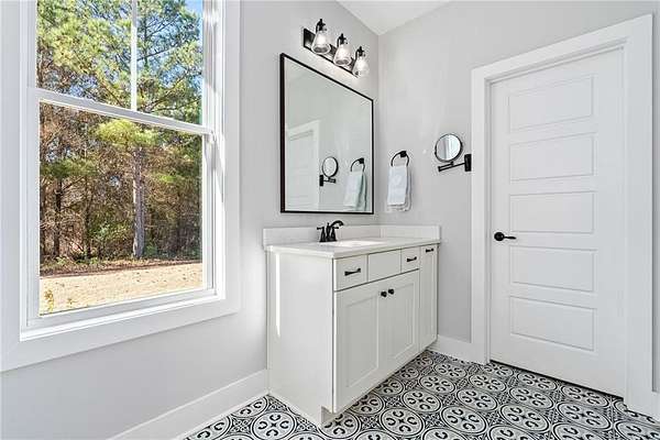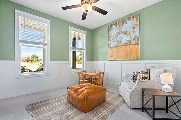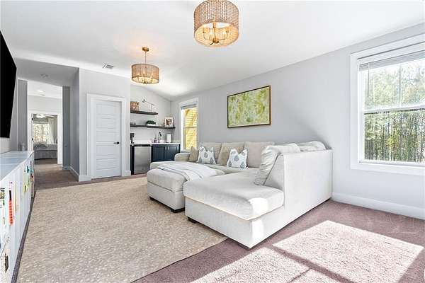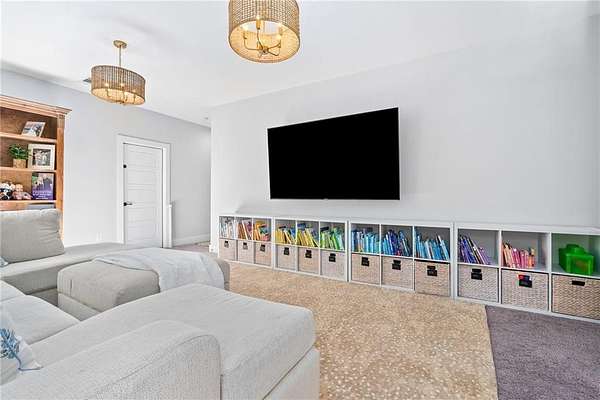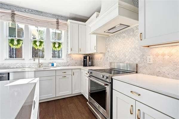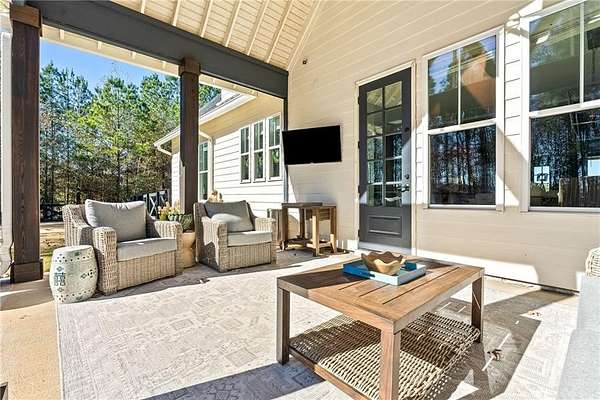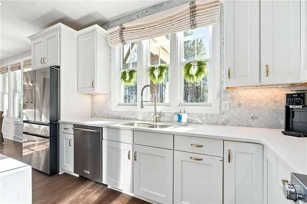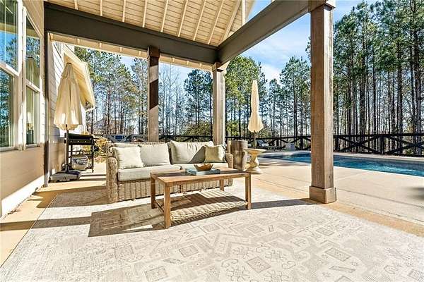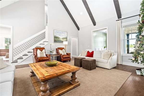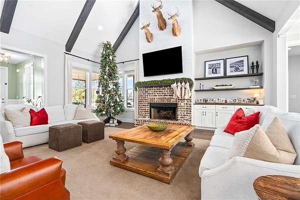 Inside, natural light pours through windows galore, showcasing peaceful views of the property from nearly every room. The gourmet kitchen stuns with marble backsplash to the ceiling, a massive waterfall-edge island, structured pantry shelving, soft-close drawers, and under-cabinet lighting. The living room features a vaulted ceiling with wood beam accents, a cozy fireplace, and custom built-ins--creating a warm yet elevated gathering space.