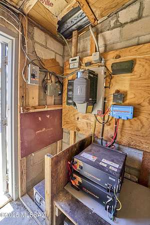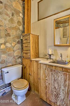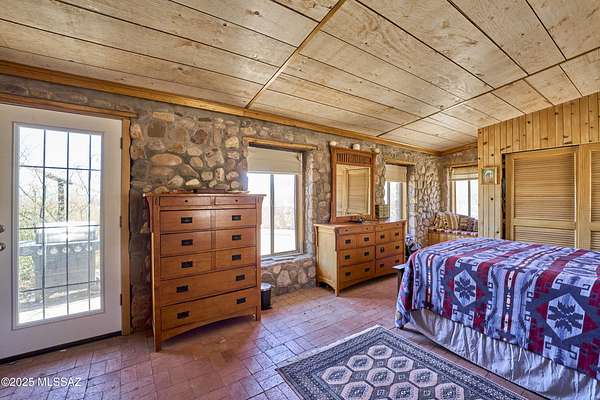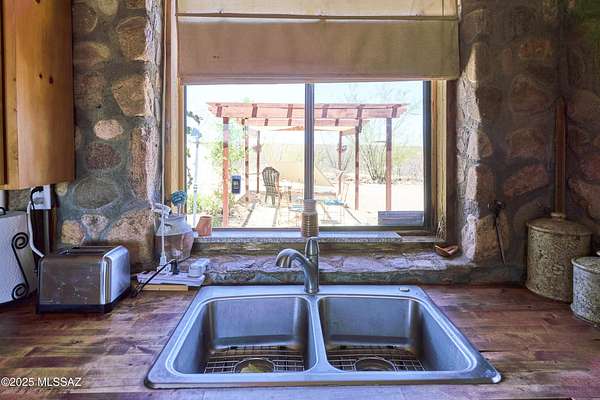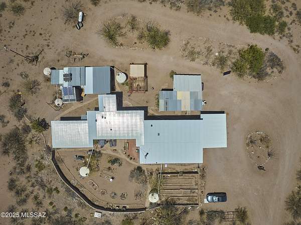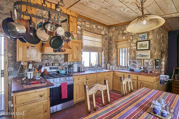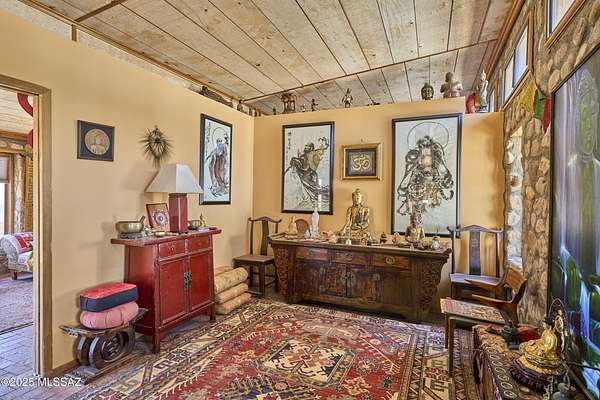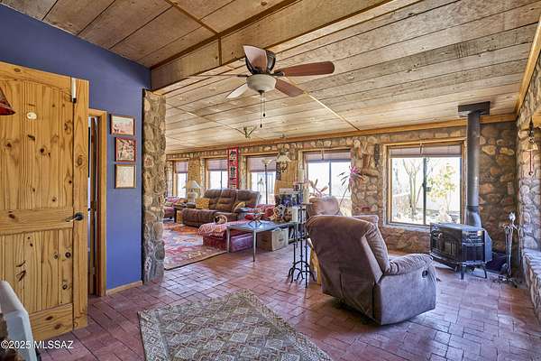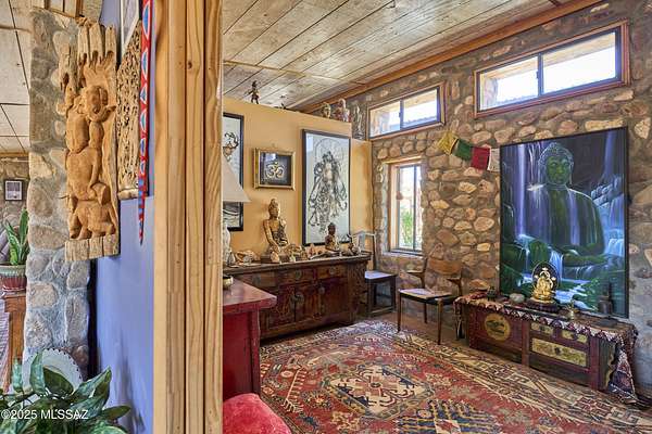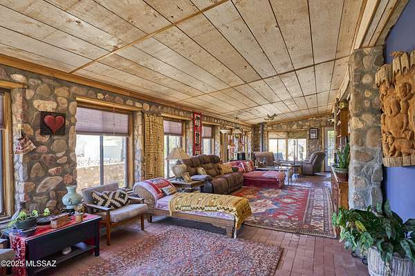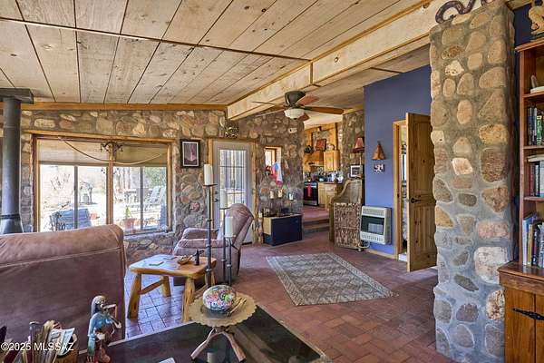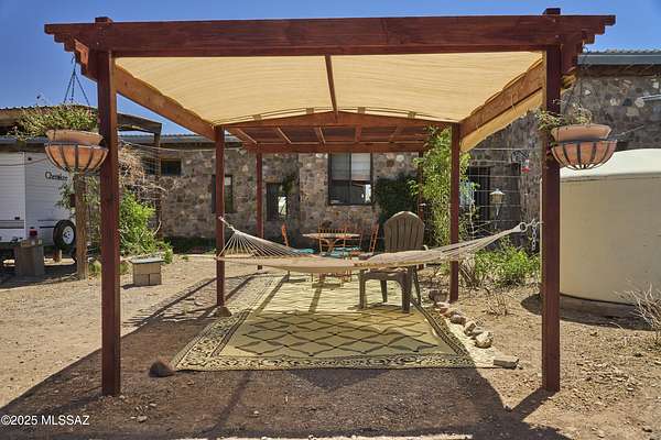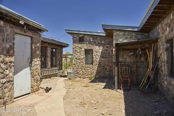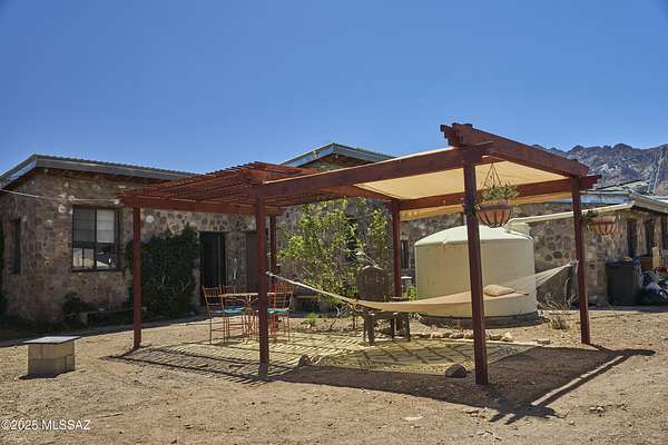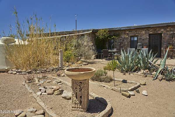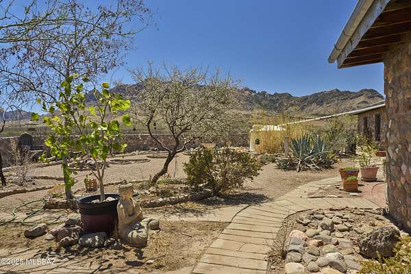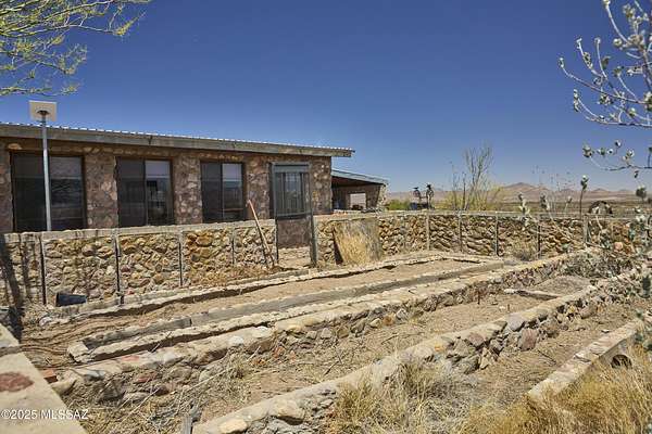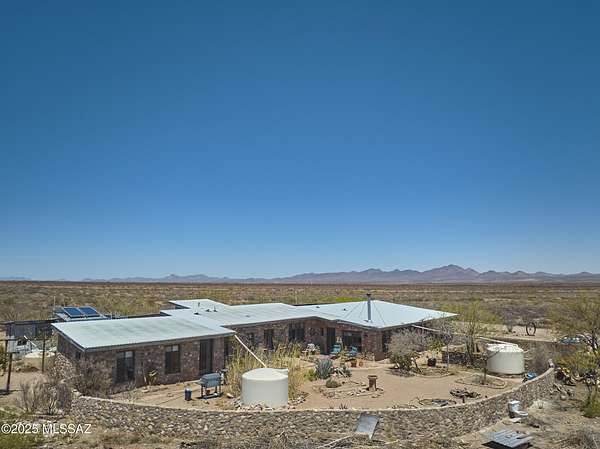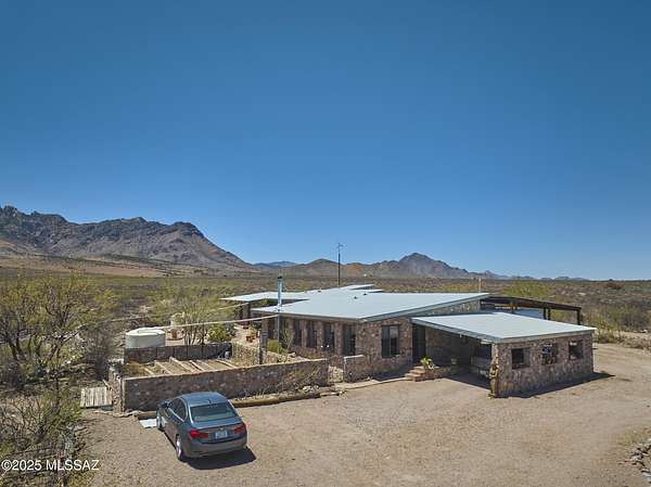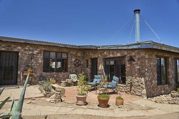 Off-grid living meets rustic elegance in this furnished one-of-a-kind rock home and workshop on 80 fenced acres of high desert! Powered by solar & wind, with a rainwater harvesting system & retention pond, this sustainable retreat is designed to blend seamlessly with the natural surroundings. The home has a metal roof, a beautiful courtyard enclosed by stone walls, and three carports. Outdoor living is a highlight here, with spaces to relax, reflect, and watch the wildlife roam. Inside, you'll find unique craftsmanship throughout, with warm, organic textures and a layout that invites both comfort & creativity. The guest room is a well-loved short-term rental, offering great income potential for astronomy, birding, or space for guests. Short Drive to Rodeo NM, Portal, and Cave Creek Canyon