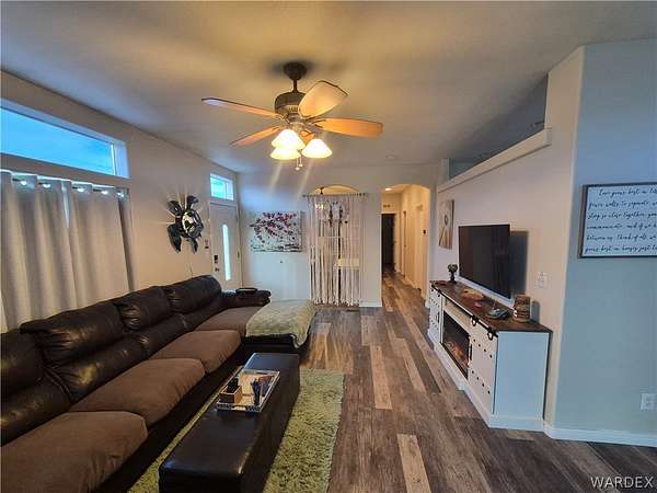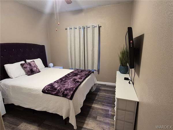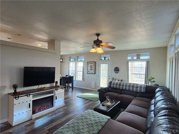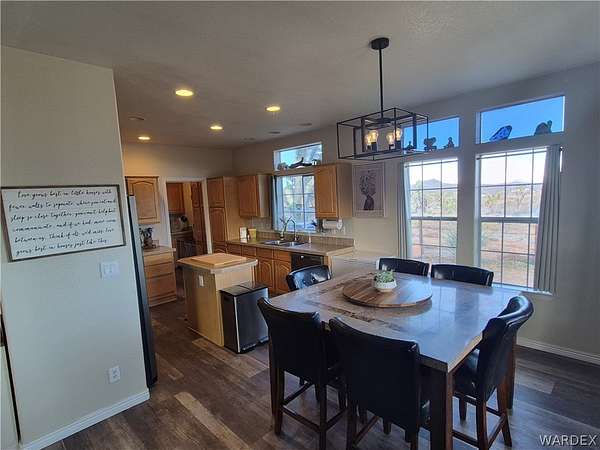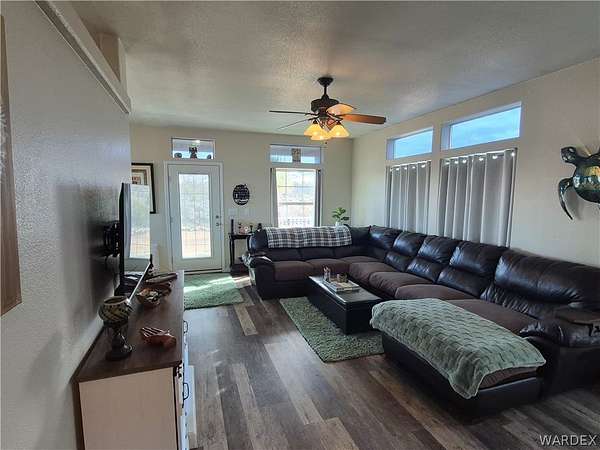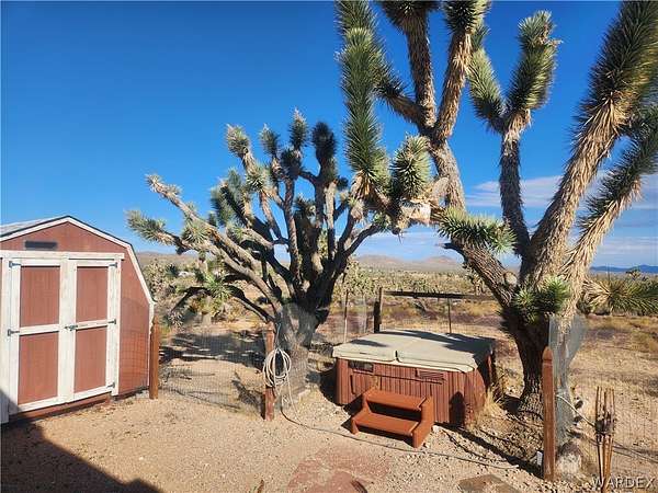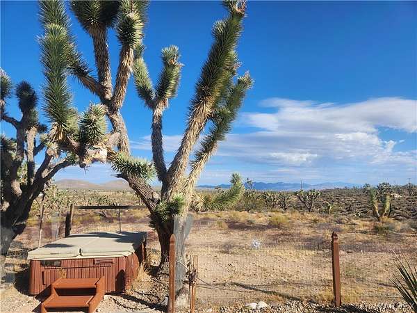 Turn-Key Desert Retreat/Income Potential Property. Enjoy majestic views from this Santa Fe style 2-bedroom, 2-full bath home with a den/office that could possibly serve as a third bedroom, offering approximately 1,401 sq. ft. of living space on a 3.76-acre lot bordering BLM land, providing privacy & endless open desert views. Located in Meadview between Lake Mead & the Grand Wash Cliffs, this hidden treasure in Northwestern Arizona is nicely furnished, beautifully decorated, move-in ready, & recently renovated with approximately $20,000 in upgrades, freshly painted inside/ooutside, New Cookware/Dishes, stove, microwave, fridge, dishwasher, stainless steel kitchen sink, new bathroom faucet updates,making it ideal for full-time living, snowbirds, or a potential short-term rental investment. The partially open kitchen includes an island, dishwasher, disposal, microwave, electric oven/range, refrigerator, pantry, & casual dining area. The spacious living room features a cozy pellet stove and plenty of room to entertain family/ friends. The primary bedroom offers a large closet & en-suite bathroom with dual sinks, garden tub with a view, separate walk-in shower, & and a private toilet area. The laundry room includes washer, electric dryer, water heater, & a convenient separate entrance with access to both the kitchen & guest bathroom. Just off the living room is a covered patio along with an uncovered patio & fenced backyard area, perfect for pets & enjoying the ever-changing desert sunsets and sunrises. Property includes a water pump house connected to a 3,000-gallon underground water storage tank, hot tub, utility building/storage shed, garage/RV structures including a 20 x 36 carport, & landscaped backyard areas. Located a short distance from downtown Meadview where you will find restaurants, gift shops, ice cream shops, Trading Post, market, VFW, beauty/nail salon, local businesses, bar, & gas station. Enjoy nearby Lake Mead for boating & water sports, miles of ATV/off-road trails, or take a scenic drive through the Joshua Tree Forest on your way to the Grand Canyon Skywalk approximately 40 minutes away. Laughlin & Las Vegas is about two hours away for additional entertainment. As a member of the Property Owners Association, enjoy access to community pool, putt-putt golf course, indoor/outdoor shuffleboard, pool tables, ping pong, tennis/pickleball court.