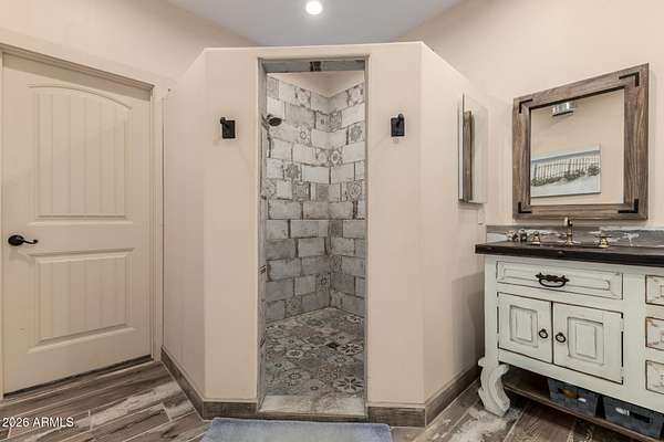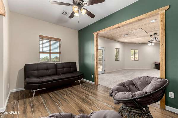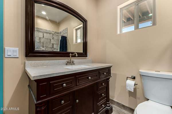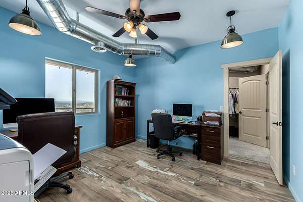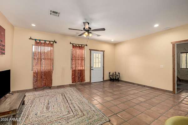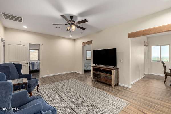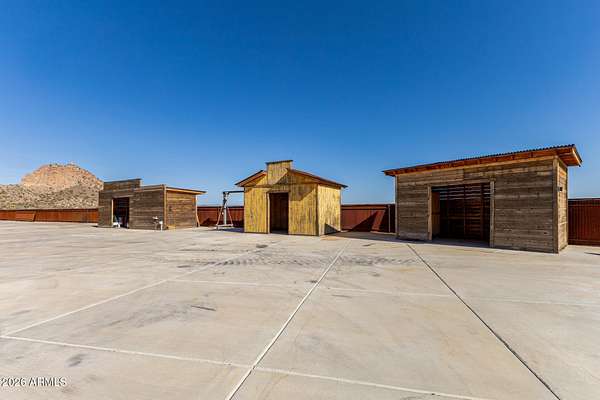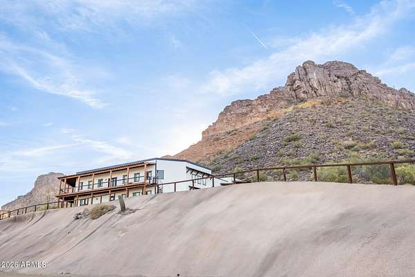 Reintroduced with a refined exterior, this modern Western estate offers exceptional scale, privacy, and architectural presence set against the dramatic San Tan Mountains. Situated on ~4 acres, the cohesive compound spans over 9,000 sq ft of combined living and functional space, featuring a thoughtfully designed main residence, multiple guest accommodations, and an expansive RV garage and shop with hookups. The updated black-and-white palette delivers a clean, sophisticated aesthetic that complements the surrounding desert landscape. Expansive covered patios, wraparound balconies, and inviting outdoor spaces create a seamless indoor-outdoor lifestyle, ideal for entertaining and multi-generational living just minutes from Queen Creek amenities while offering a rare sense of seclusion! NO HOA restrictions this property delivers freedom rarely found this close to town. Bring your dreams! Secluded and serene, yet just 15 minutes from Queen Creek's dining, shopping, and amenities this is not just a home, it's an opportunity to own something truly exceptional.