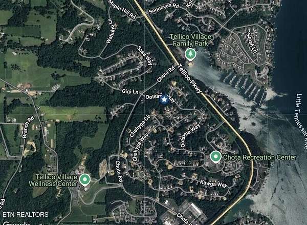 From Lenoir City, take SR 444 (Tellico Parkway) south to Chota Rd in Tellico Village. Turn right on Chota Rd. Turn right on Ootsima Way. Property on right. Sign in yard.