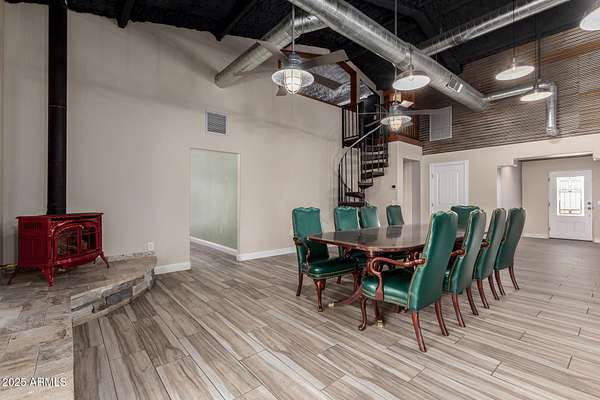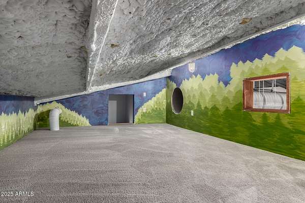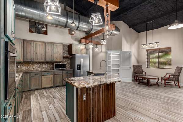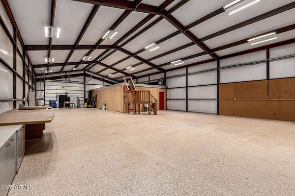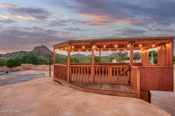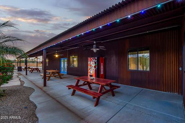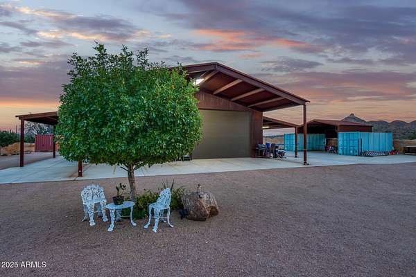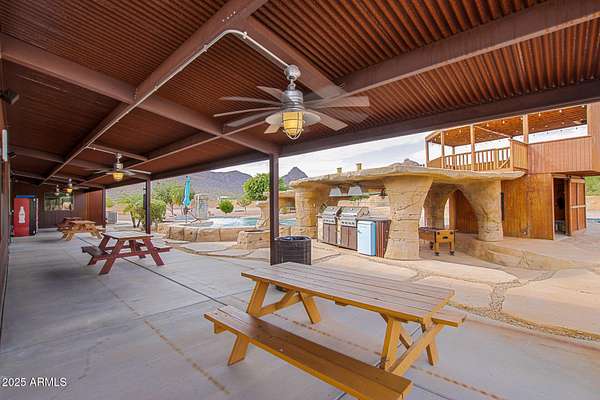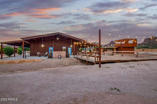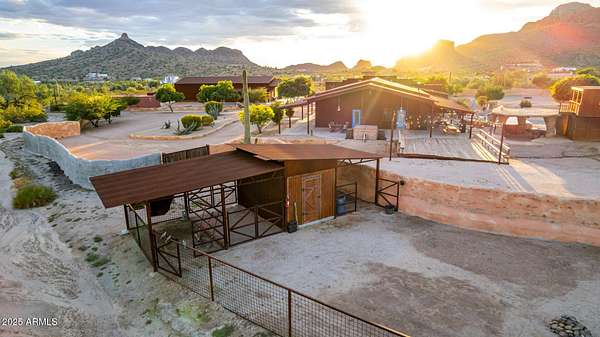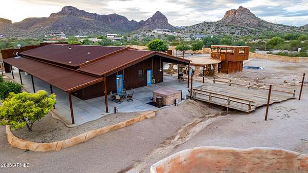 This one-of-a-kind property is truly an entertainer's dream. Set on 3.5 acres with sweeping mountain views, the custom home was built with striking corrugated steel siding and offers incredible versatility inside and out. The main residence features 4 bedrooms and 3 bathrooms, complemented by a separate 1-bedroom, 1-bath guest house with its own kitchen and living room-ideal for hosting family or extended stays. An impressive 3,212 sq. ft. outbuilding includes an 800 sq. ft. office and full bath, perfect for business, hobbies, or extra storage. Adding to the home's unique character, the upper level includes two concealed rooms and a custom play area accessed by crawl spaces or a built-in rock-climbing wall. Step outside and you'll find a resort-style backyard designed for fun and relaxation: a custom infinity pool with waterfall, grotto, and observation deck; $15k+ in Jellyfish permanent LED color changing holiday/security lighting; a volleyball court; dance floor; and covered patios that wrap around the home. The entire property is enclosed by a custom shotcrete wall with four gated entrances, offering both security and privacy. For horse lovers, the property includes a tack room, two stalls, and fully enclosed stables and corrals for optimal comfort and safety. There's also workshop space in the cooled garage, RV hookups, and a pneumatic pressure system for added convenience. Don't miss the mature fruit trees scattered across the property. All of this comes with 360 degrees views you'll never tire of yet you're less than 20 minutes from shopping and dining in Queen Creek. A phenomenal opportunity to enjoy luxury living while also running a business from home with the oversized garage and apartment.