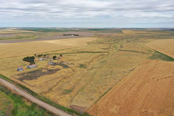 Old uninhabitable home on property. Old grain bins and quonset. Well and electric.