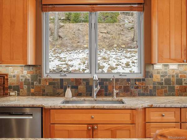 The main level features vaulted ceilings, an open floor plan, and a wraparound deck that brings the outdoors in. Hardwood floors, granite counters, slate stonework, and stainless KitchenAid appliances anchor the kitchen. French doors extend the living space onto the deck, ideal for gatherings that feel relaxed and connected to nature. Nearly every room was positioned to take advantage of its surroundings.