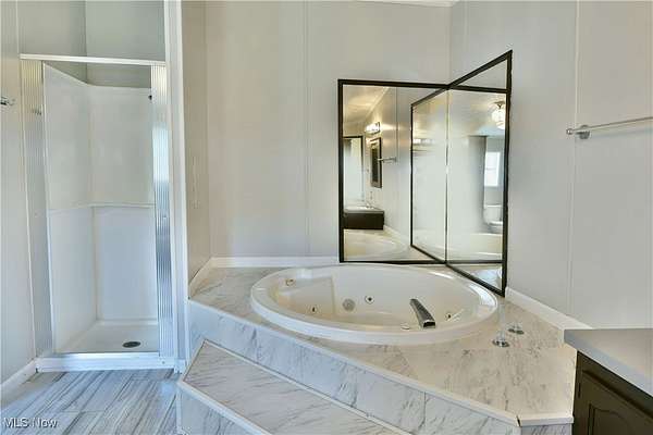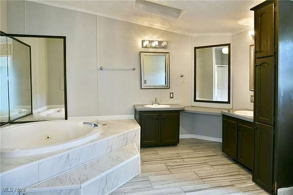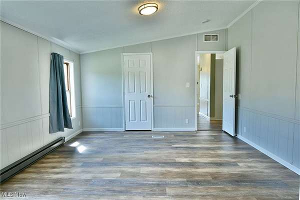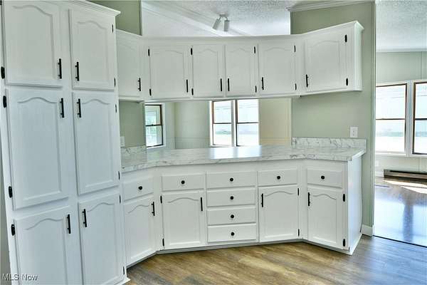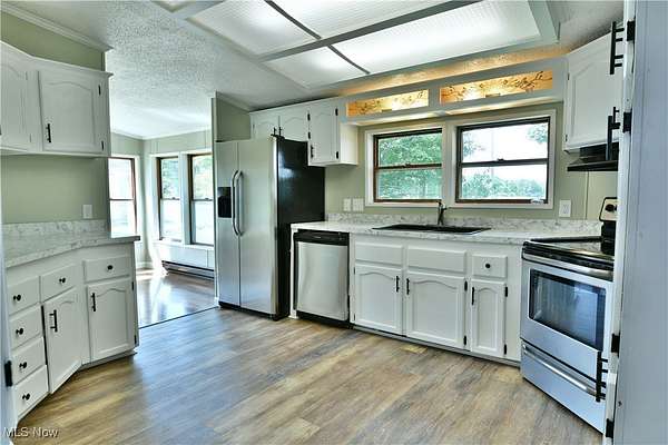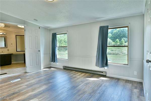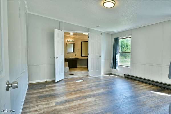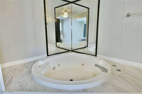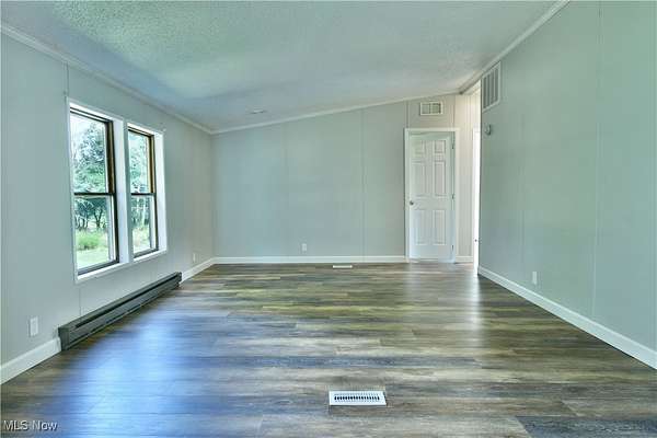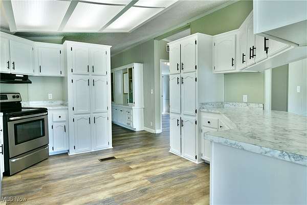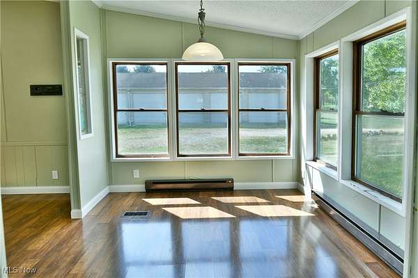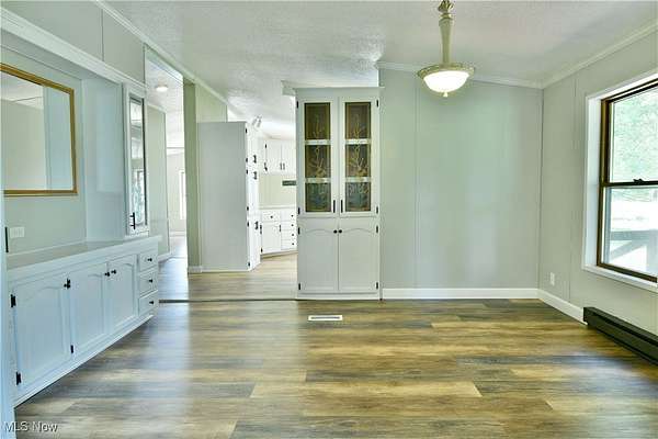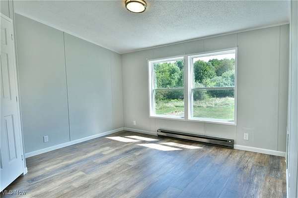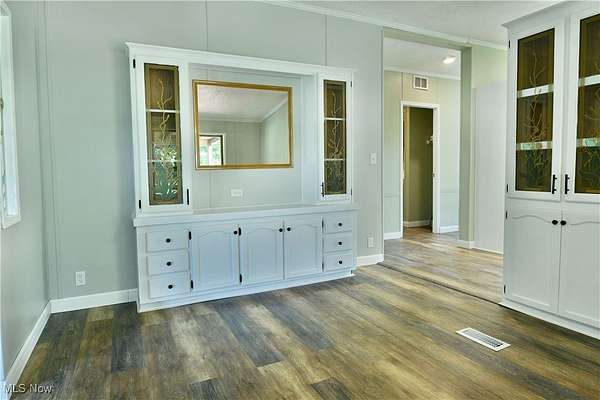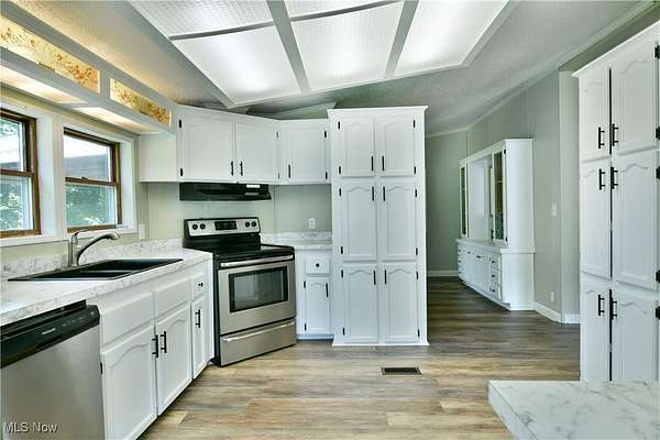 Get away from the hustle and bustle and enjoy the scenic rural views of this fantastic Vienna estate! This unique property includes a remarkable, 20 bay storage garage for all your potential needs or as a built-in business opportunity for rentals. Kick back on the covered front porch and ponder the possibilities as you peer from the leaves of the privacy veiled trees. Inside, the manufactured style ranch is set on a full foundation, adding to its available living space. A spacious living room enjoys hardwood styled flooring that continues throughout the first floor. Two sizeable bedrooms delight with large windows at the far end as they accompany a tastefully updated full bath and its glass tile accented vanity. Central dining spills into a must-see kitchen with a host of storage solutions and a pass -through serving window, brimming with country flair. A window-lined formal dining area makes every meal a visual treat as the fireplace laden family room looks on. The oversized master bedroom suite opens to an extravagant full bath with mirror lined, whirlpool tub, dual vanities and a stall shower. First floor laundry leads out into a rear sunroom and basement access.