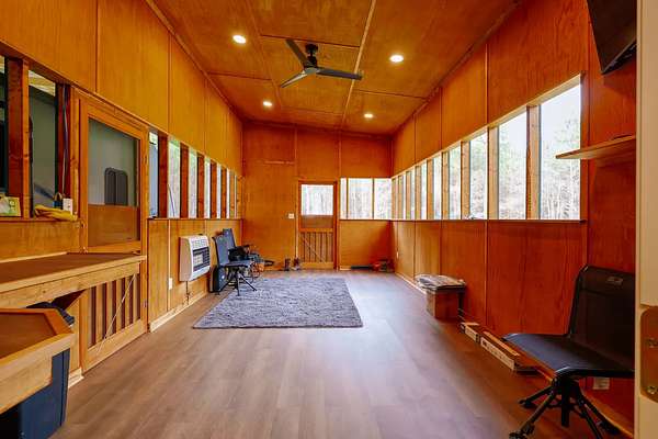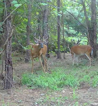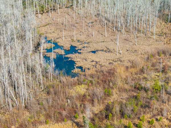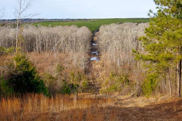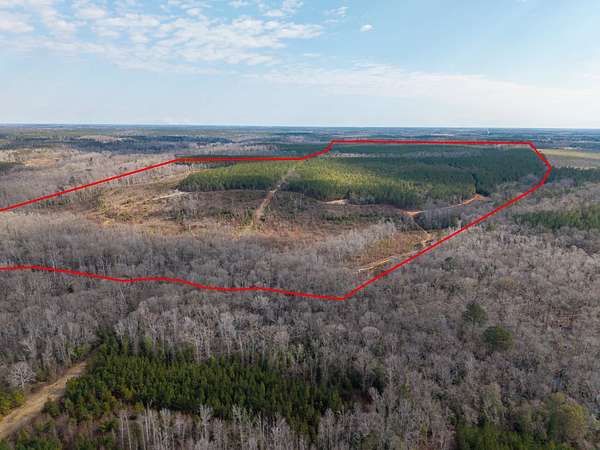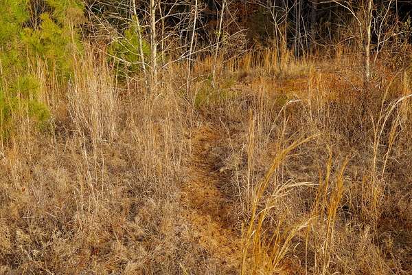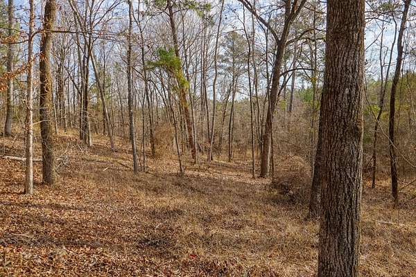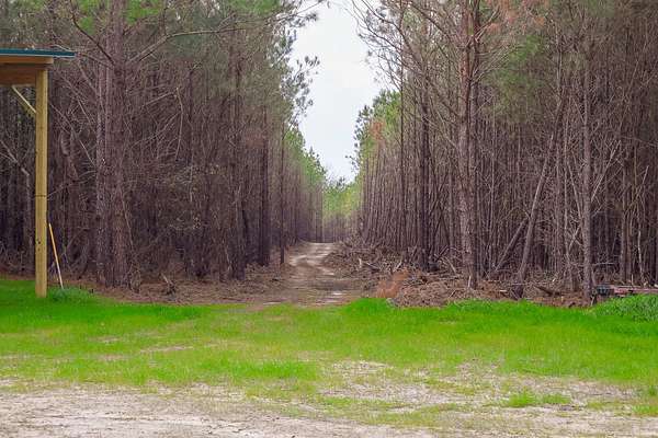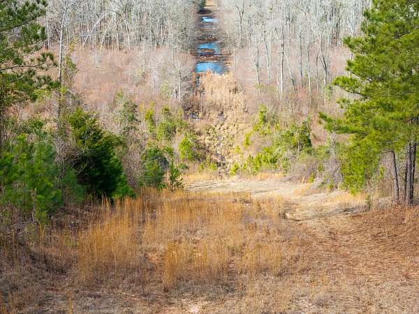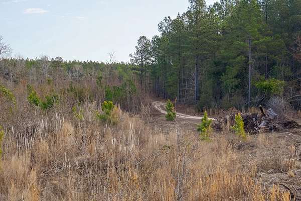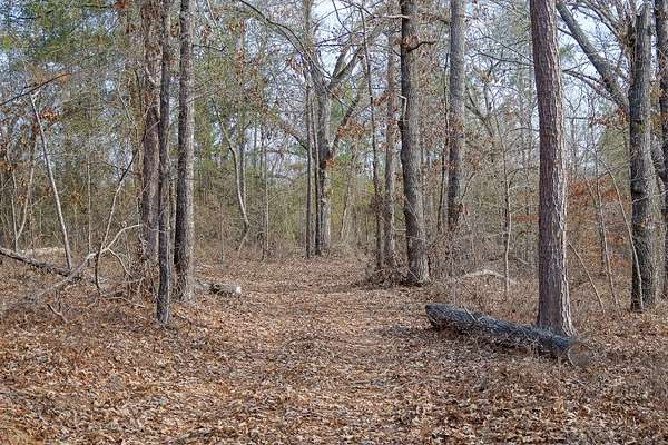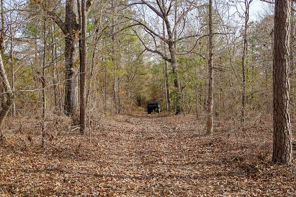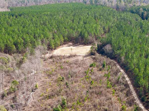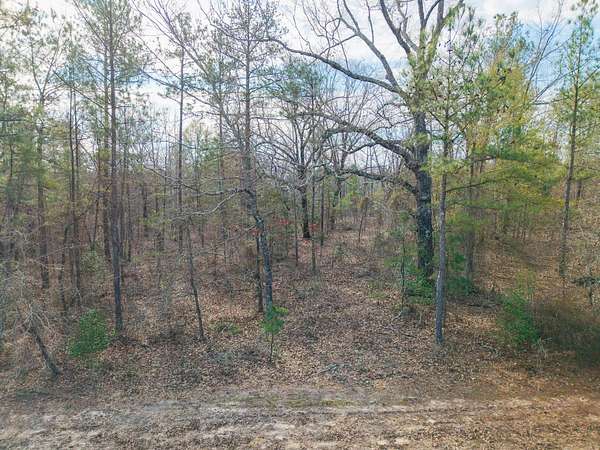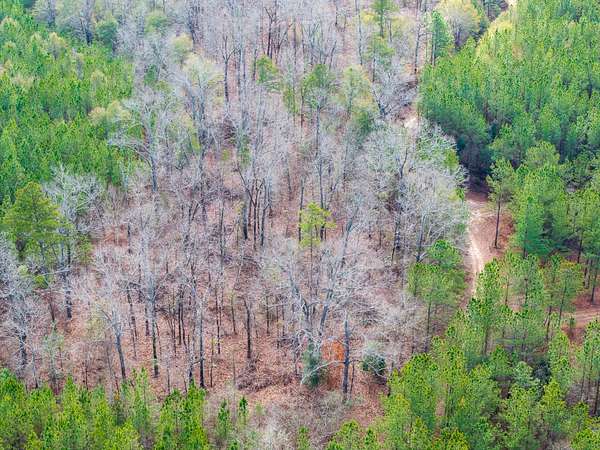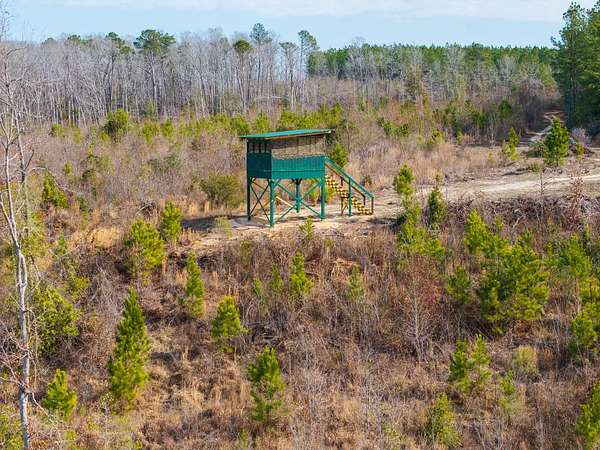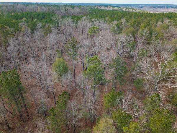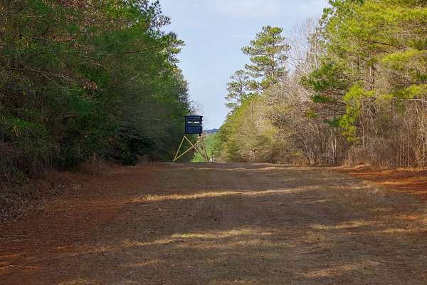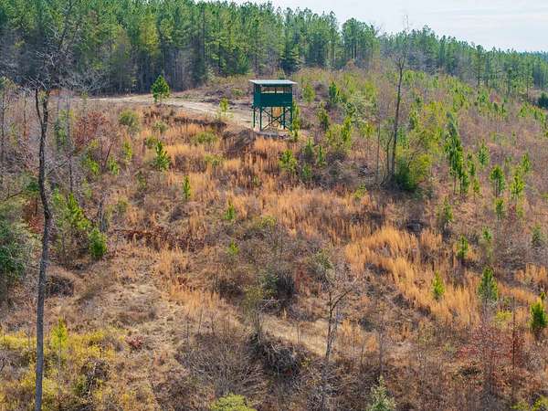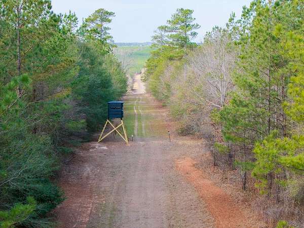 The property offers exceptional wildlife habitat with eight established food plots and blind locations that have produced quality white-tailed deer. A 10x10 elevated tower stand is positioned on a bluff overlooking Clear Creek and scenic flooded timber that regularly attracts waterfowl. The diverse habitat includes 105 acres of 10-year-old planted pine, 82 acres of 15-year-old planted pine ready for first thinning, and 47 acres of upland and bottomland hardwoods. The upcoming thinning provides near-term income potential while enhancing wildlife habitat and visibility. Mature hardwood ridges with mast-producing oak species support strong deer and turkey populations across the rolling terrain.