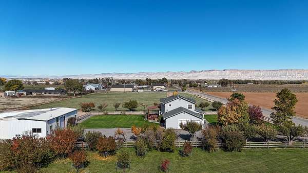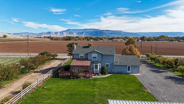 Beautifully maintained 4-bedroom, 3-bathroom single-family home on 4.37 irrigated acres with unobstructed views of the Grand Mesa and Mt. Garfield. Home offers 2,220 sq. ft. of living space with newer flooring, paint, and roof. Kitchen features granite countertops and ample cabinet space. Two spacious living areas provide room to relax and entertain. Property includes a 60' x 43' detached heated shop with bathroom, hot/cold water, refrigerated meat locker, and abundant storage-ideal for equipment, projects, or hobbies. Acreage is irrigated with gated pipe including two alfalfa valves and is currently planted in alfalfa/grass hay. Fruit trees and mature landscaping enhance the outdoor setting and line both sides of the home. Additional features include RV parking, two 30-amp RV plug-ins, and an RV dump, making this property ready for guests or travel convenience. Ample space and infrastructure make this an excellent horse or hobby farm property. Enjoy peaceful country living just minutes from town conveniences!