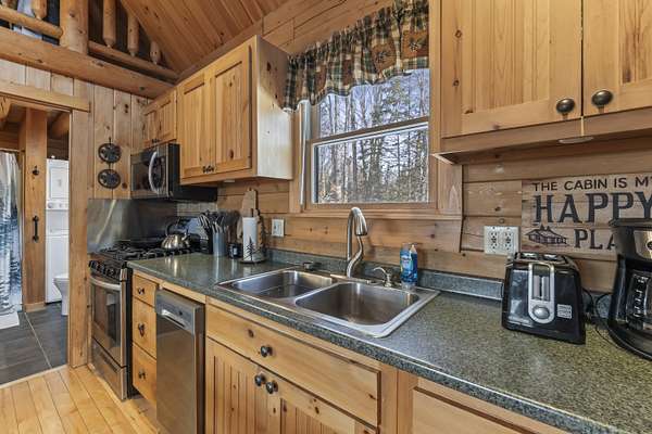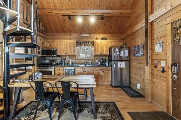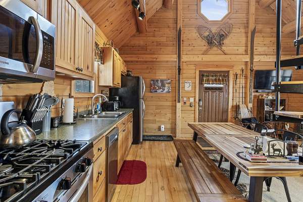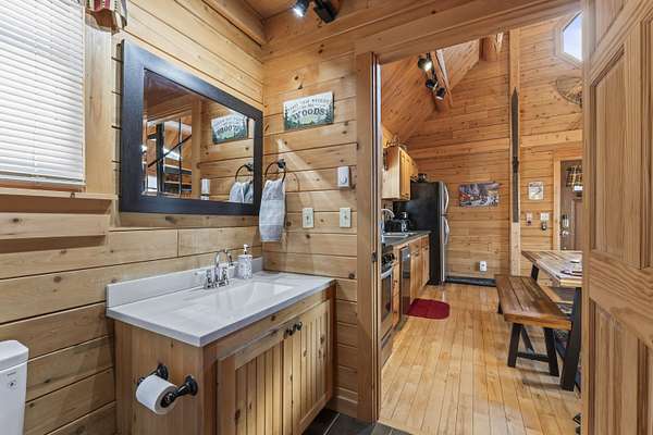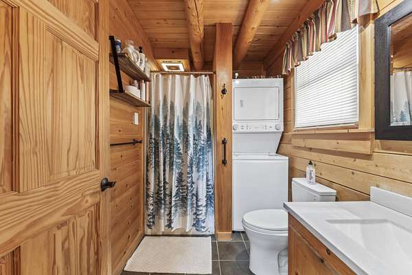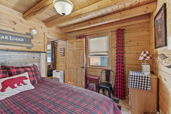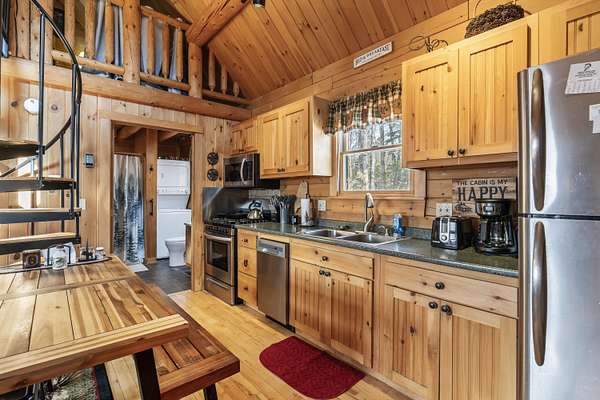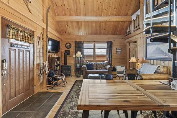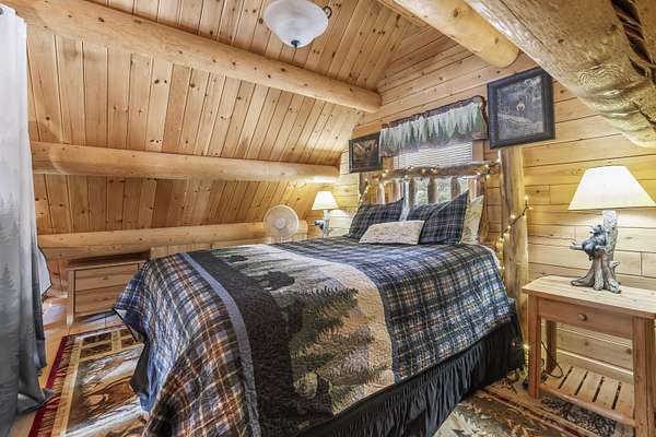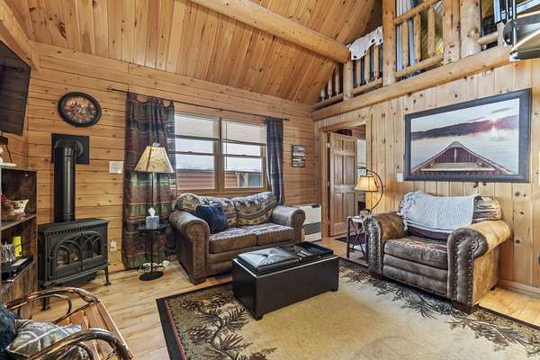 Step inside to an inviting open-concept living space where rustic log architecture meets modern comfort. The main level is designed for effortless ''one-level living,'' featuring a cozy kitchen and dining area, a primary bedroom, a full bathroom, and laundry facilities. A spacious bonus loft provides additional sleeping quarters, making it ideal for hosting family or rental guests.