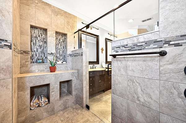 - Built-In Features, Ceiling Fans(s), Crown Molding, High Ceilings, Kitchen/Family Room Combo, Open Floorplan, Primary Bedroom Main Floor, Solid Surface Counters, Split Bedroom, Stone Counters, Thermostat, Tray Ceiling(s), Walk-In Closet(s), Window Treatments