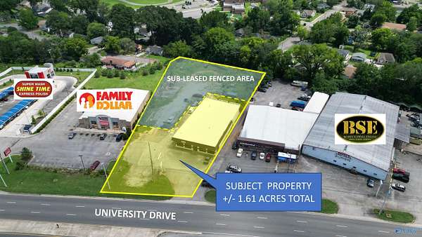 Est $4,676/moFOR SALE OR LEASE in Huntsville, AL. 2733 University Drive. 7,200SF commercial building with a new roof & ext. paint & 116ft. of road frontage. 4,800sf of warehouse & 2,400sf of retail/office space. This property includes a large fenced area of over a half acre to east side of the building which is currently subleased to a third party. A loading dock with a 12' drive-in door, an office space and a retail showroom round out this desirable property. Great area with many well established businesses nearby! Lease price $11/SF.