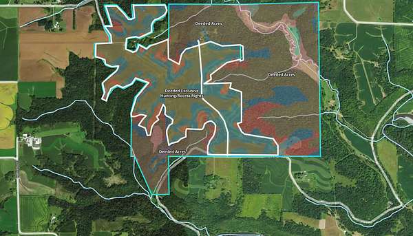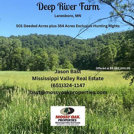 Deep River Farm is a legacy holding near Lanesboro, Minnesota, in Fillmore County, offering 501.51 deeded acres plus perpetual hunting rights on an additional 354.31 adjoining acres of rotated cropland. The deeded timber surrounds the exclusive hunting-rights ground to create an uncommon mix of secure cover and reliable food sources-an ideal recipe for world-class whitetail habitat in a region celebrated for producing 200+ class bucks. This hunts like a 900 acre farm - nearly unheard of in this part of the midwest. It is rumored that this is the largest contiguous tract of timber left in Fillmore County.