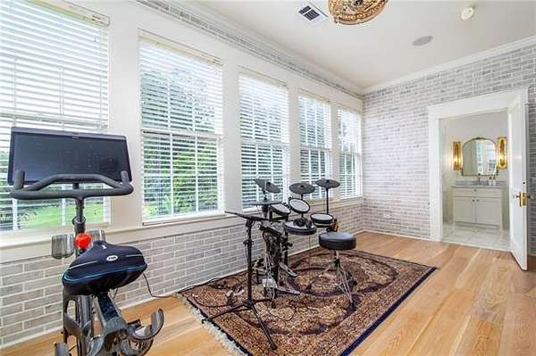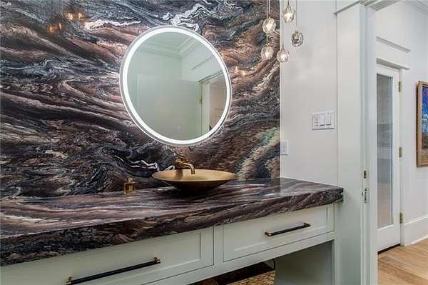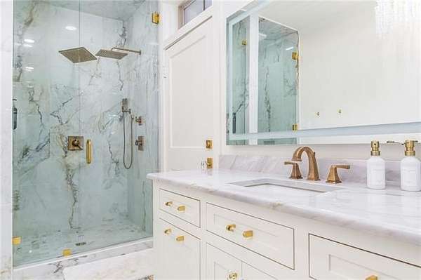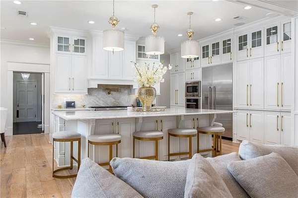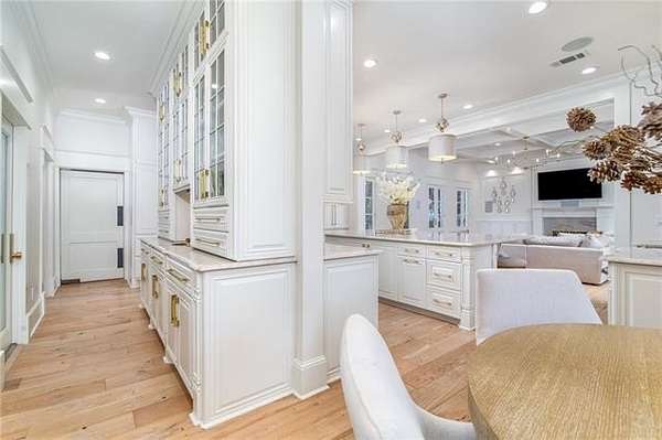 The chef's kitchen is a culinary dream, featuring top-of-the-line Thermador appliances, including a gas range, double ovens, and a steam oven. The dedicated wine cellar and a butler's pantry leading to the formal dining room add an extra touch of sophistication, making it perfect for entertaining. Adjacent to the dining room, the main foyer grants access to a stunning cypress study, a sunroom, and a billiards room. Notably, home is adorned with opulent finishes like gold hardware, crystal knob from esteemed brands Emteck and Nostalgic Hardware, complemented by Emtek abd Richelieu cabinet and drawer pulls. Property also features,14 slabs of premium 3 cm Taj Mahal quatzite