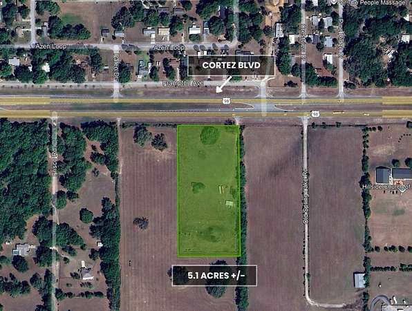 Rare 5.1-acre fenced parcel with Public Utilities and Electricity available, located directly on Cortez Blvd (SR-50) in Brooksville and Not in a Flood Zone. Zoned AG, this property allows a Single-family, Mobile, Modular, or Manufactured home, plus accessory structures such as barns, workshops, garages, and equipment storage buildings (per county setbacks). Horses, livestock, crops, and agricultural use are permitted, making it ideal for a private residence, a Hobby Farm, an Equestrian property, or an Income-producing Agricultural venture. No HOA or CDD, giving you full control of the land for your plans and long-term goals. Prime location with excellent exposure on a major corridor near I-75, US-301, and the Suncoast Parkway, offering strong potential for future appreciation or development. Centrally located just 45 minutes to Tampa, 1 hour to Orlando, and 1 hour to Ocala. Financing available with as little as 20% down for qualified buyers.