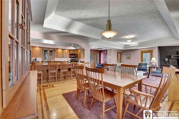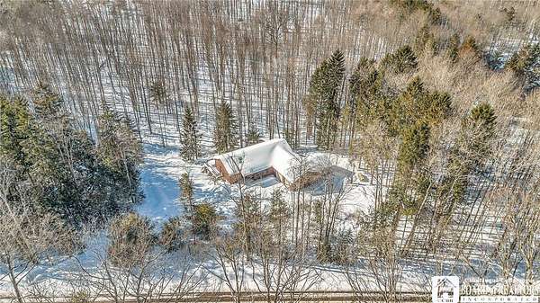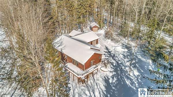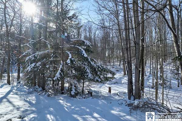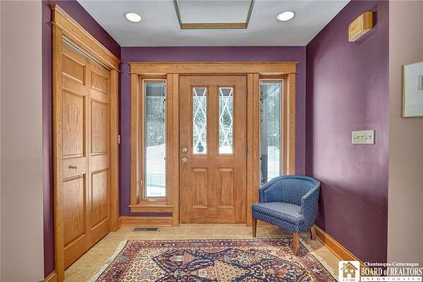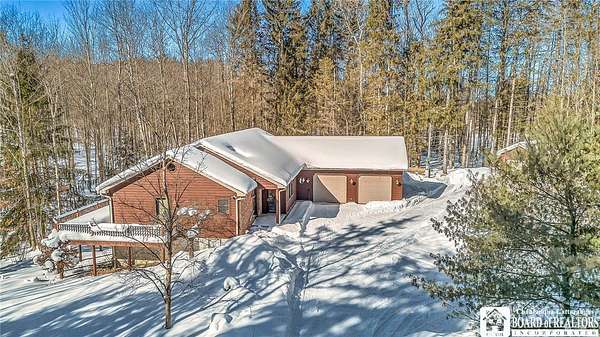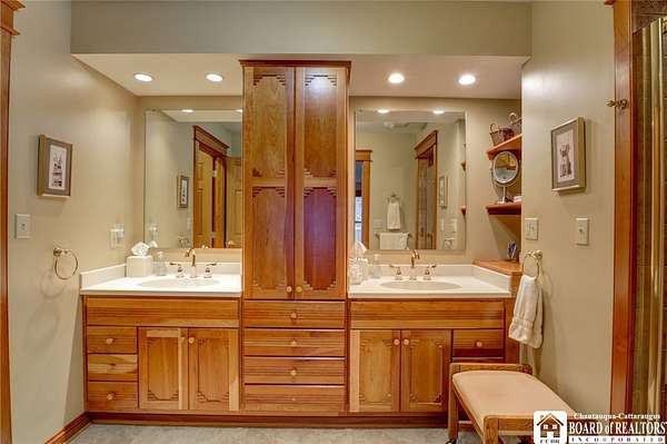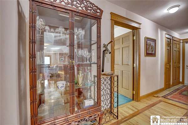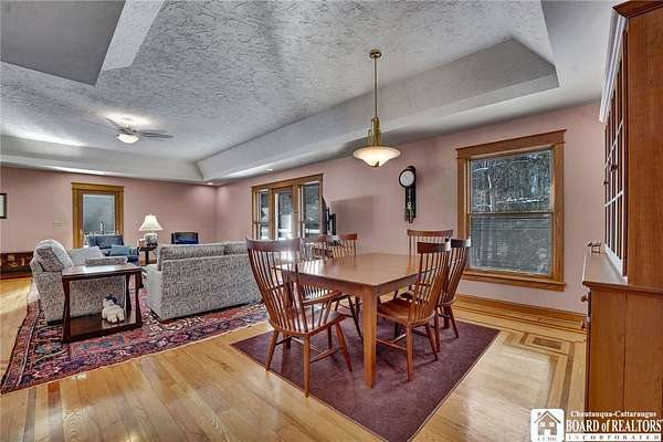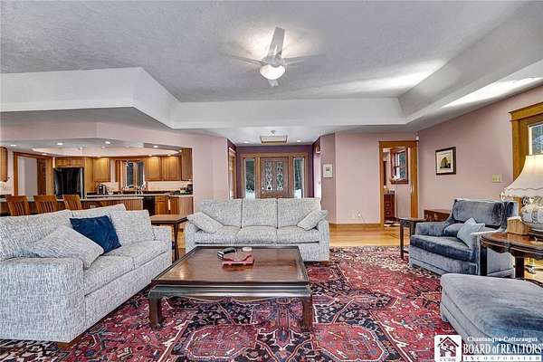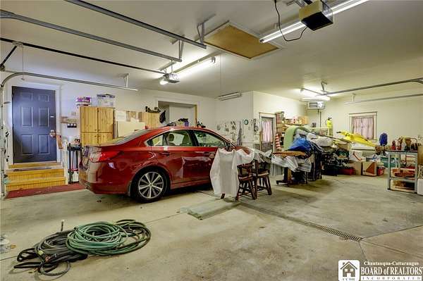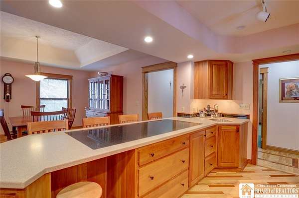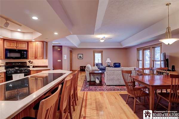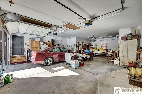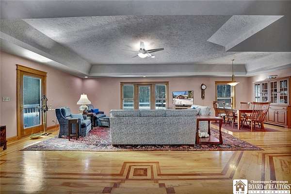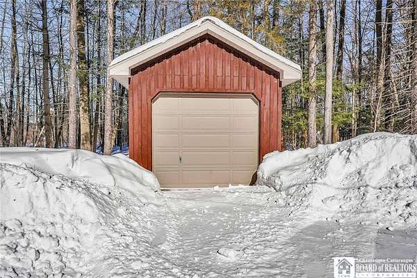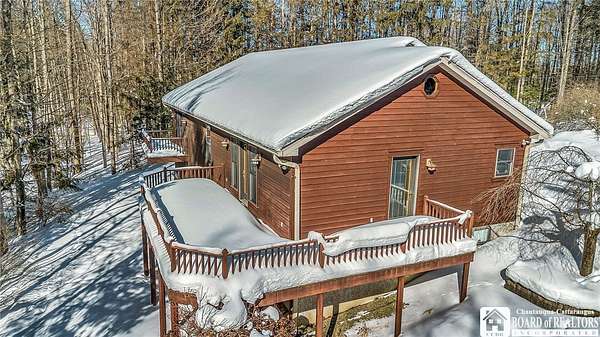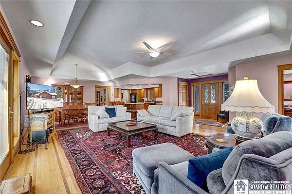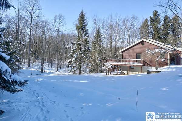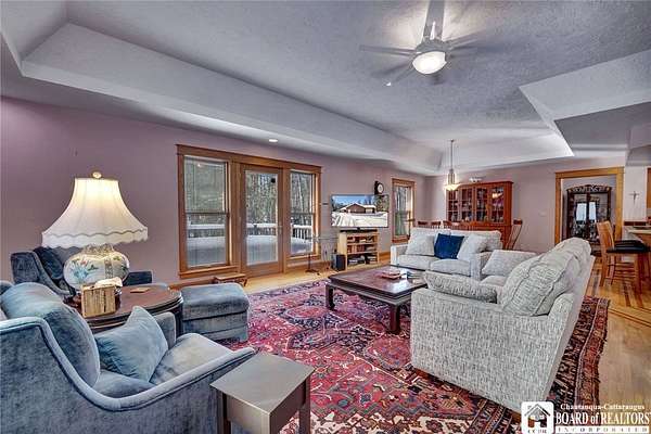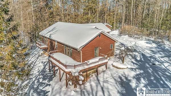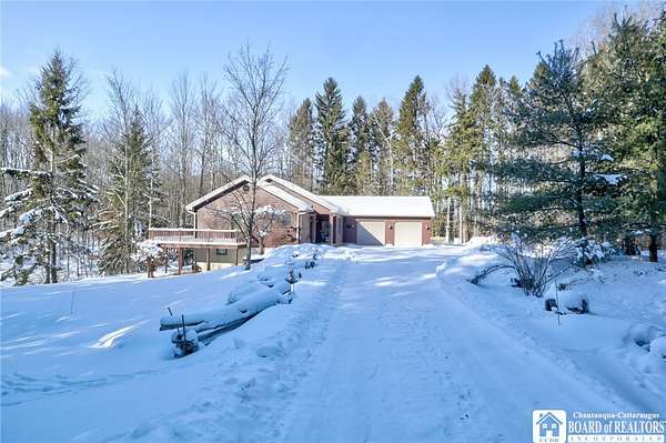 Tucked away on 3.5 serene wooded acres with a picturesque ravine, this custom-built, one-owner home offers privacy, craftsmanship, and exceptional design in the Chautauqua Lake School District. A private, tree-lined driveway leads to the residence, featuring a heated three-car garage and an additional storage shed with overhead door, perfect for equipment or hobbies. Inside, the 3,000 sq. ft. open-concept layout is filled with natural light, highlighted by soaring ceilings, expansive windows, and stunning custom wood flooring with intricate inlay designs. The heart of the home is the custom cherry kitchen, thoughtfully designed with Corian and granite countertops, high-end appliances, a bar sink, and a spacious island with seating for four-seamlessly open to the dining and family room, ideal for entertaining. The first-floor primary suite is a private retreat, featuring two walk-in closets, recessed lighting, and direct access to a private deck overlooking the wooded ravine. The oversized en suite bath boasts custom cabinetry and shelving, continuing the home's attention to detail. A bright and inviting sunroom provides another peaceful space to enjoy the surrounding nature year-round. The walkout lower level offers two additional bedrooms, including one with its own en suite bathroom, full-size windows, and direct access to a lower patio with ravine views-perfect for guests or multi-generational living. Additional highlights include a whole-house generator, multi-zone heating for efficiency and comfort, and countless upgrades throughout. Built without compromise, this exceptional property reflects quality, thoughtful design, and pride of ownership at every turn.