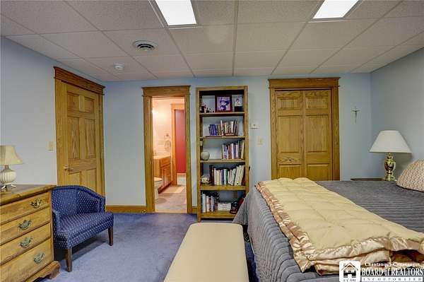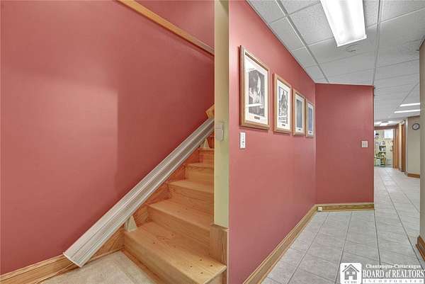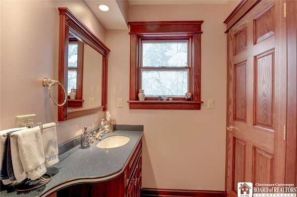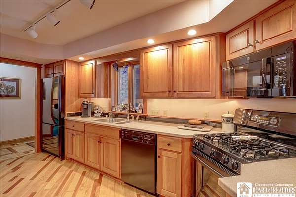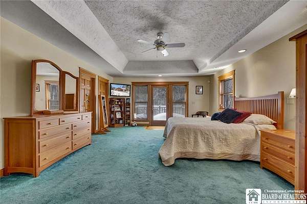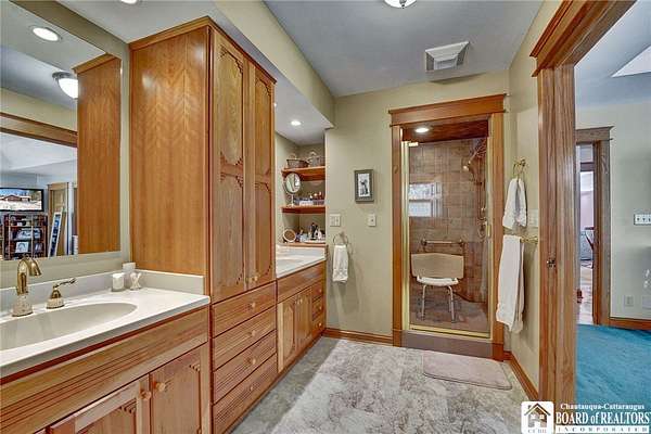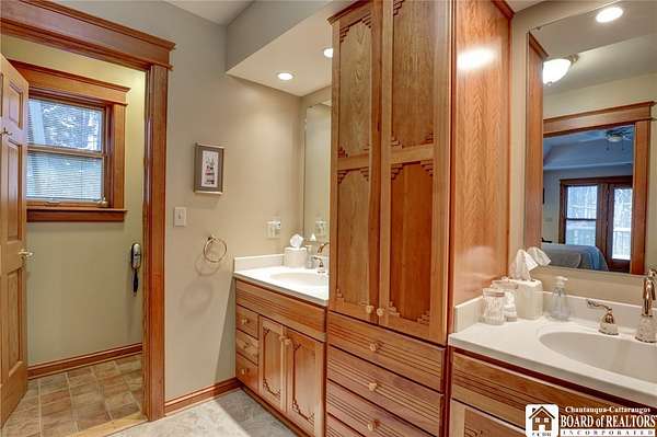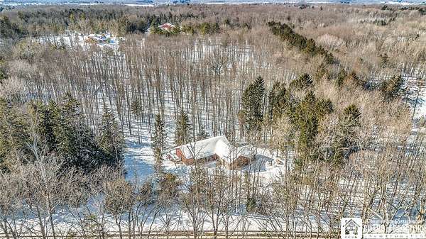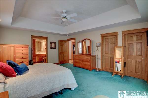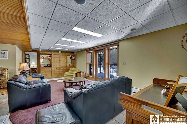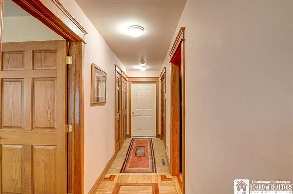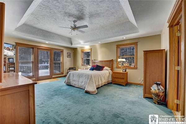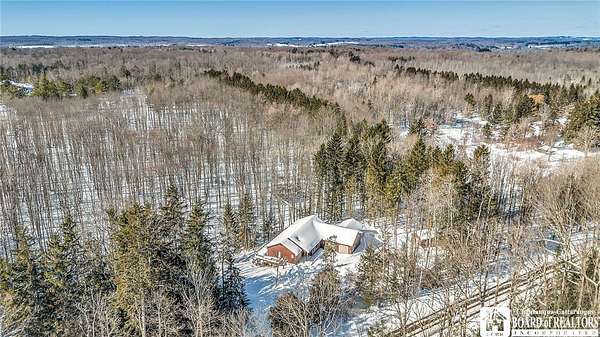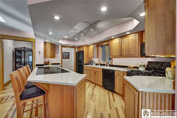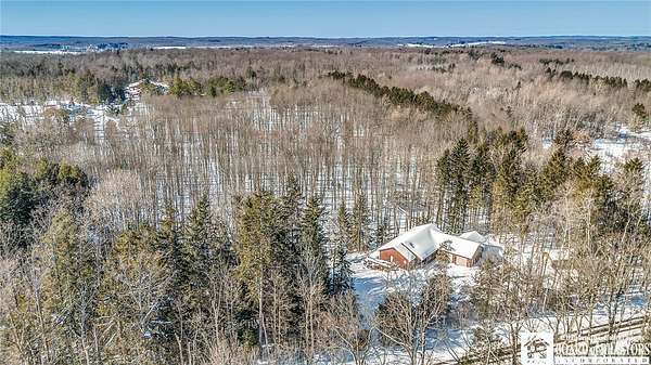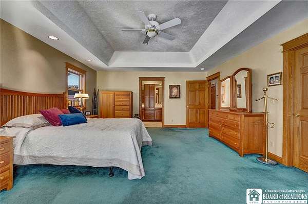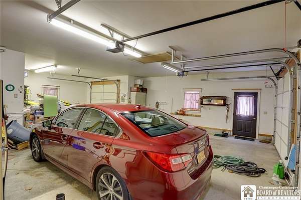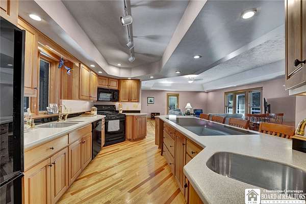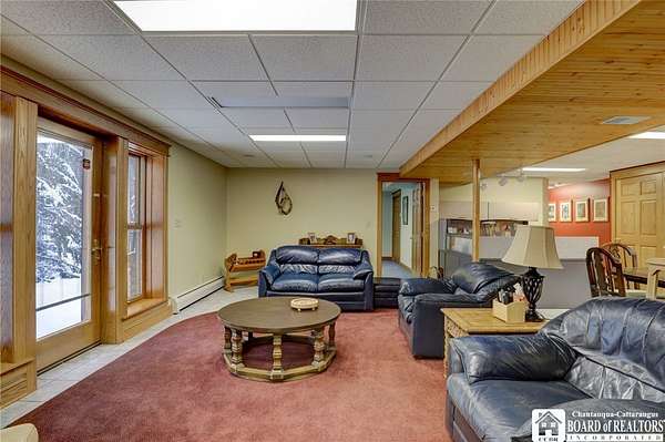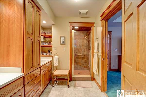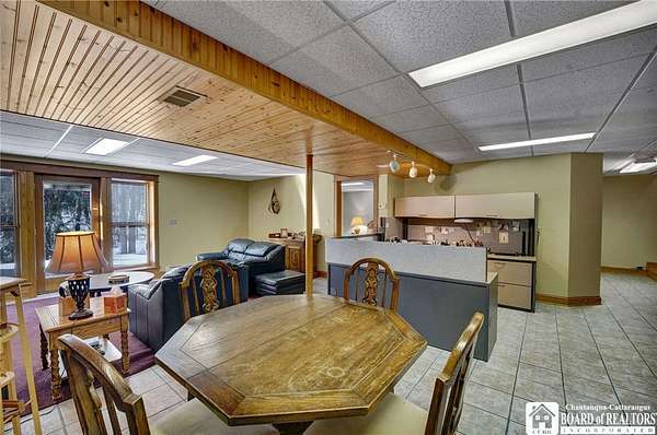 Tucked away on 3.5 serene wooded acres with a picturesque ravine, this custom-built, one-owner home offers privacy, craftsmanship, and exceptional design in the Chautauqua Lake School District. A private, tree-lined driveway leads to the residence, featuring a heated three-car garage and an additional storage shed with overhead door, perfect for equipment or hobbies. Inside, the 3,000 sq. ft. open-concept layout is filled with natural light, highlighted by soaring ceilings, expansive windows, and stunning custom wood flooring with intricate inlay designs. The heart of the home is the custom cherry kitchen, thoughtfully designed with Corian and granite countertops, high-end appliances, a bar sink, and a spacious island with seating for four-seamlessly open to the dining and family room, ideal for entertaining. The first-floor primary suite is a private retreat, featuring two walk-in closets, recessed lighting, and direct access to a private deck overlooking the wooded ravine. The oversized en suite bath boasts custom cabinetry and shelving, continuing the home's attention to detail. A bright and inviting sunroom provides another peaceful space to enjoy the surrounding nature year-round. The walkout lower level offers two additional bedrooms, including one with its own en suite bathroom, full-size windows, and direct access to a lower patio with ravine views-perfect for guests or multi-generational living. Additional highlights include a whole-house generator, multi-zone heating for efficiency and comfort, and countless upgrades throughout. Built without compromise, this exceptional property reflects quality, thoughtful design, and pride of ownership at every turn.