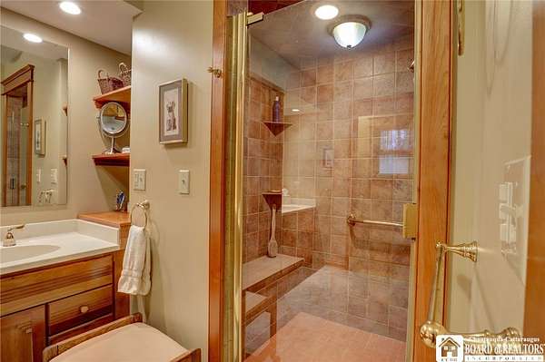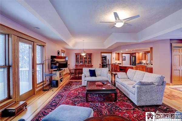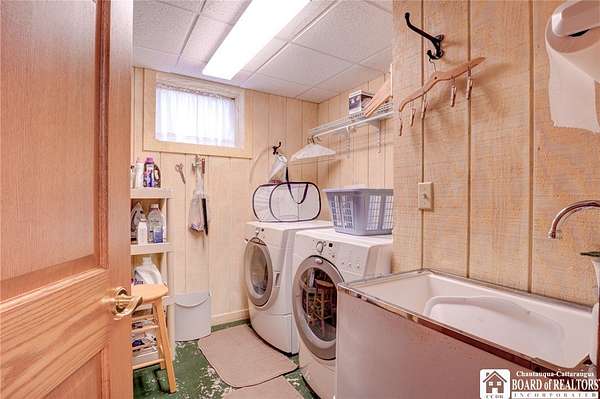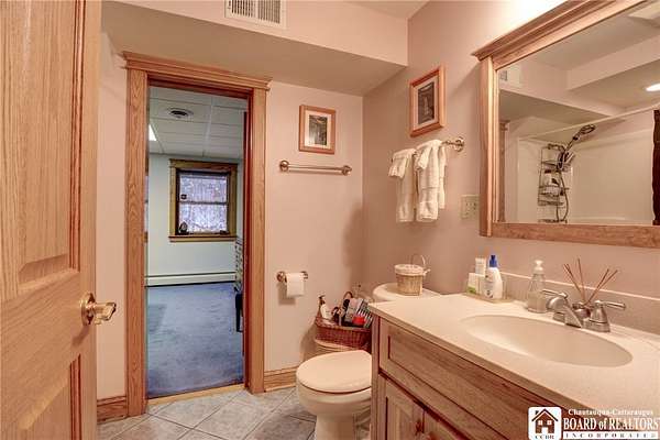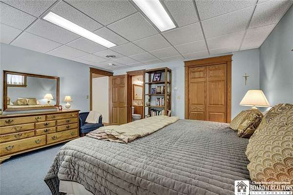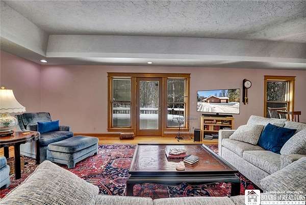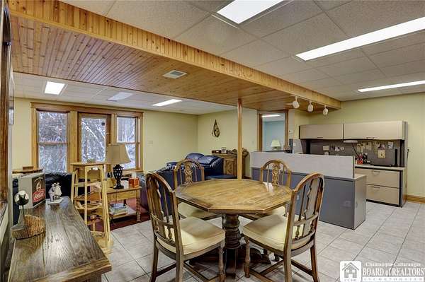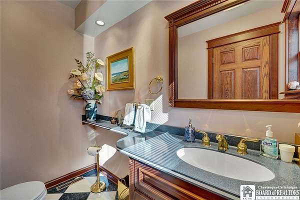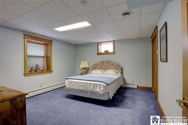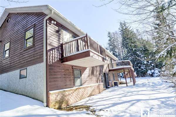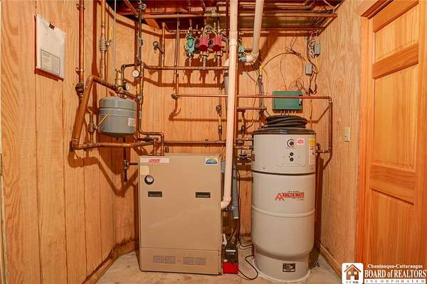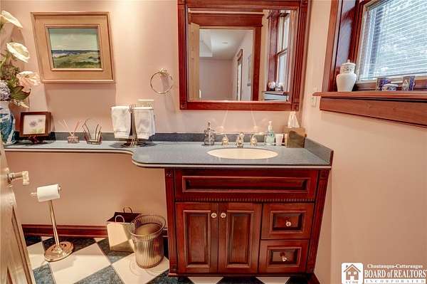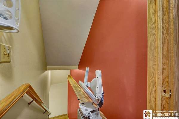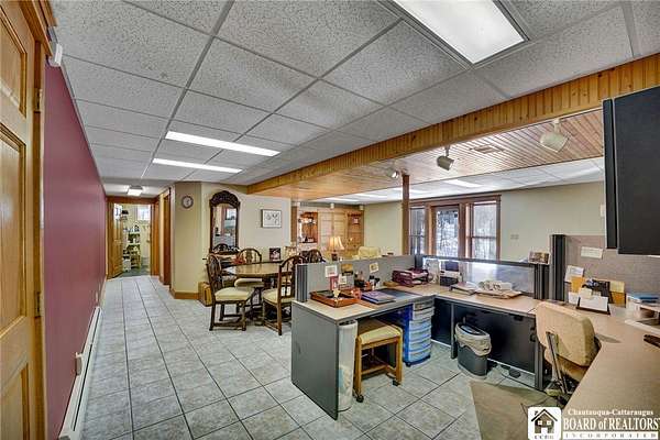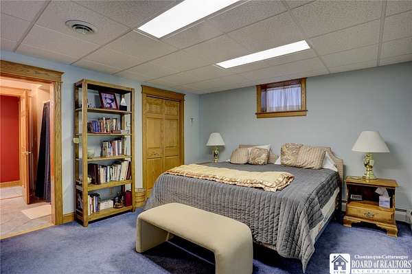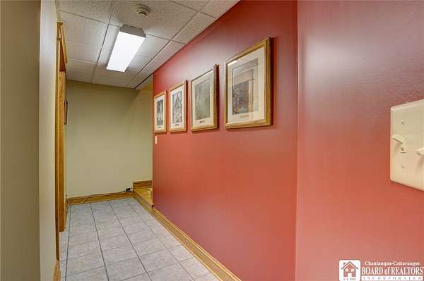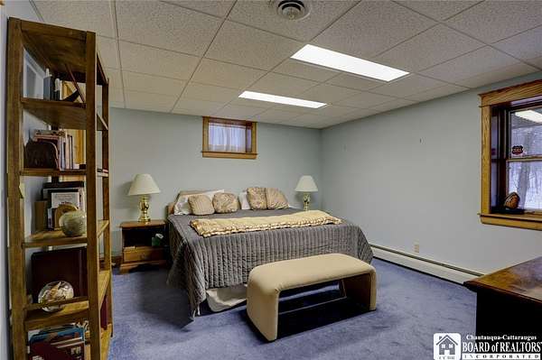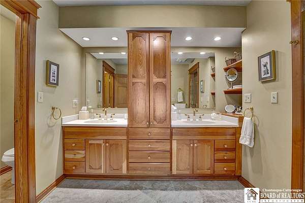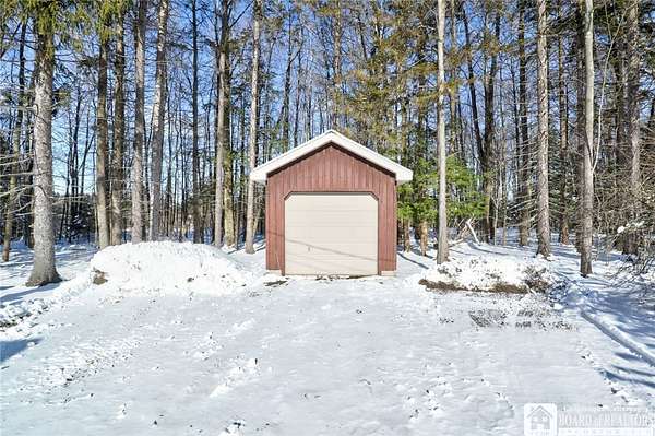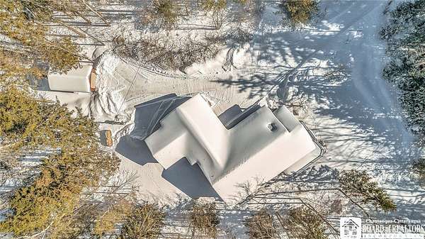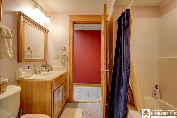 Tucked away on 3.5 serene wooded acres with a picturesque ravine, this custom-built, one-owner home offers privacy, craftsmanship, and exceptional design in the Chautauqua Lake School District. A private, tree-lined driveway leads to the residence, featuring a heated three-car garage and an additional storage shed with overhead door, perfect for equipment or hobbies. Inside, the 3,000 sq. ft. open-concept layout is filled with natural light, highlighted by soaring ceilings, expansive windows, and stunning custom wood flooring with intricate inlay designs. The heart of the home is the custom cherry kitchen, thoughtfully designed with Corian and granite countertops, high-end appliances, a bar sink, and a spacious island with seating for four-seamlessly open to the dining and family room, ideal for entertaining. The first-floor primary suite is a private retreat, featuring two walk-in closets, recessed lighting, and direct access to a private deck overlooking the wooded ravine. The oversized en suite bath boasts custom cabinetry and shelving, continuing the home's attention to detail. A bright and inviting sunroom provides another peaceful space to enjoy the surrounding nature year-round. The walkout lower level offers two additional bedrooms, including one with its own en suite bathroom, full-size windows, and direct access to a lower patio with ravine views-perfect for guests or multi-generational living. Additional highlights include a whole-house generator, multi-zone heating for efficiency and comfort, and countless upgrades throughout. Built without compromise, this exceptional property reflects quality, thoughtful design, and pride of ownership at every turn.