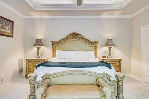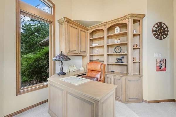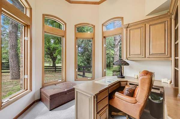 The luxurious primary suite overlooks the serene backyard and includes an extraordinary 15' x 19' dressing room, thoughtfully designed with an island, full-length mirrors, sparkling chandelier, abundant custom storage, and a comfortable sitting area. A dedicated home office with built-ins and serene views provides an inspiring space for work or study.