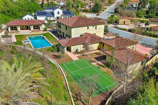 For car enthusiasts, there is a five-car garage with ample additional parking. The outdoor living is equally impressive, with an expansive backyard designed for entertaining, a large pool, a spa/jacuzzi, and a sports court. The serene hillside surroundings provide a tranquil and private retreat.