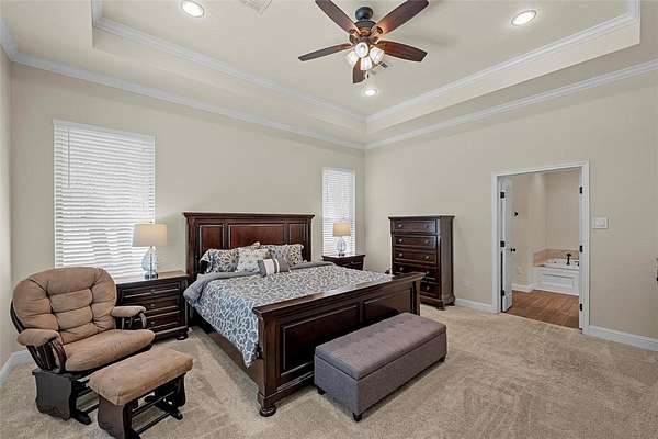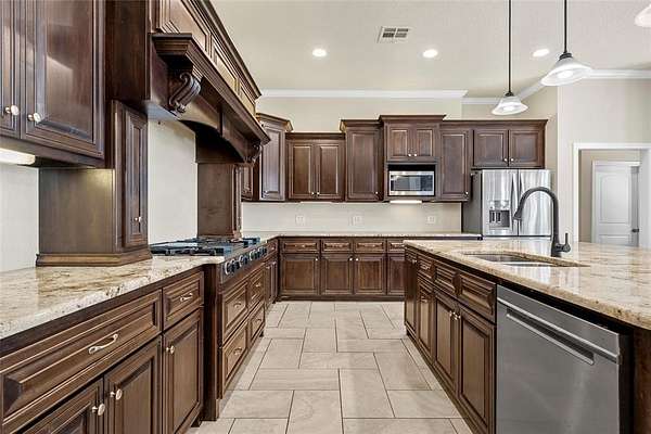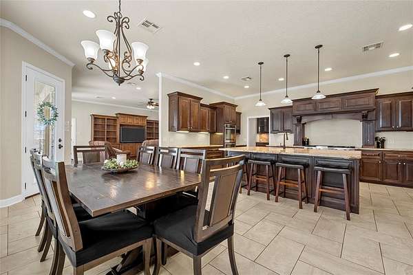 - Chandelier, Decorative Lighting, Double Vanity, Granite Counters, Kitchen Island, Natural Woodwork, Pantry, Walk-In Closet(s)