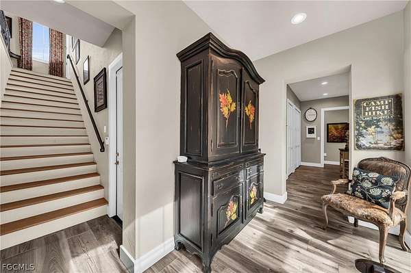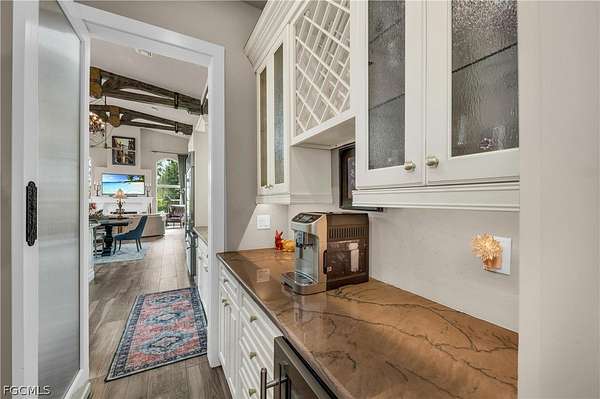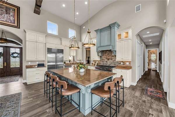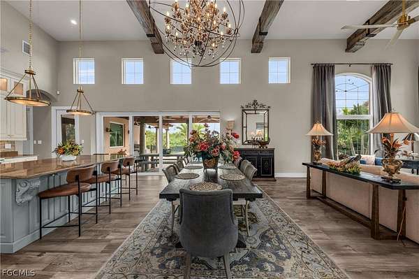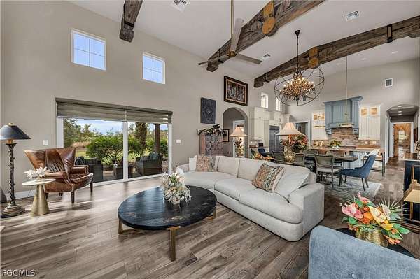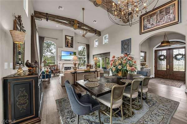 Tucked away within the deed-restricted, secluded enclave of Herons Cove, this exceptional estate offers refined waterfront living amid 4.13 acres of pristine native landscaping. Encompassing 4,976 square feet, the residence is thoughtfully designed to balance luxury, privacy, and functionality, with four bedrooms and three bathrooms crafted to the highest standards. A private boat dock with a 10,000-lb electric boat lift and canopy provides effortless access from the Peace River to Charlotte Harbor, while the meticulously maintained grounds feature a full irrigation system and landscape lighting, creating a serene ambiance day and night. Peace of mind is ensured with a whole-home generator supported by a 500-gallon underground gas tank, hurricane impact windows and sliding glass doors, and an electric hurricane shutter protecting the double front entry featuring gas lantern lighting. The exterior is complemented by a paver driveway leading to a three-car garage with tile and metal roof. The third garage bay includes air-conditioned holiday storage and an additional climate-controlled room, ideal for specialty storage or flexible use. At the heart of the home, the gourmet kitchen is a chef's dream, featuring a Wolf six-burner gas range, double ovens, a Wolf built-in microwave, and an extra-large Sub-Zero refrigerator. An expansive granite center island with prep sink and abundant under-counter cabinetry anchors the space, while a large pantry offers shelving, custom cabinets, a wine refrigerator, and a built-in wine rack. Adjacent living areas are warmed by a gas fireplace, creating an inviting atmosphere for both everyday living and entertaining. The private owner's suite on the main floor is a true retreat, offering separate his-and-hers custom walk-in closets and a designer master bath with a spacious walk-in shower, separate soaking tub, and dual custom vanities. Throughout the home, custom draperies and wood louver blinds add a timeless elegance. Outdoors, a custom saltwater pool completes this remarkable estate, providing a resort-style setting surrounded by natural beauty. This rare Herons Cove property delivers exceptional craftsmanship, thoughtful amenities, and unparalleled privacy-an extraordinary opportunity to experience elevated waterfront living.
