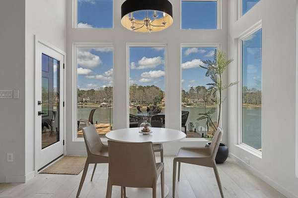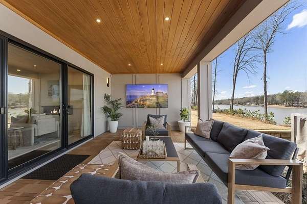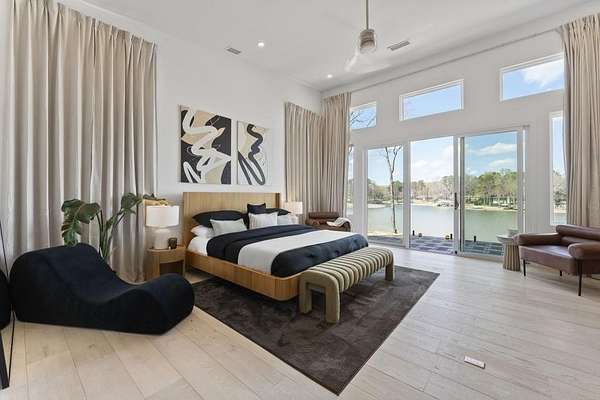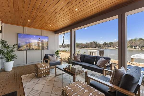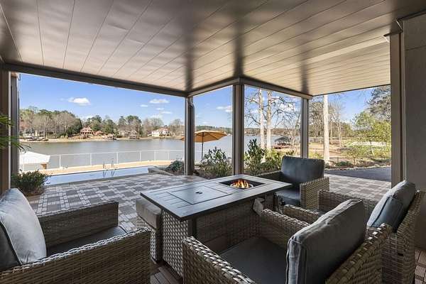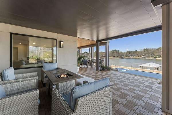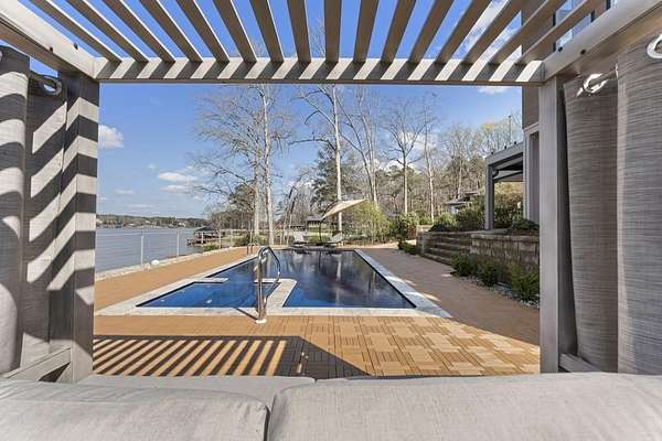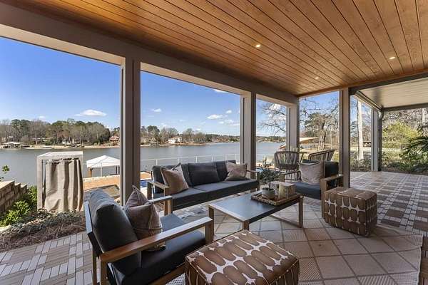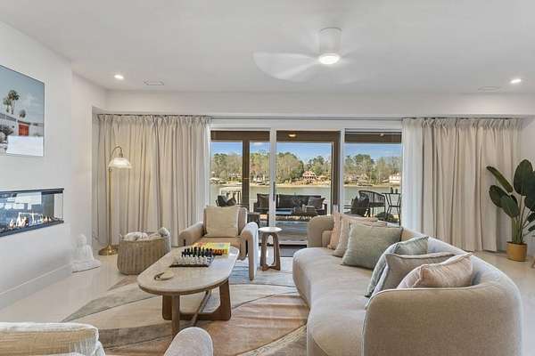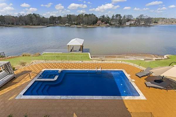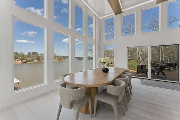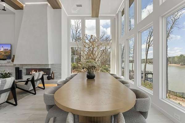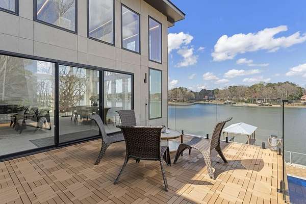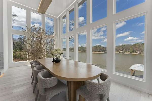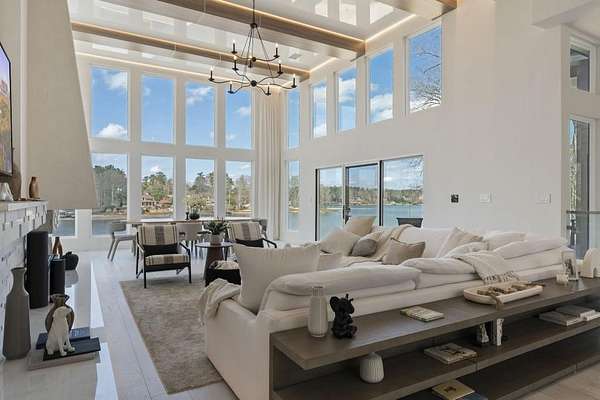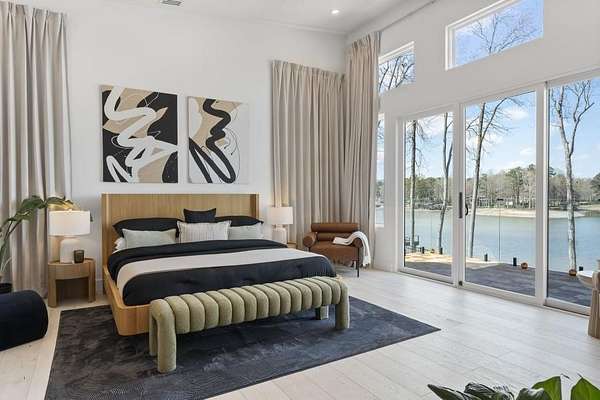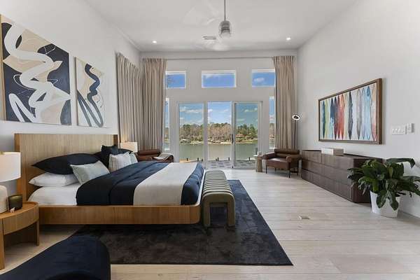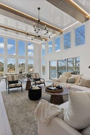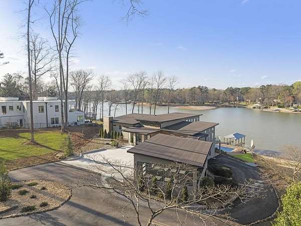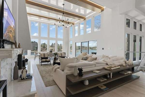 Mornings begin with still water and soft light stretching across 600 acres of Lake Spivey Georgia's largest private lake. Tucked along 175 feet of prime shoreline on 1.52 acres, this architectural modern estate was designed to frame the view, the light, and the experience of true waterfront living. Offering 5 bedrooms, 4 full baths, and 1 half bath with the primary suite on the main this residence balances contemporary architecture, natural textures, and resort-style amenities. Located just 15 minutes from Hartsfield-Jackson International Airport and under 30 minutes to Downtown Atlanta and Woodward Academy, it delivers the rare combination of secluded lakefront serenity and everyday accessibility. A gated drive winds toward the residence, revealing Brazilian wood ceilings and a private courtyard that introduce the home's refined craftsmanship. Inside, soaring 20-foot ceilings, sleek high-gloss stretch ceilings illuminated with integrated LED lighting, and custom 18-inch wooden beams create dramatic scale. A 15-foot Venetian plaster fireplace wrapped in marble anchors the great room, while a striking 10-foot imported Banyan tree root from Indonesia adds an organic sculptural focal point. The chef's kitchen blends artistry and function with matte aqua-guard cabinetry imported from Spain, double ovens, induction cooktop, and an impressive 11-foot quartzite waterfall island with matching backsplash. A hidden walk-in pantry with secondary washer and dryer enhances everyday convenience. The main-level primary suite offers privacy and elegance, featuring custom Italian wallpaper, 8-foot European doors, and access to a private glass-enclosed balcony overlooking the lake. The spa-inspired bath is a retreat of its own with dual floating vanities, marble counters, freestanding ribbed soaking tub, and a floor-to-ceiling Mother of Pearl mosaic shower illuminated by LED tray lighting. A sleek glass staircase leads to the fully finished lower level designed for both entertaining and extended stays. Here you'll find a marble-topped bar, modern glass fireplace, plush theater room wired for screenings, multiple bedrooms including a poolside en-suite with private den, shared porcelain-tiled bath, second laundry room, and seamless access to the outdoor living spaces. Outside, a newly installed 32-foot saltwater pool and spa overlook the lake, complemented by a brand-new boathouse with two slips and a rare grandfathered-in private boat ramp for direct access to the water. An exceptional modern offering on Lake Spivey where design, water, and lifestyle meet.