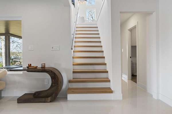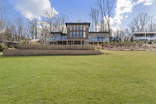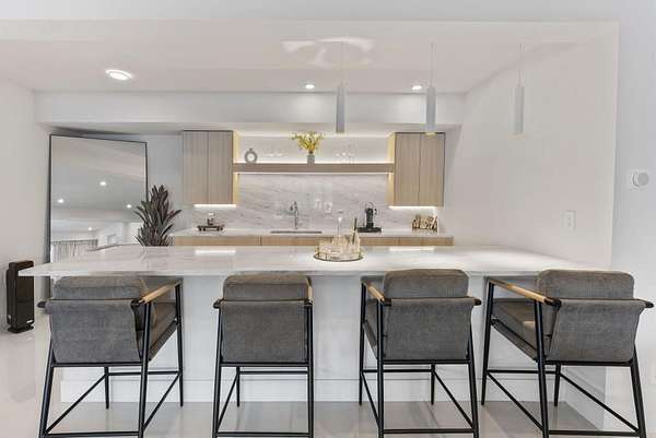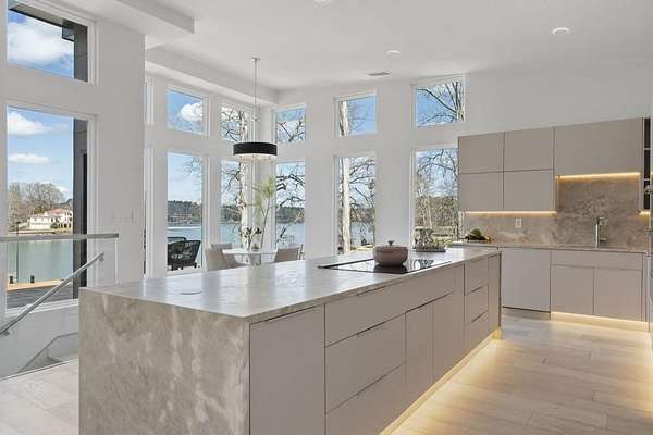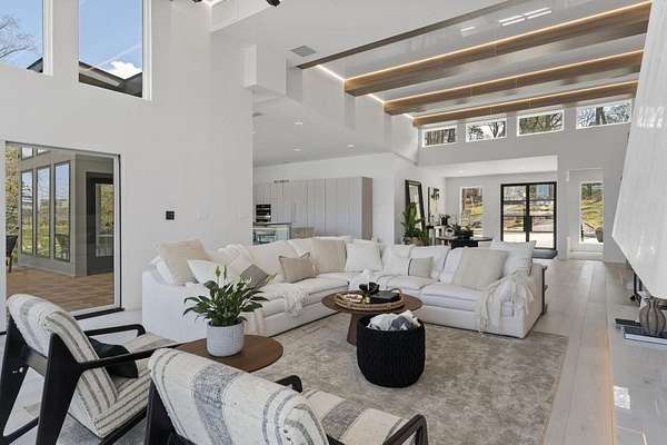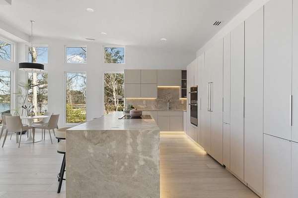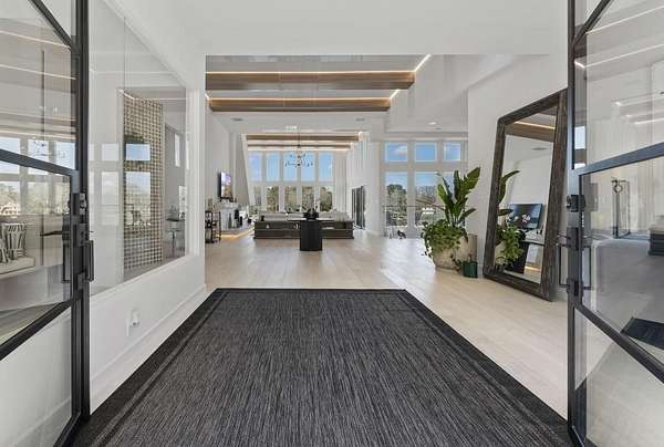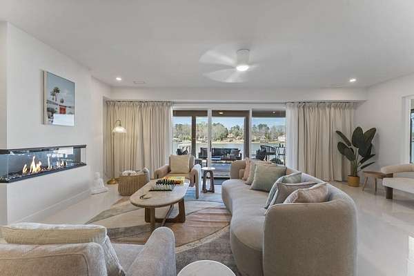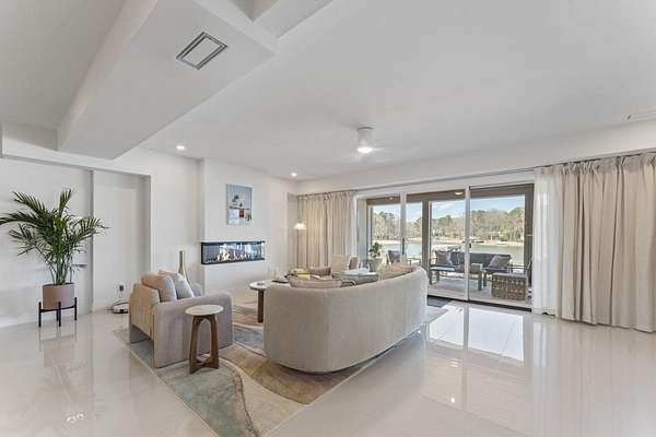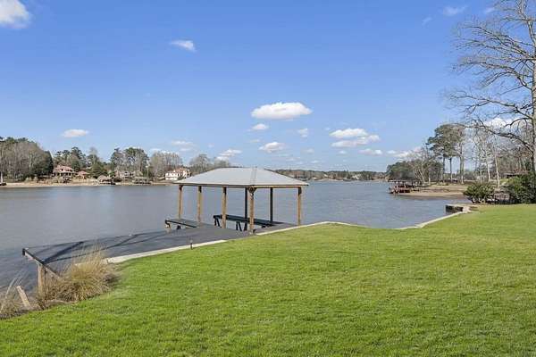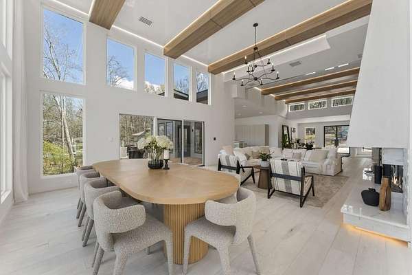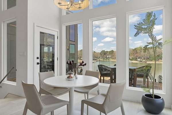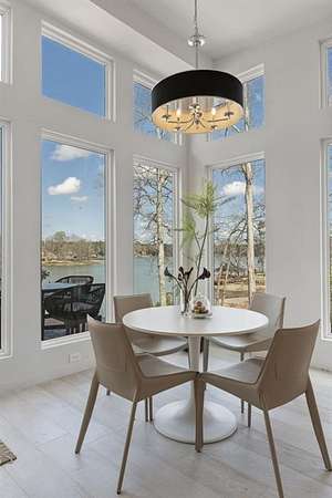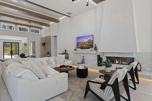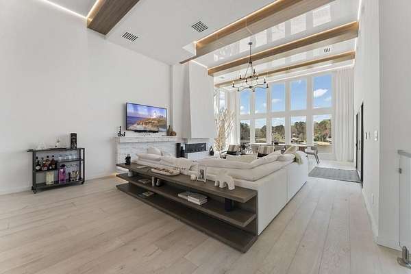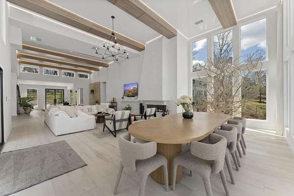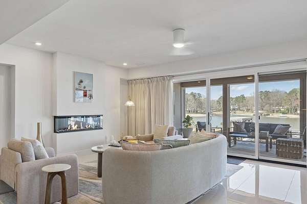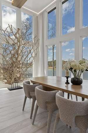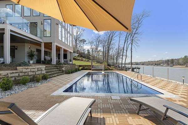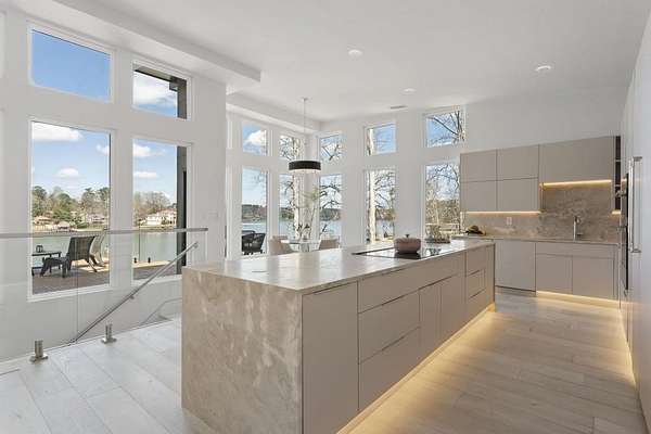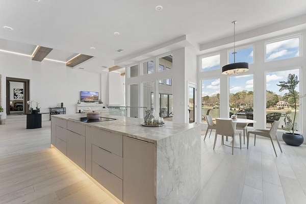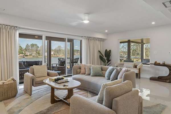 Mornings begin with still water and soft light stretching across 600 acres of Lake Spivey Georgia's largest private lake. Tucked along 175 feet of prime shoreline on 1.52 acres, this architectural modern estate was designed to frame the view, the light, and the experience of true waterfront living. Offering 5 bedrooms, 4 full baths, and 1 half bath with the primary suite on the main this residence balances contemporary architecture, natural textures, and resort-style amenities. Located just 15 minutes from Hartsfield-Jackson International Airport and under 30 minutes to Downtown Atlanta and Woodward Academy, it delivers the rare combination of secluded lakefront serenity and everyday accessibility. A gated drive winds toward the residence, revealing Brazilian wood ceilings and a private courtyard that introduce the home's refined craftsmanship. Inside, soaring 20-foot ceilings, sleek high-gloss stretch ceilings illuminated with integrated LED lighting, and custom 18-inch wooden beams create dramatic scale. A 15-foot Venetian plaster fireplace wrapped in marble anchors the great room, while a striking 10-foot imported Banyan tree root from Indonesia adds an organic sculptural focal point. The chef's kitchen blends artistry and function with matte aqua-guard cabinetry imported from Spain, double ovens, induction cooktop, and an impressive 11-foot quartzite waterfall island with matching backsplash. A hidden walk-in pantry with secondary washer and dryer enhances everyday convenience. The main-level primary suite offers privacy and elegance, featuring custom Italian wallpaper, 8-foot European doors, and access to a private glass-enclosed balcony overlooking the lake. The spa-inspired bath is a retreat of its own with dual floating vanities, marble counters, freestanding ribbed soaking tub, and a floor-to-ceiling Mother of Pearl mosaic shower illuminated by LED tray lighting. A sleek glass staircase leads to the fully finished lower level designed for both entertaining and extended stays. Here you'll find a marble-topped bar, modern glass fireplace, plush theater room wired for screenings, multiple bedrooms including a poolside en-suite with private den, shared porcelain-tiled bath, second laundry room, and seamless access to the outdoor living spaces. Outside, a newly installed 32-foot saltwater pool and spa overlook the lake, complemented by a brand-new boathouse with two slips and a rare grandfathered-in private boat ramp for direct access to the water. An exceptional modern offering on Lake Spivey where design, water, and lifestyle meet.