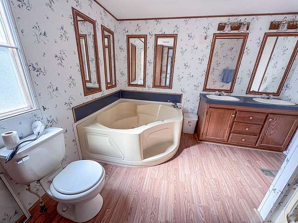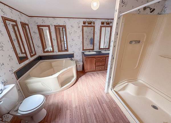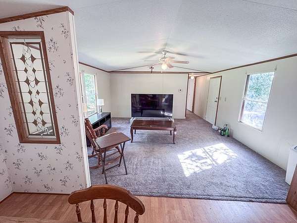 Est $603/mo2 Bedroom 2 Bath Singlewide mobile home on 3.82 Acres! Split level floorplan with open concept living/dining/kitchen. Large Primary bedroom w en-suite bath & walk-in closet. Bathroom has built-in cabinet, corner soaking tub and shower. Hall bath w/ tub/shower combo. Spacious covered front porch. Shared driveway with Plenty of additional road frontage on ACR 155. Central Air/heat. Large back patio. Elkhart School district. Thousands of pine trees were planted approx 9 years ago on the property! Advance Appt neeeded for showings please!
